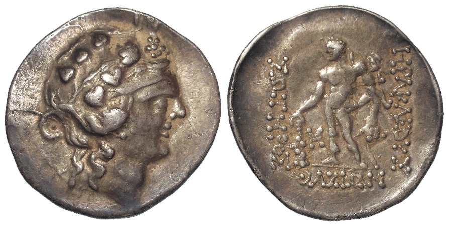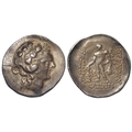 Ancient Greek: Islands off Thrace, Thasos (or Danubian Celtic imitation) silver Tetradrachm c.90-75 BC. Wreathed head of young Dionysos right. / Herakles standing facing, head left, holding club, lion skin draped over left arm; monogram to inner left. 16.64g. VF.