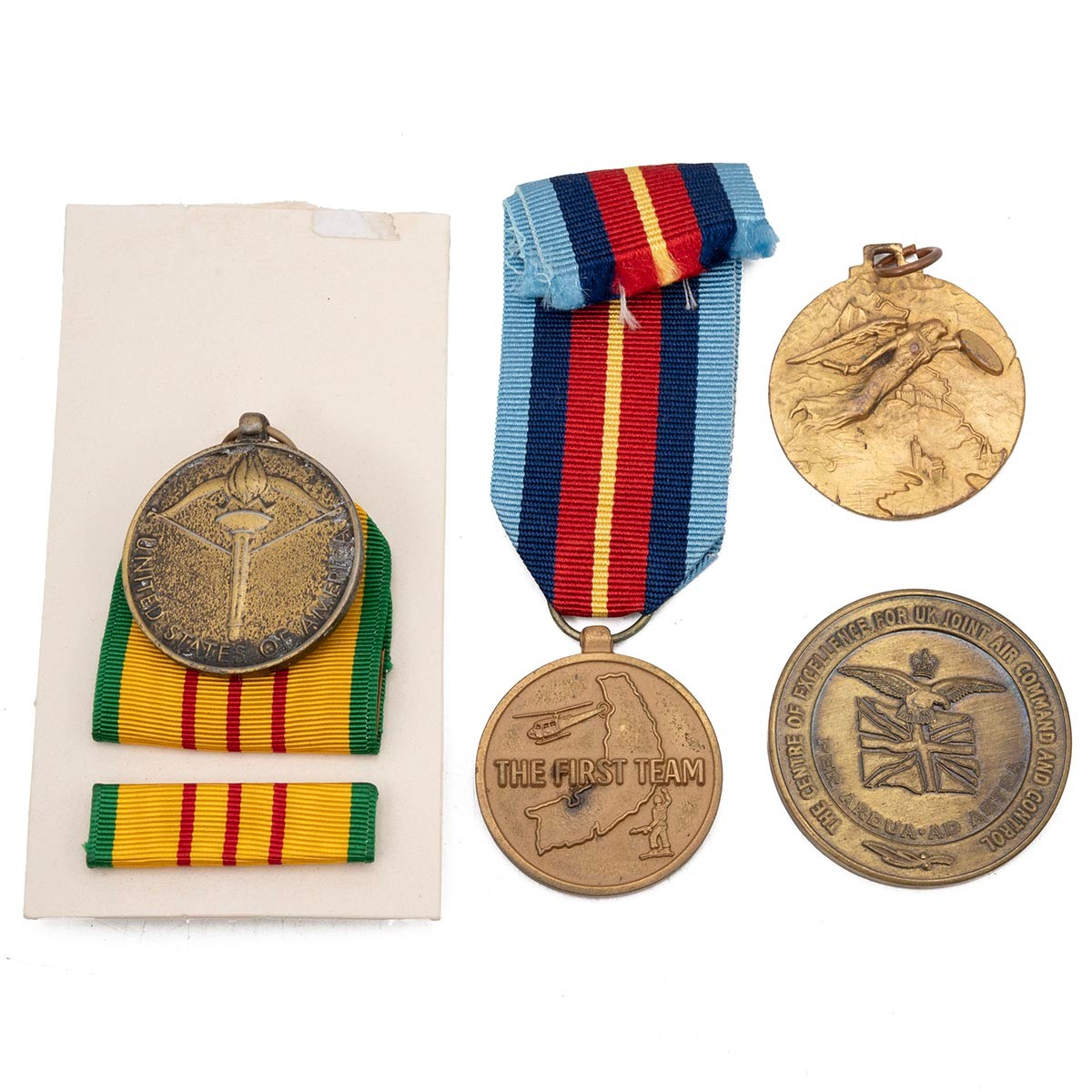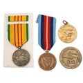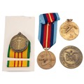 A collection of three United States Vietnam War medals, to include the 1st Air Cavalry Division 'First Team' medal, the 2nd Army medal, and the Republic of Vietnam service medal, along with the Joint Air Component Headquarters medallion.