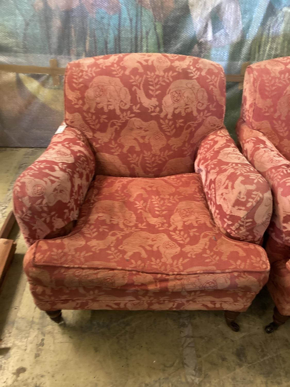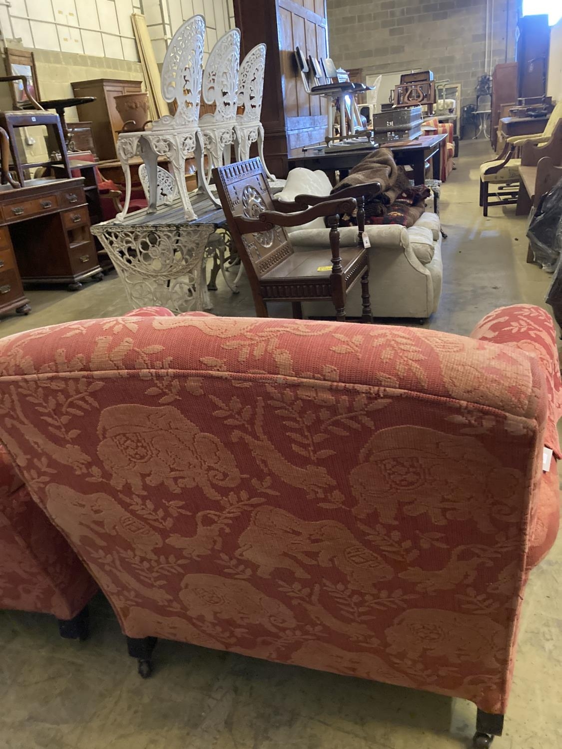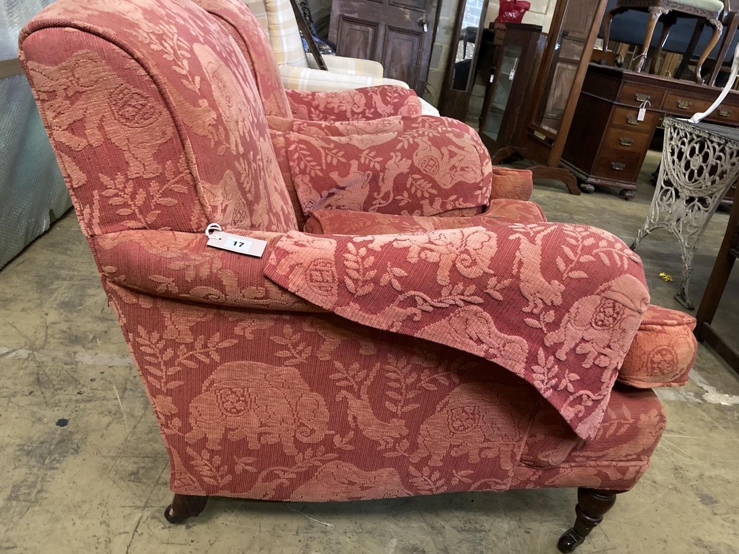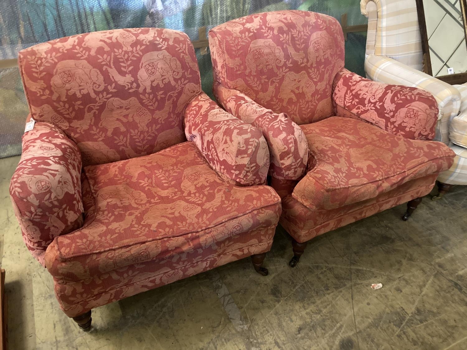 A pair of late Victorian style upholstered lounge armchairs, width 88cm, depth 98cm, height 83cm