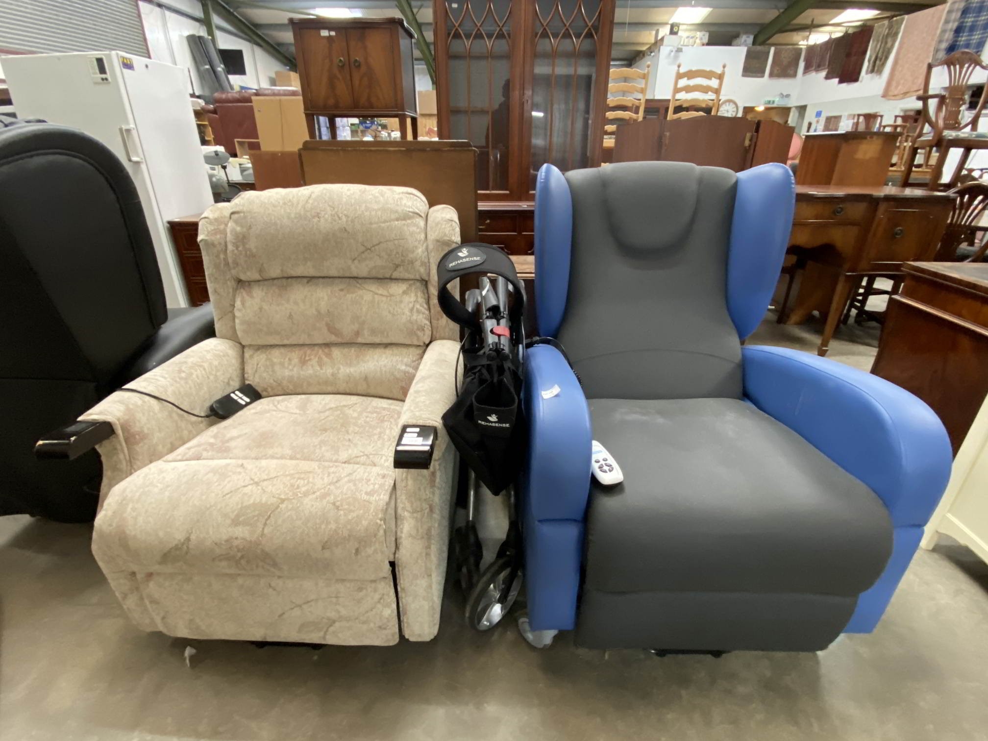 Rise & recline electric lounge chair 102H 83W, a Rehasense walking aid & Aidapt rise and recline electric chair 108H x 79W