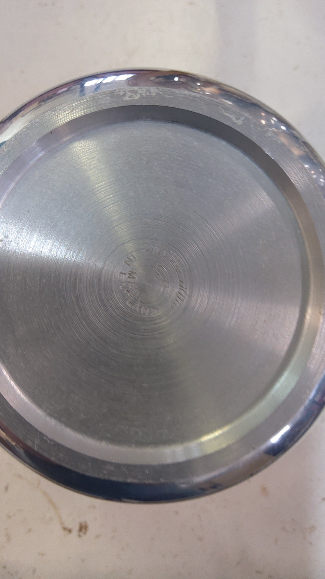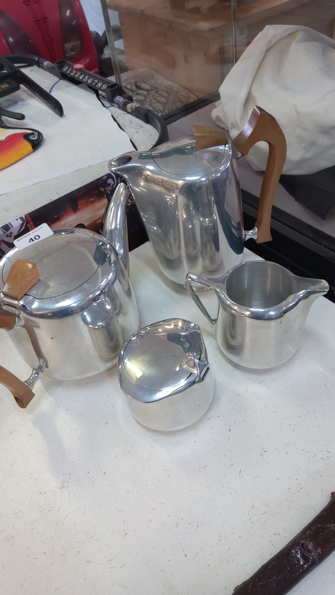 Mid-20th century aluminium four-piece tea and coffee service, comprising a coffee pot, teapot, milk jug, and lidded sugar bowl, each with teak-stained handle and finial