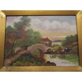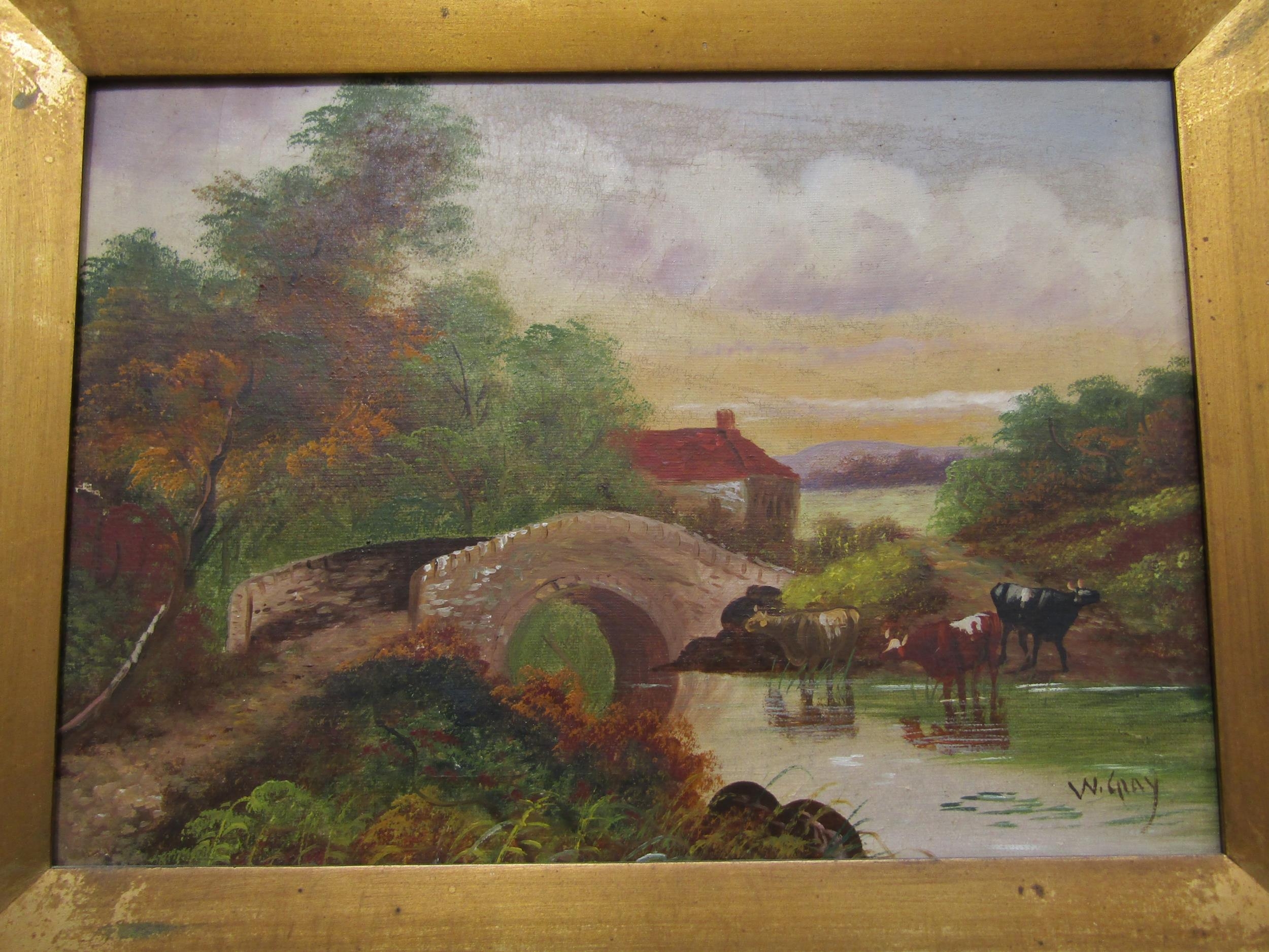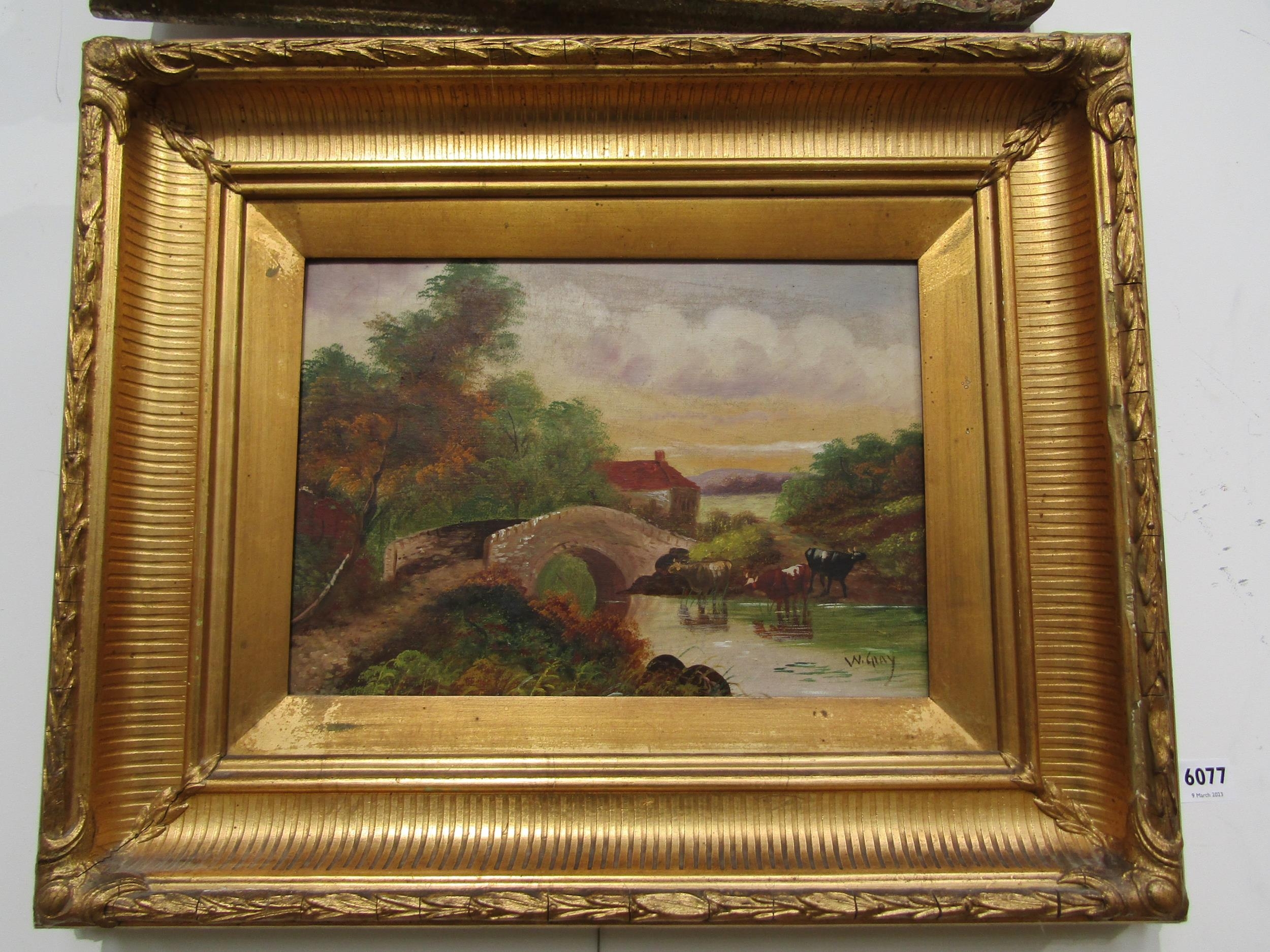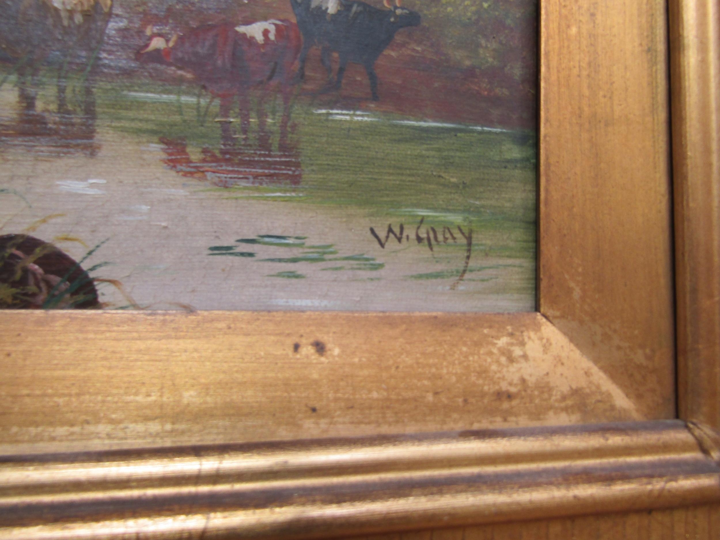 W.GRAY- A 19th Century oil on canvas rural scene with cattle in river, gilt framed, 24cm x 34cm