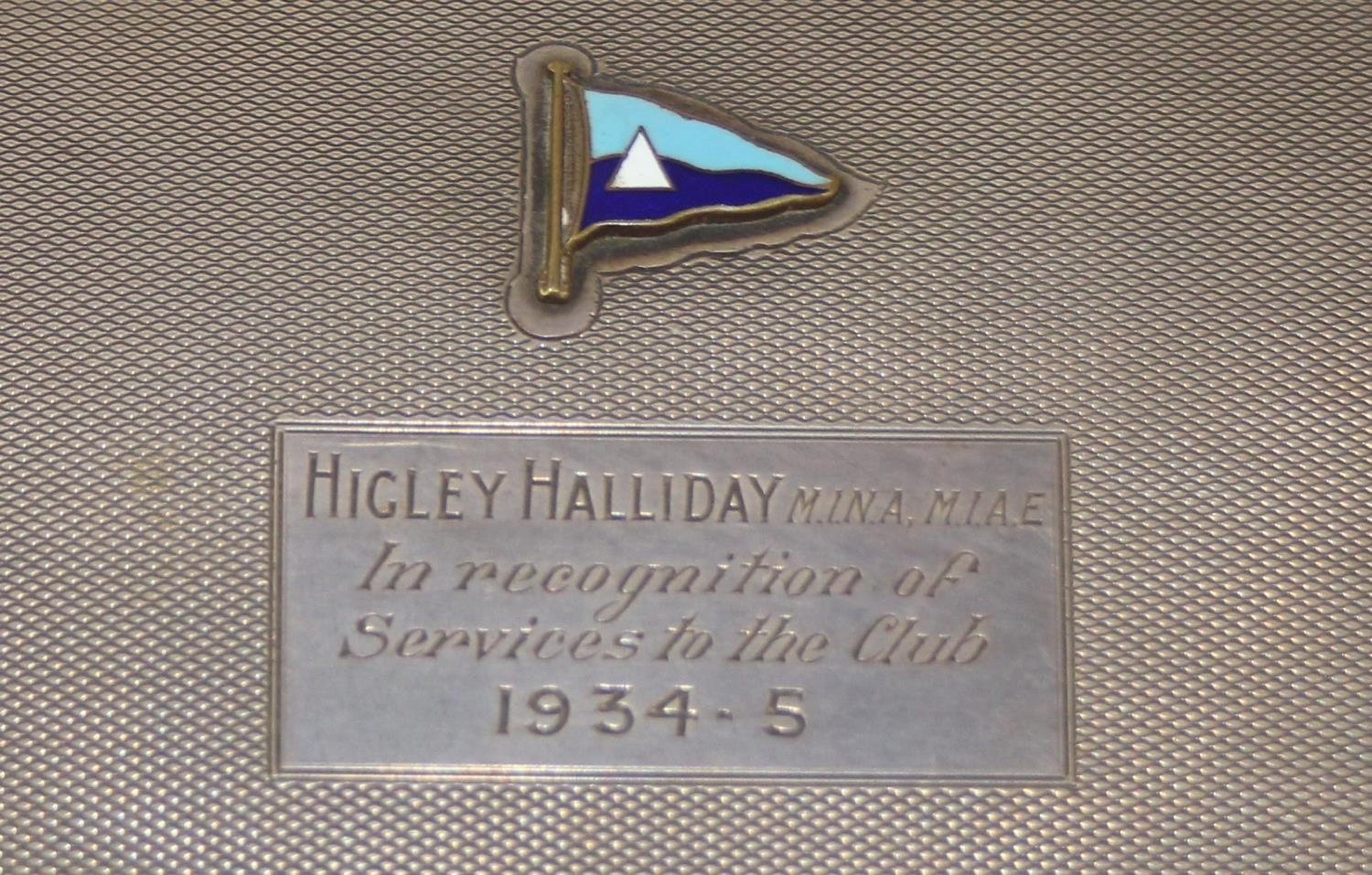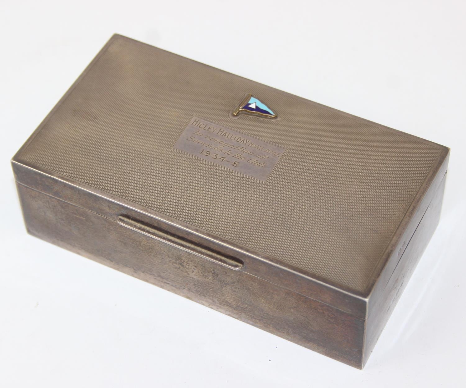 [395.15g] - an Art Deco period silver cigarette or cigar box, marked for Birmingham 1934 by H J Cooper & Co Ltd, the top with applied enamel pennant relating to The Little Ship Club of London, presented to Higley Halliday in 1935, one of the more notable founder members of the club, 16.5cm wide