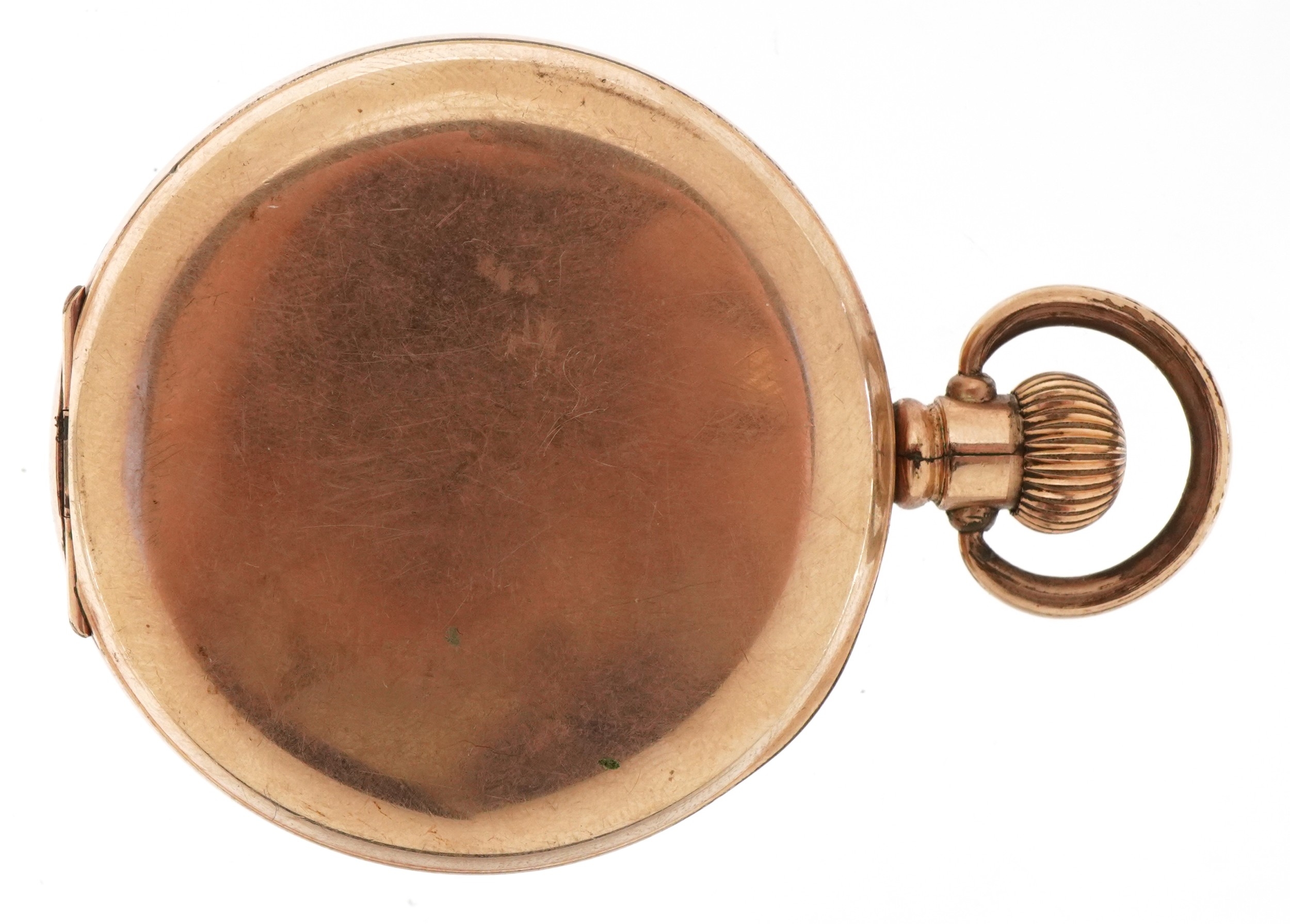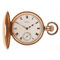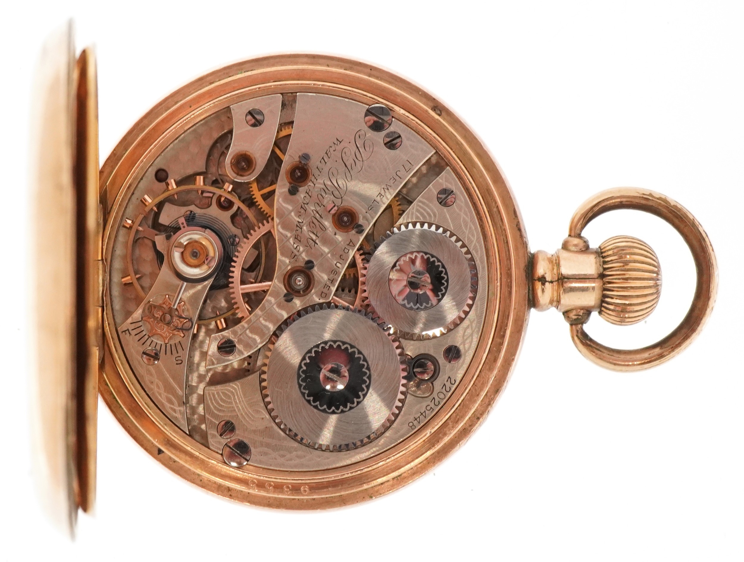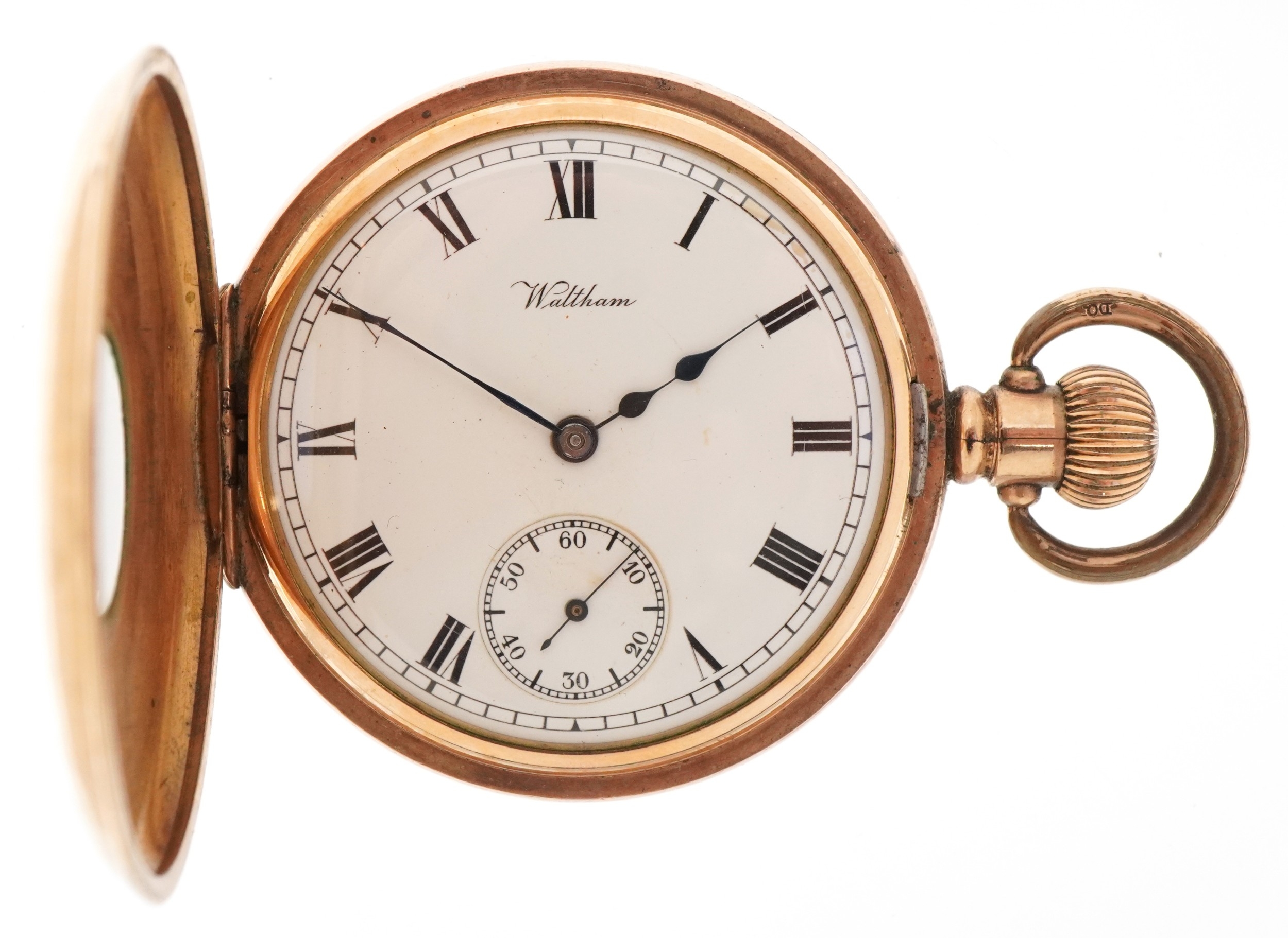 Waltham, a gentlemen's gold plated half hunter top wind pocket watch having enamelled dial with Roman numerals, the movement numbered 22025448, 50mm in diameter.