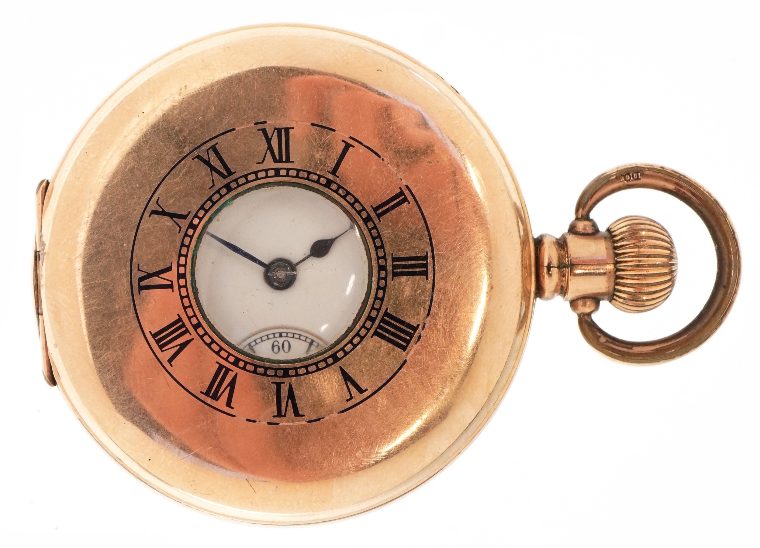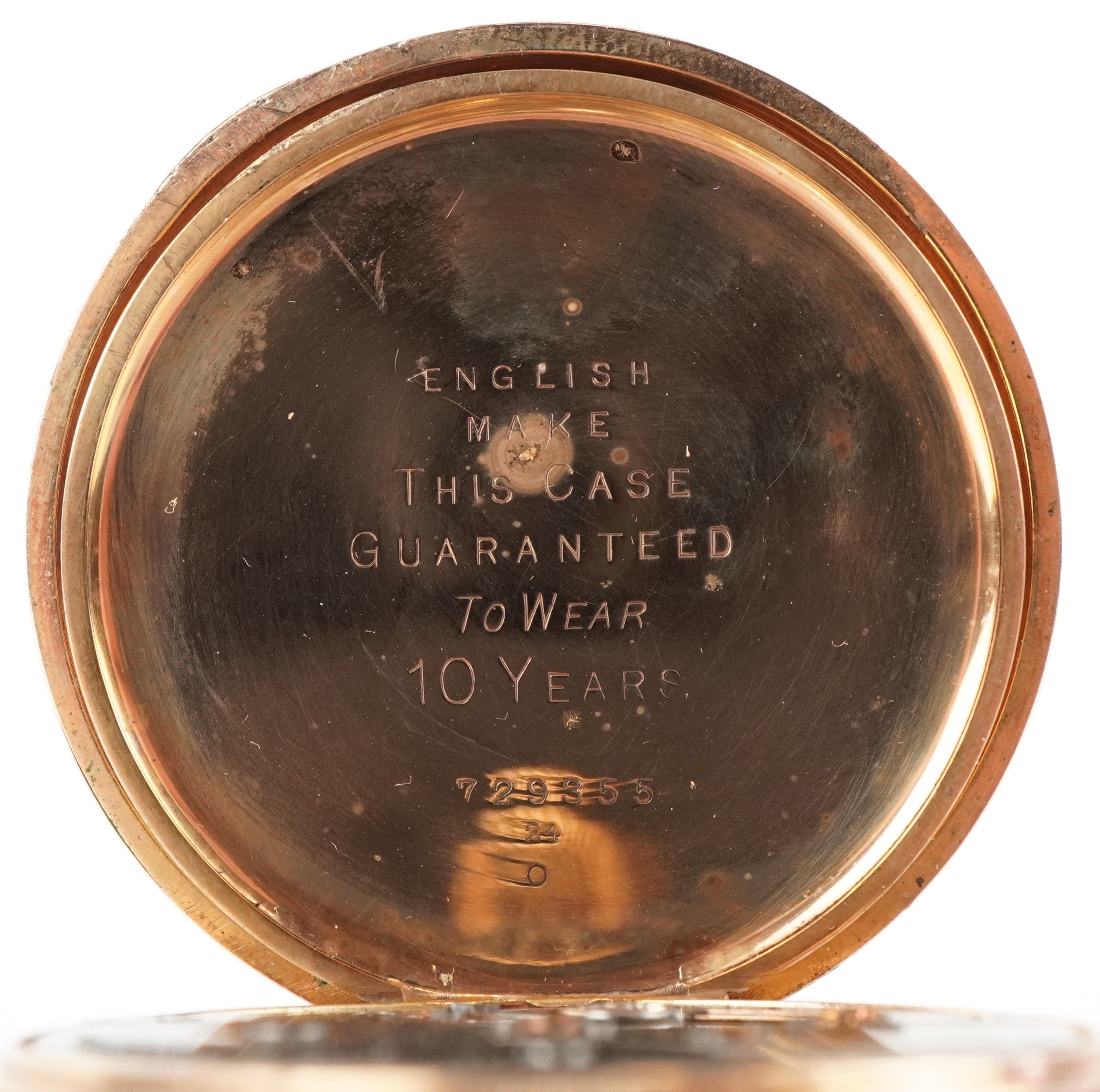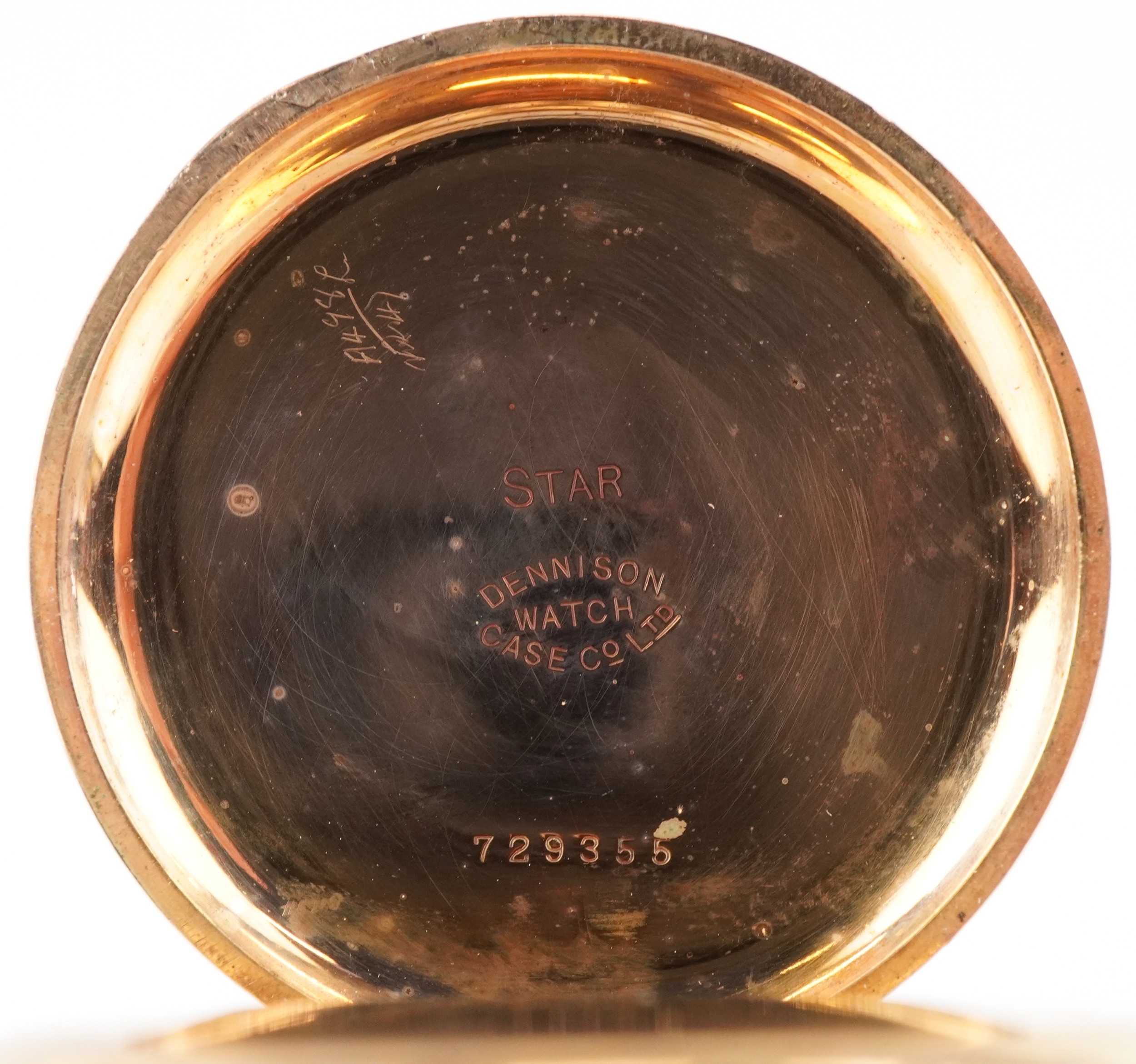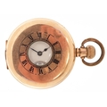 Waltham, a gentlemen's gold plated half hunter top wind pocket watch having enamelled dial with Roman numerals, the movement numbered 22025448, 50mm in diameter.