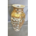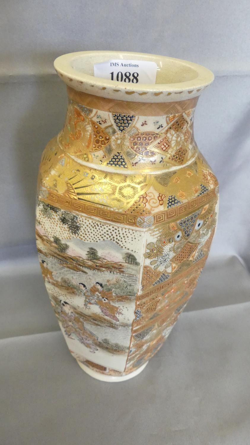 Japanese Meiji Period Hexagonal Baluster Shaped Satsuma Pottery Vase, painted with panels of figures in landscape on densely decorated gilded ground.