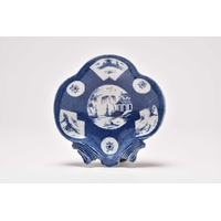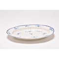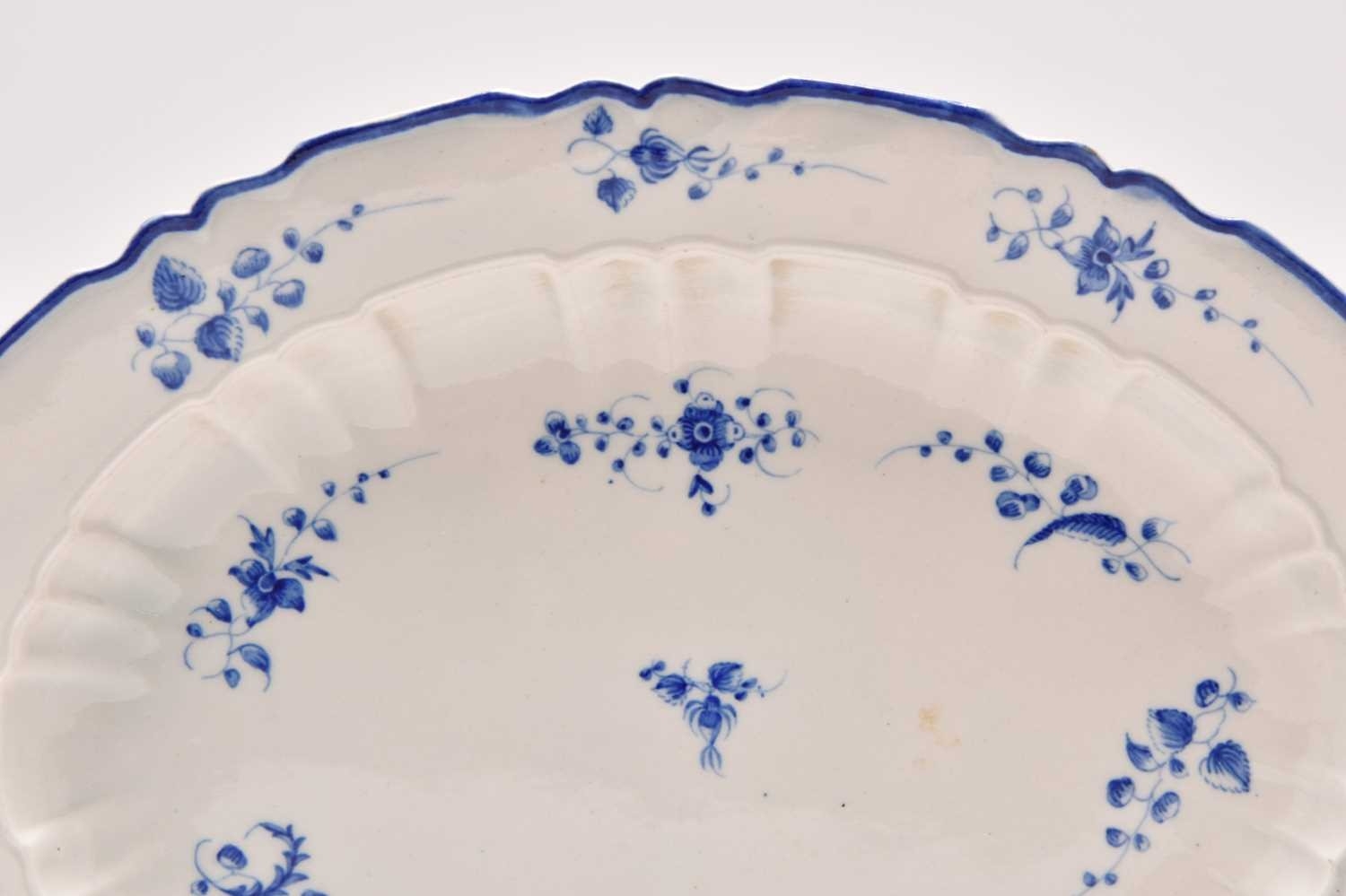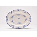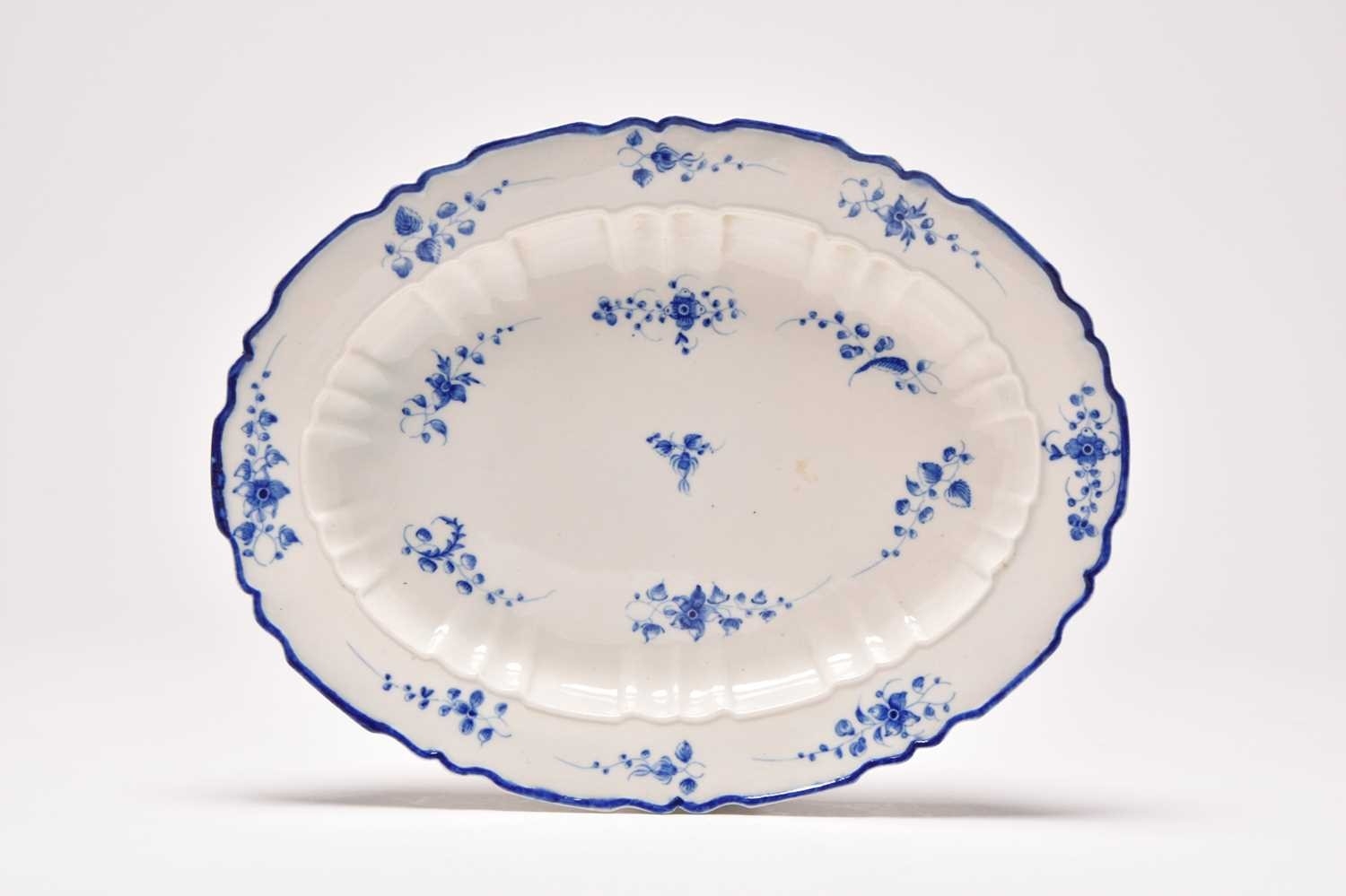 A Caughley 'Bright Sprigs' oval platter, circa 1782-92, of oval form with recessed moulded to the inner border, painted in bright, underglaze blue with the floral sprigs, single blue line border to the edge, nice bold impressed 'SALOPIAN' mark to the reverse, a relatively common pattern but an unusual shape, 32cm wide Provenance: David Waterhouse Collection. DMW no. 103. Condition:Good condition with no damages or repairs. Some light surface scratches to the glaze commensurate with age and use.