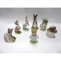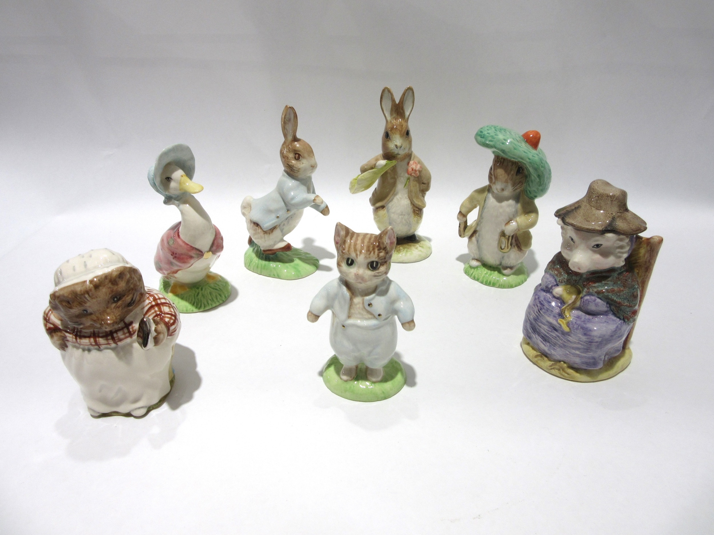 Seven Beswick Beatrix Potter figures - "Benjamin ate a lettuce leaf", "And this Pig had None", "Tom Kitten" (gold stamp), "Benjamin Bunny" (gold stamp), "Jemima Puddle-Duck" (gold stamp), "Peter Rabbit" (gold stamp) and "Mrs Tiggy-Winkle" (gold stamp)