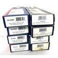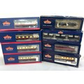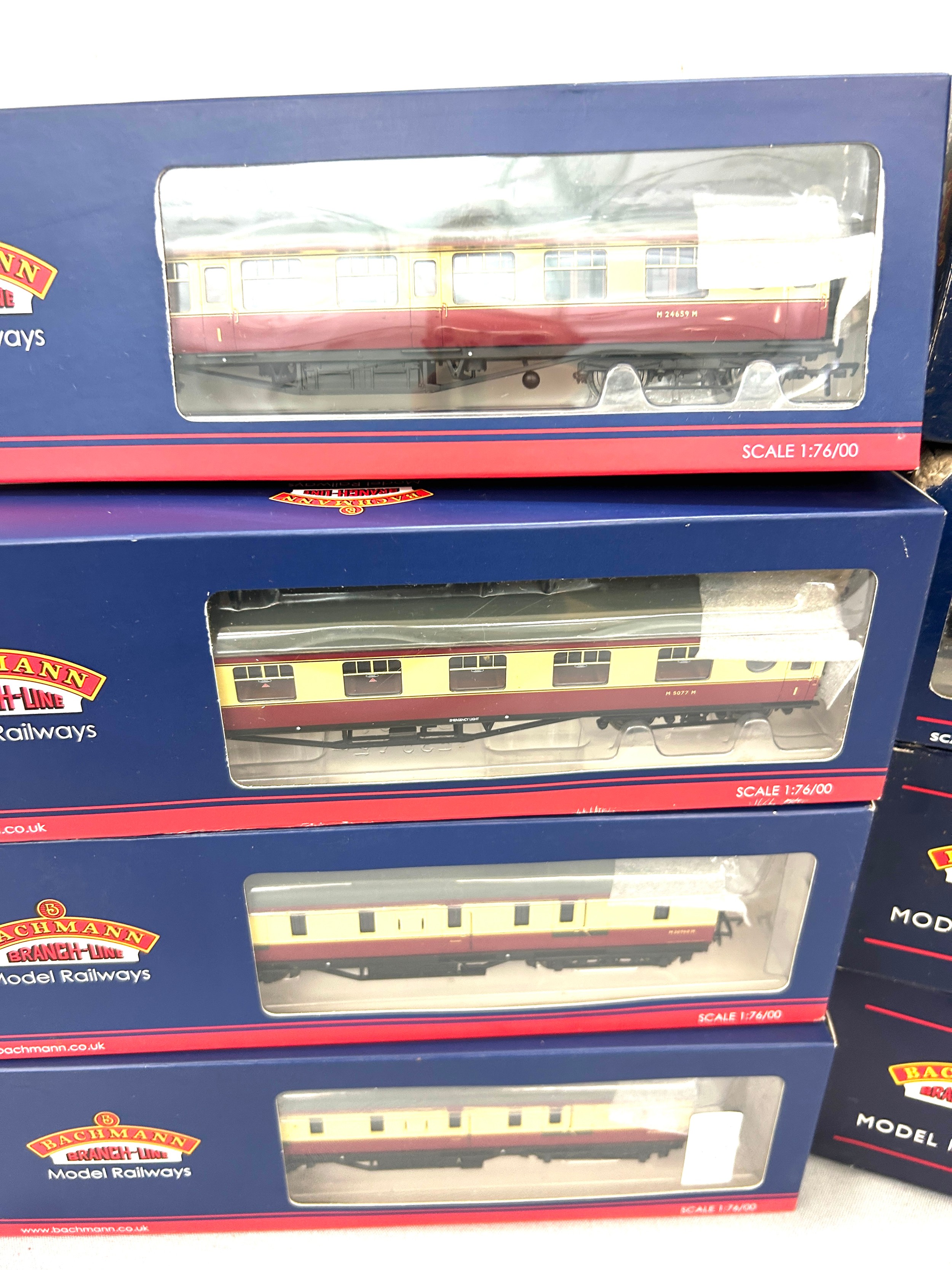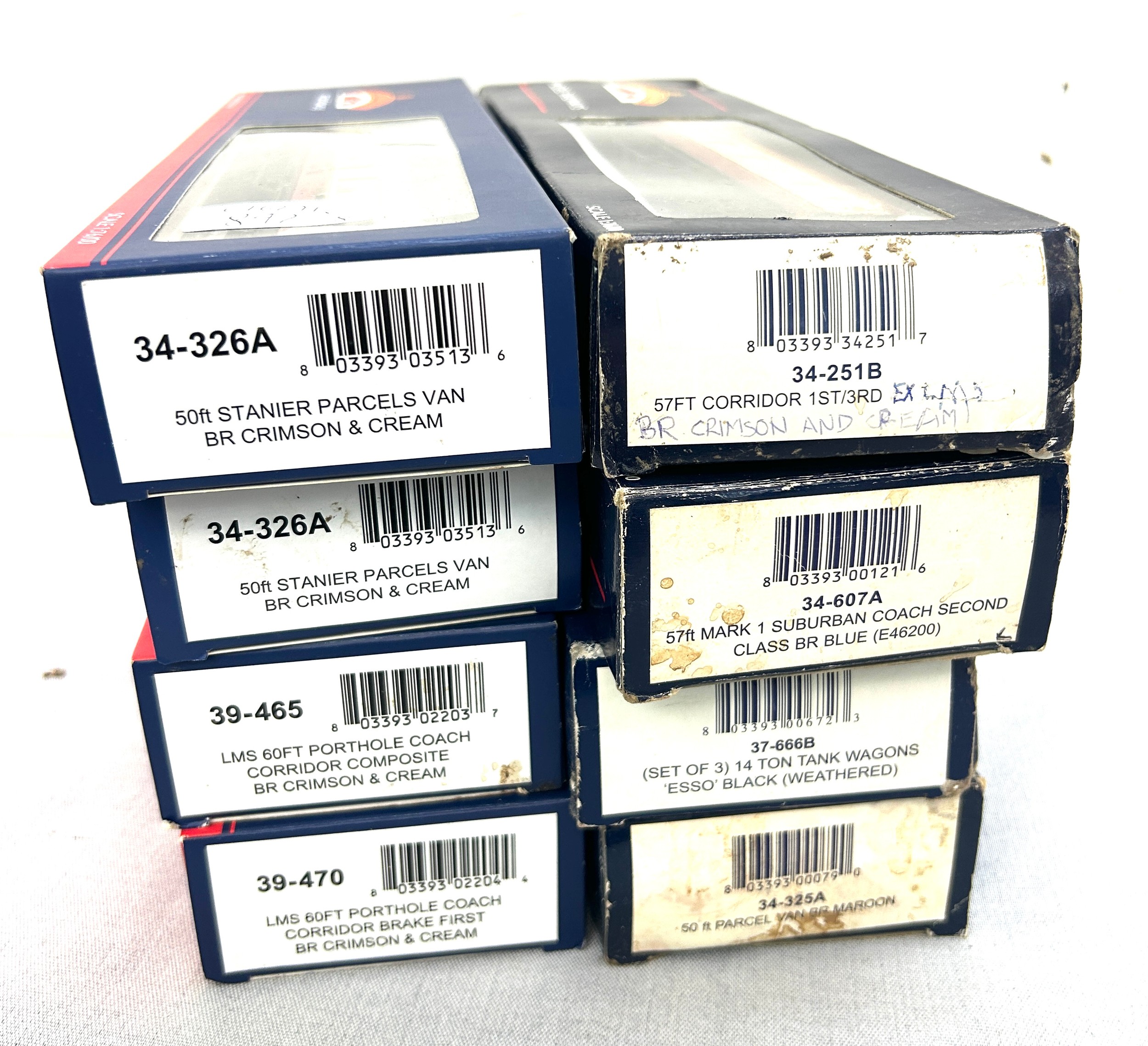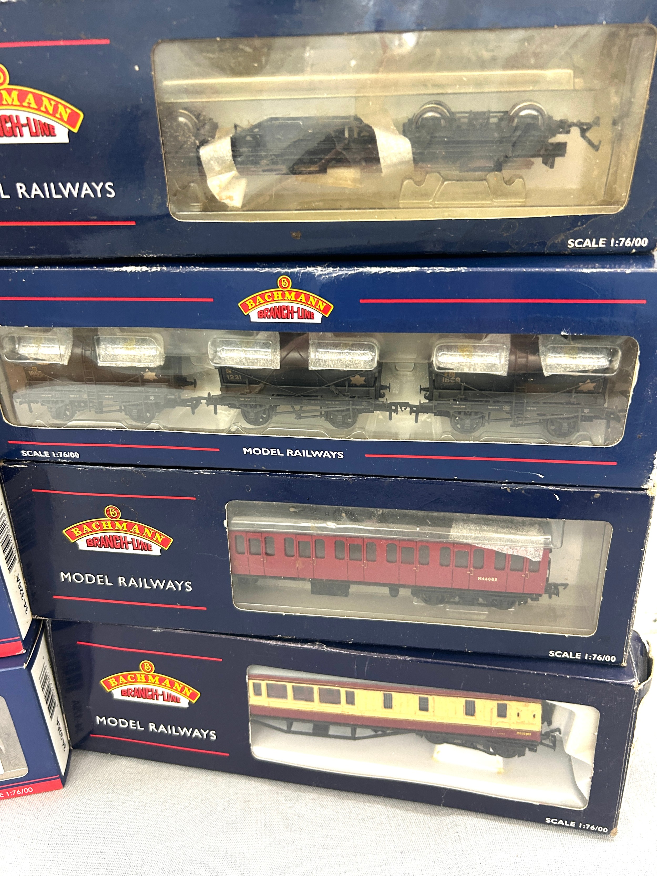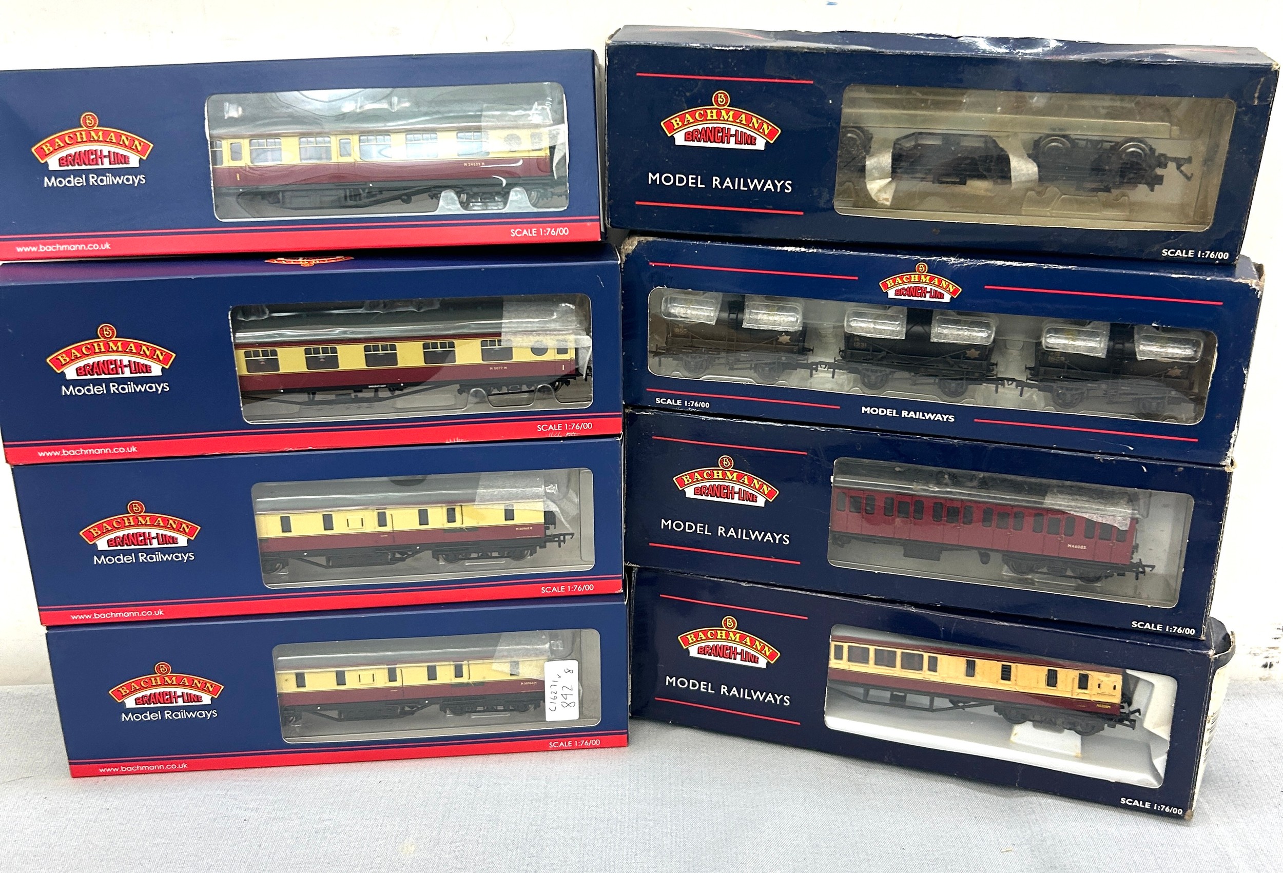 8 boxed Bachmann Branch line train carriages to include Stanier Parcels VAN, Porthole Coaches, Suburban Coach etc all boxes have sustained damp damage