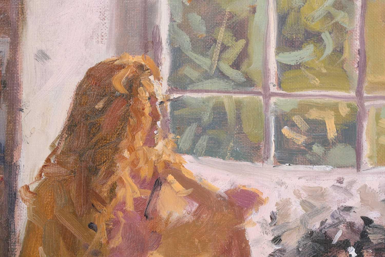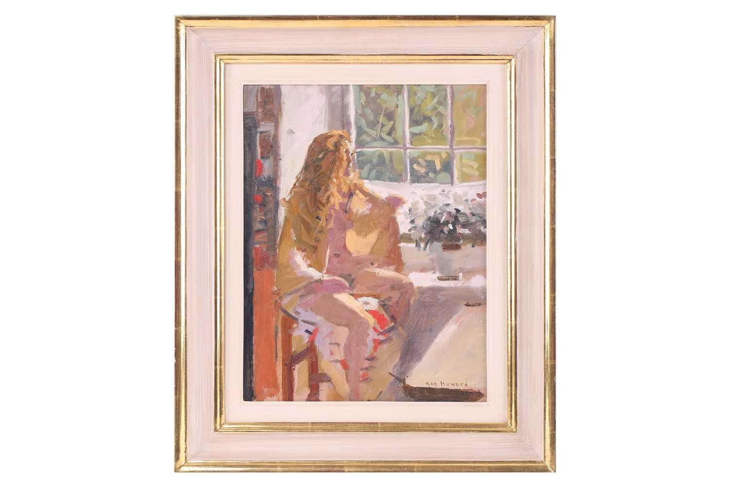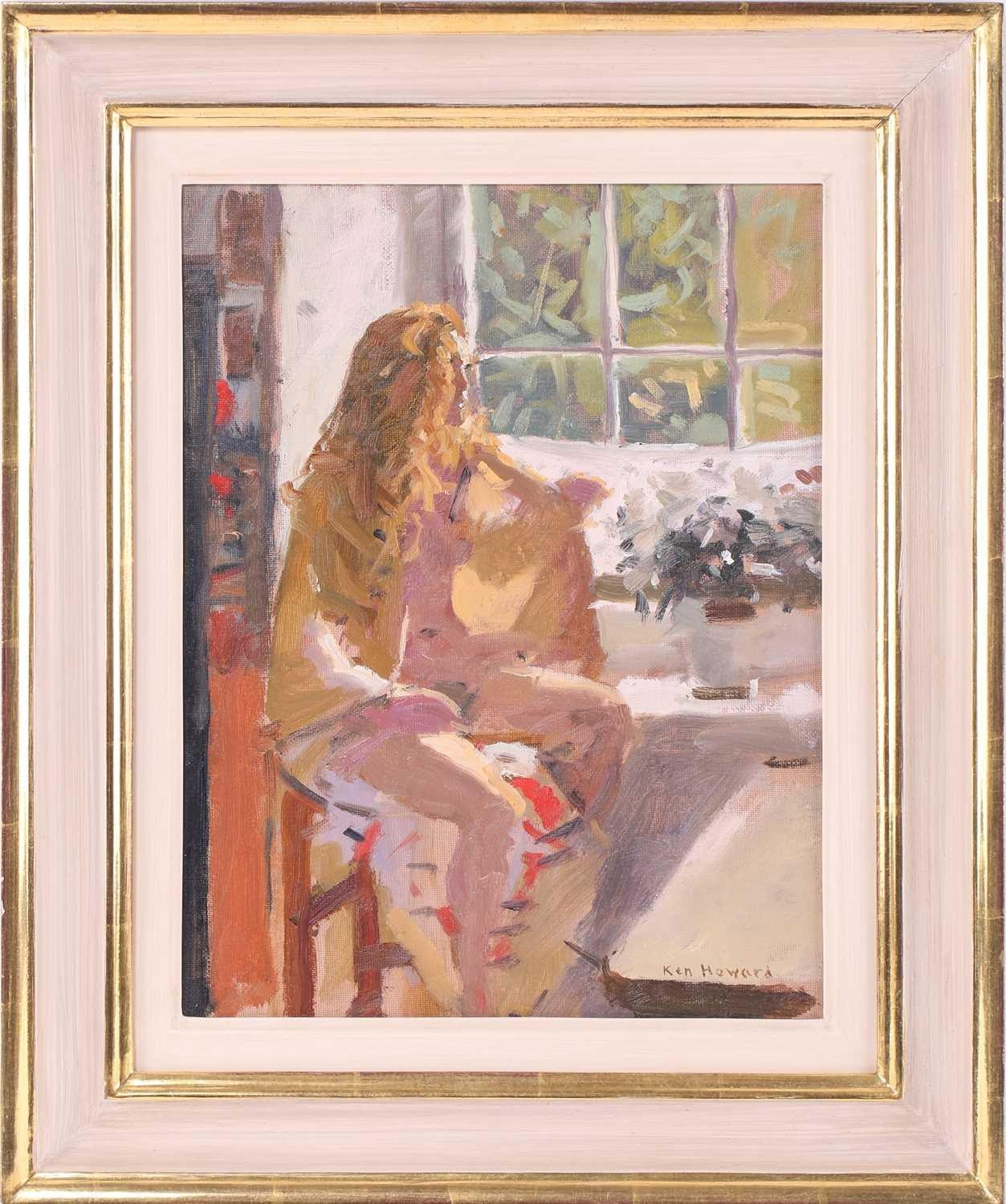 † Ken Howard (1932 - 2022), Artist's model at a window, signed, oil on board, 35 x 27 cm, framed 49 x 40.5 cm