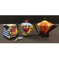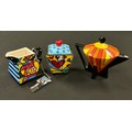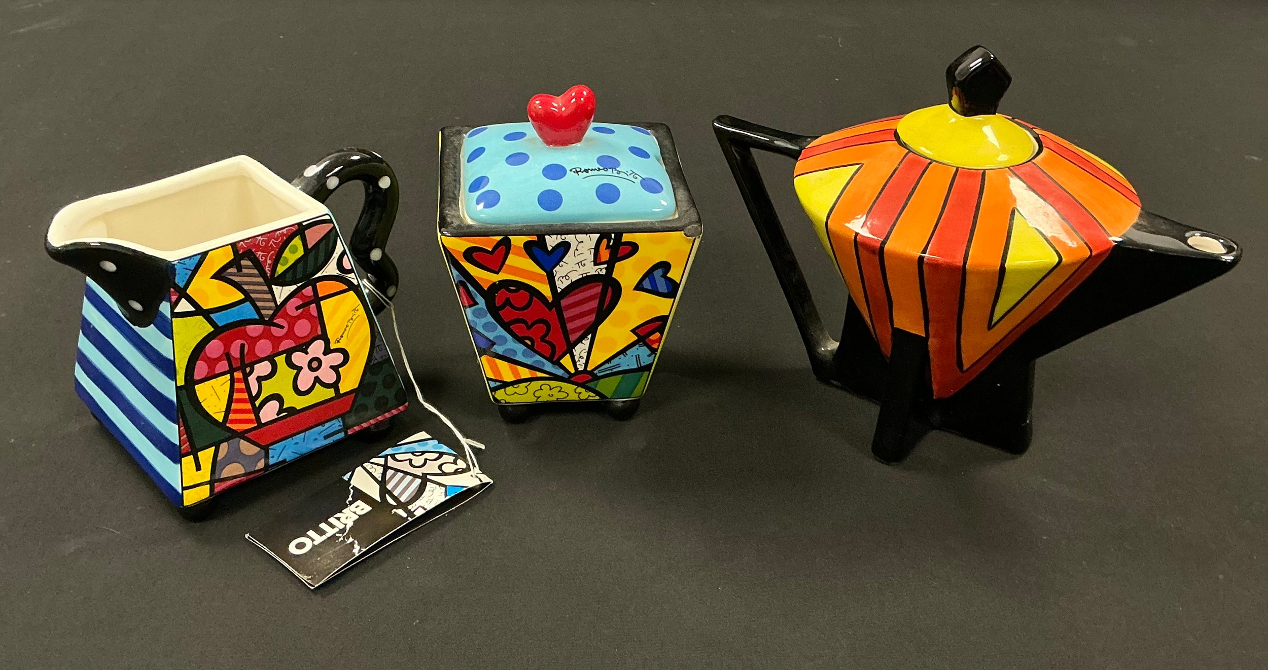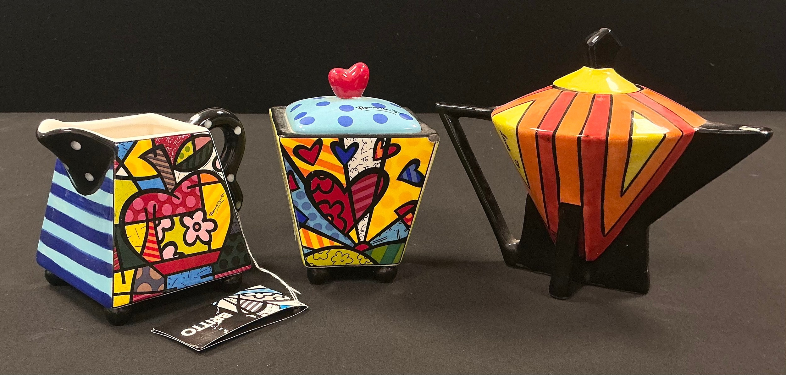 A Romero Britto cream jug and sucriere set, number #330306, the sucriere 11.5cm high; a Louis reproduction Art Deco style teapot and cover, limited number 31, 14cm, signed in gold (3)