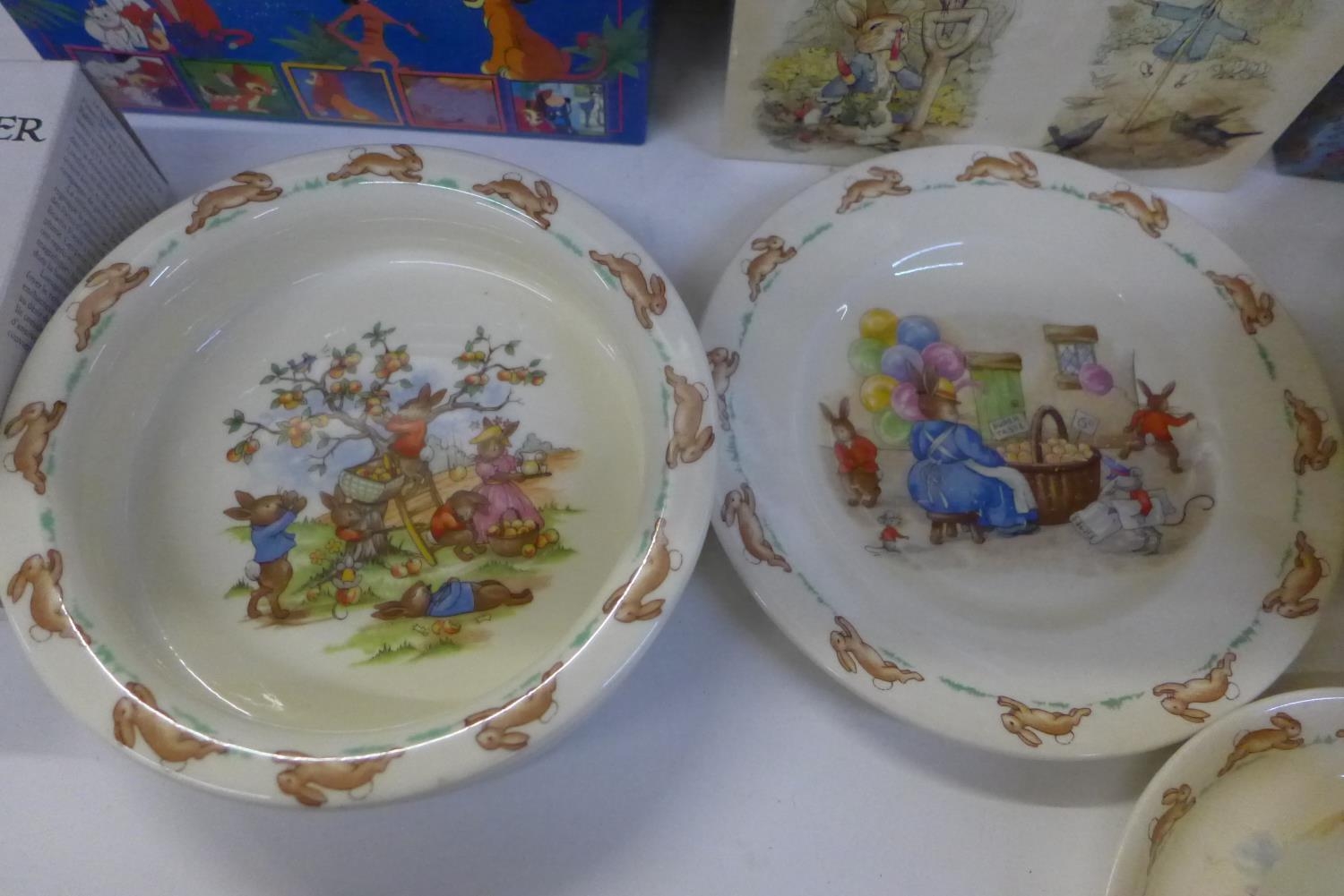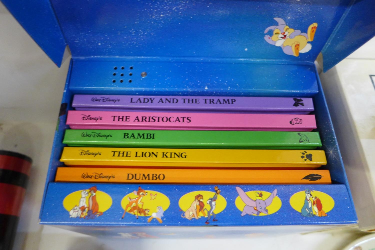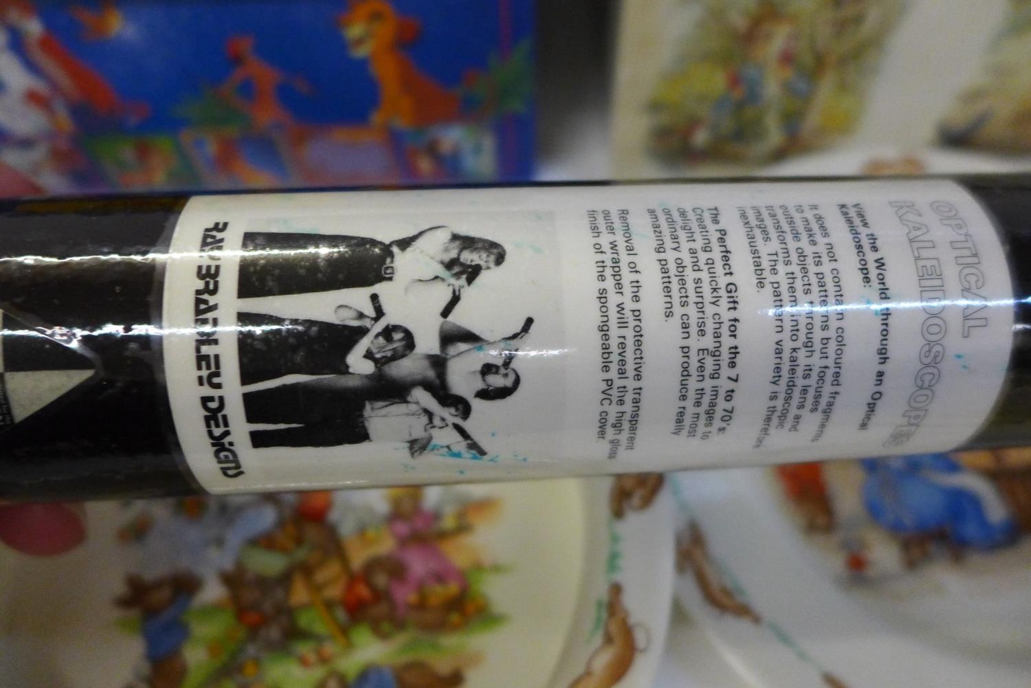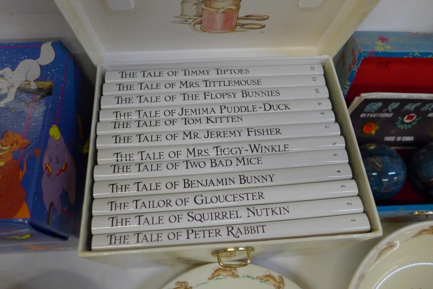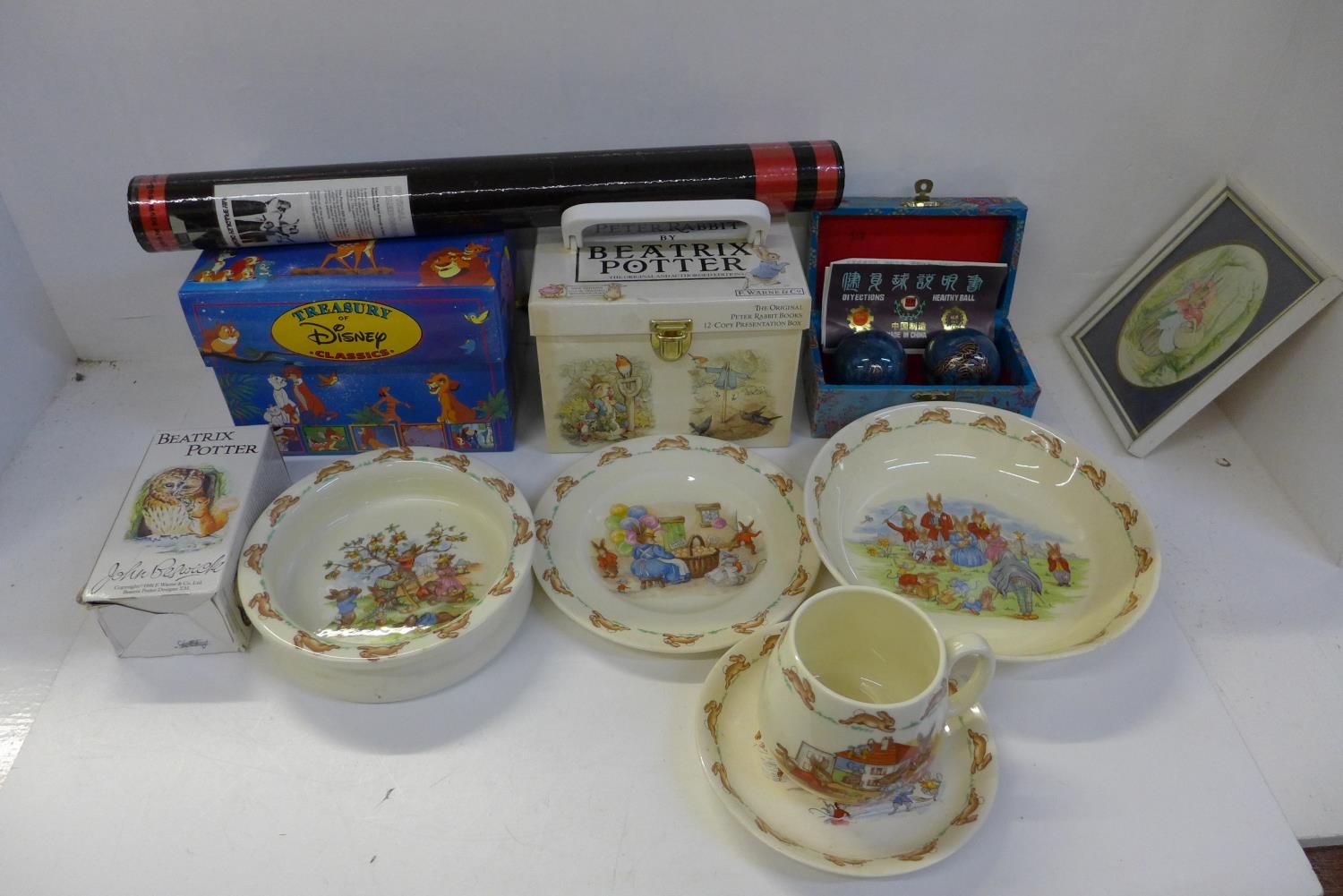 A Beatrix Potter boxed set of Frederick Warne books, a boxed set of Disney books, Royal Doulton 'Bunnykins' nursery ware and empty Peter Rabbit box, a kaleidoscope and a boxed set of Chinese stress relieving balls