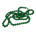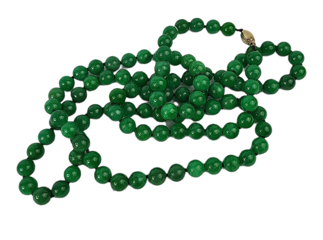 A GREEN ROUND JADE BEADS NECKLACE WITH YELLOW GOLD CLASP.