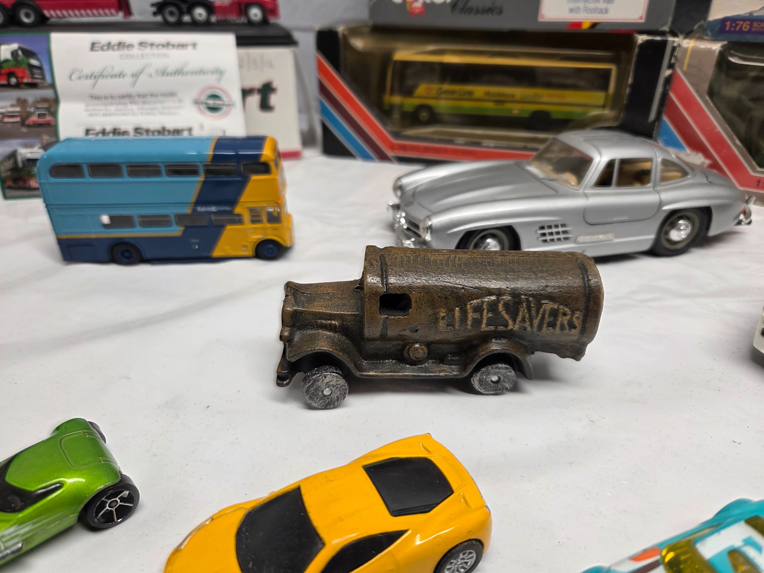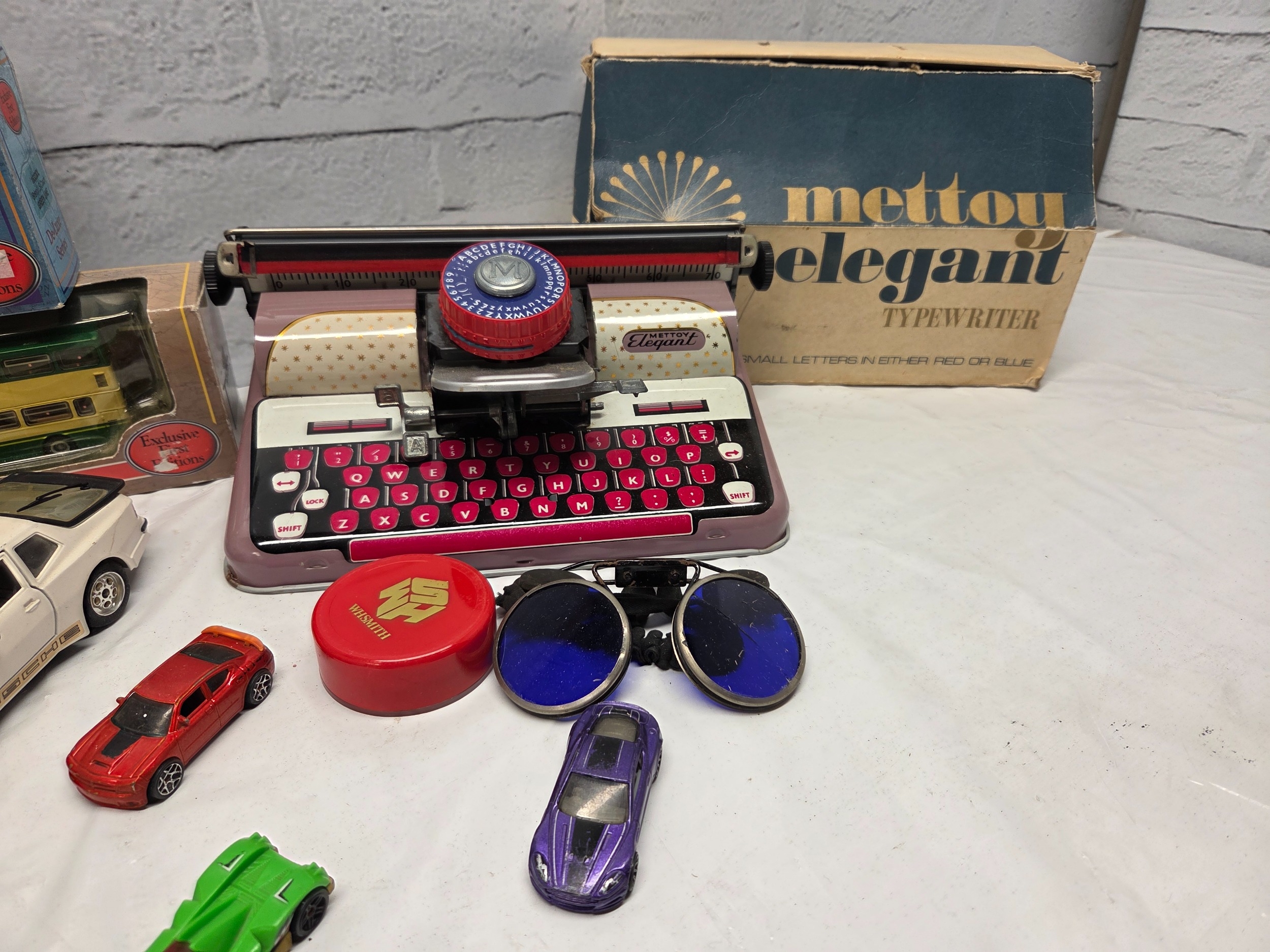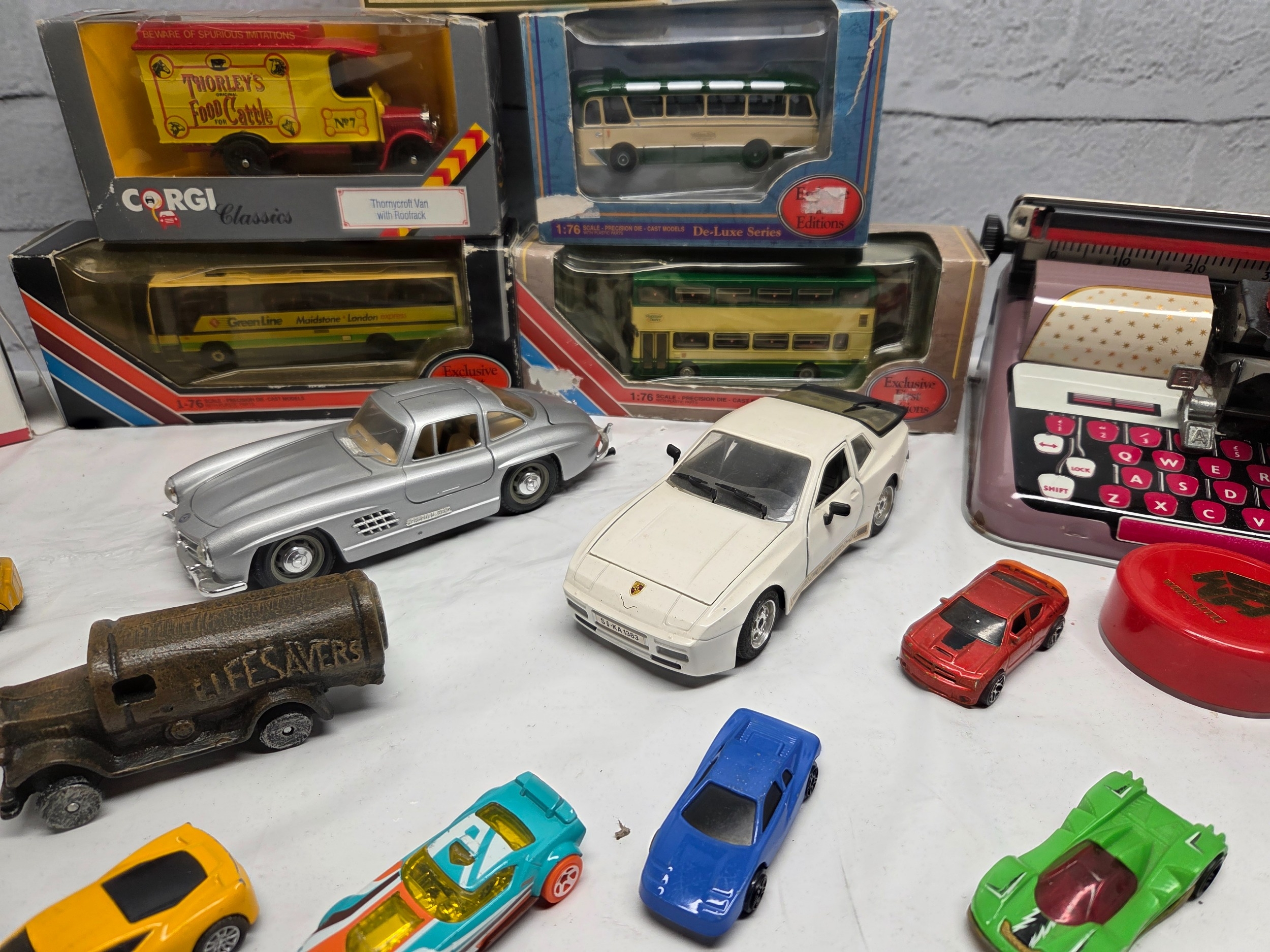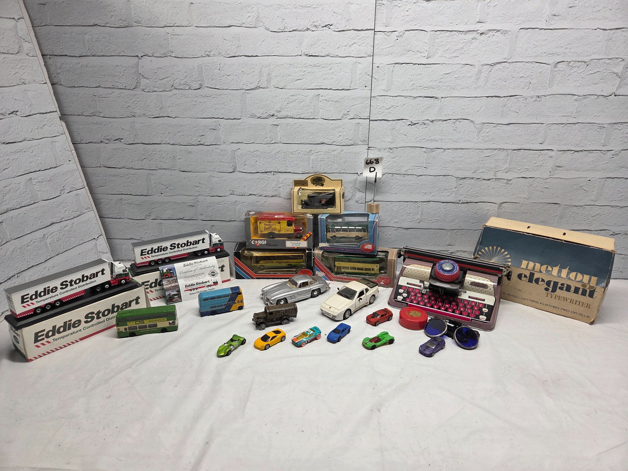 A mixed lot of vintage and collectable items to include die-cast model vehicles including boxed Eddie Stobart, Corgi, and a Mettoy typewriter with original box.