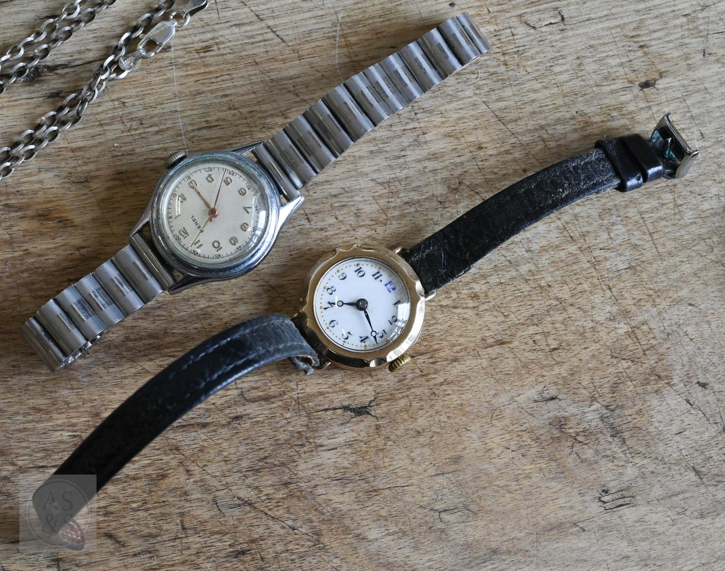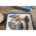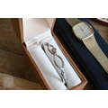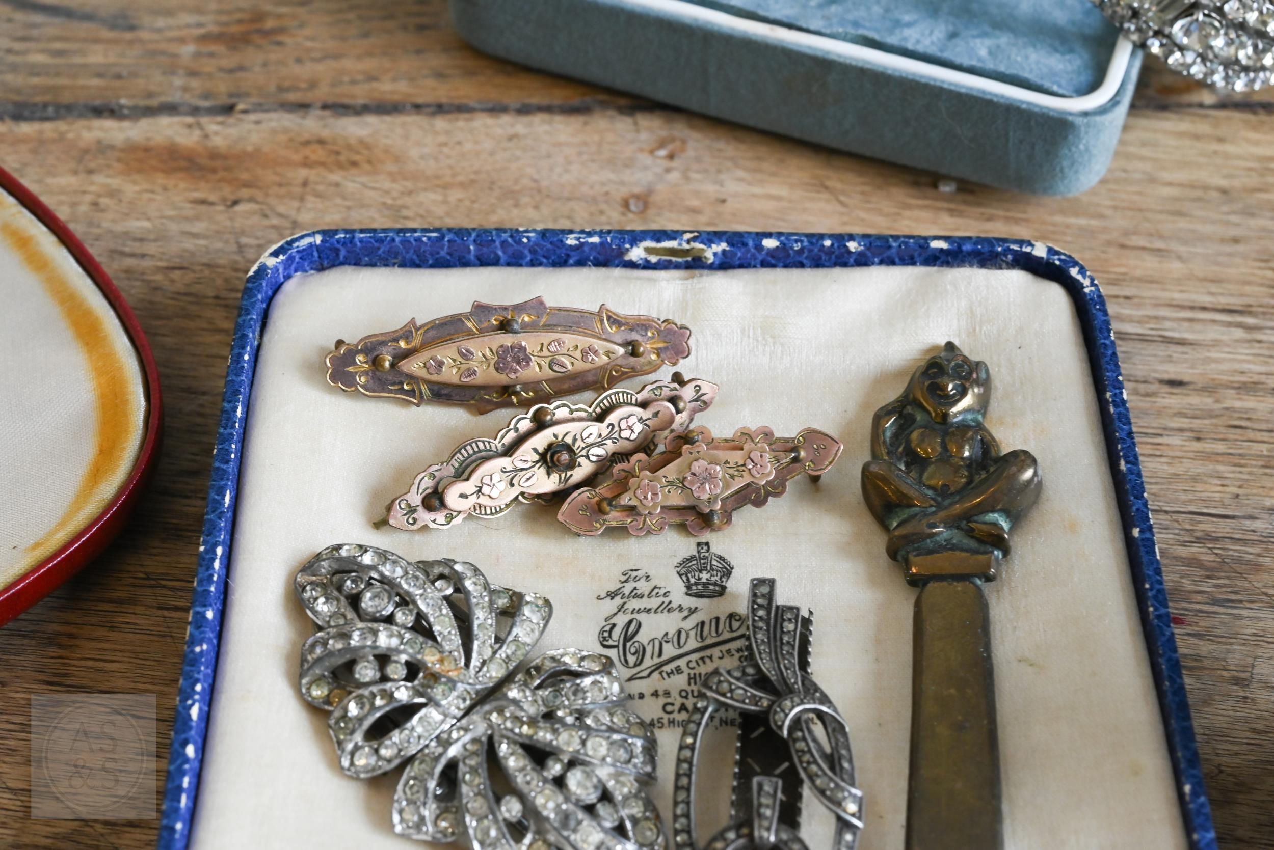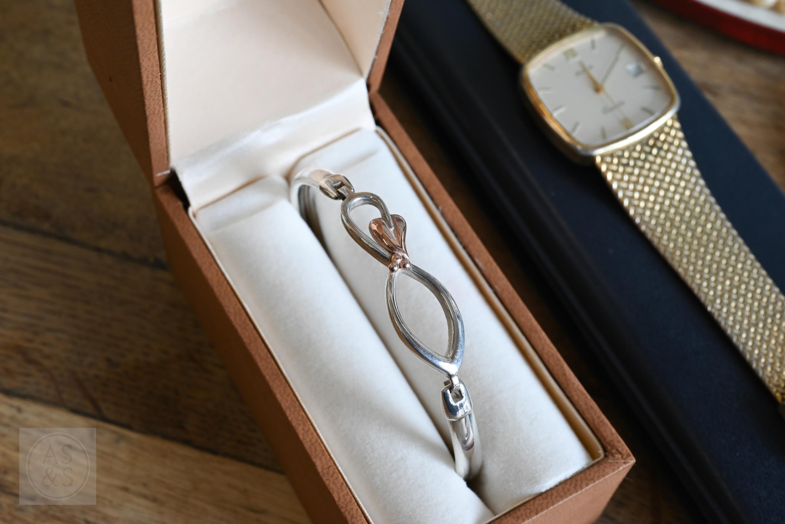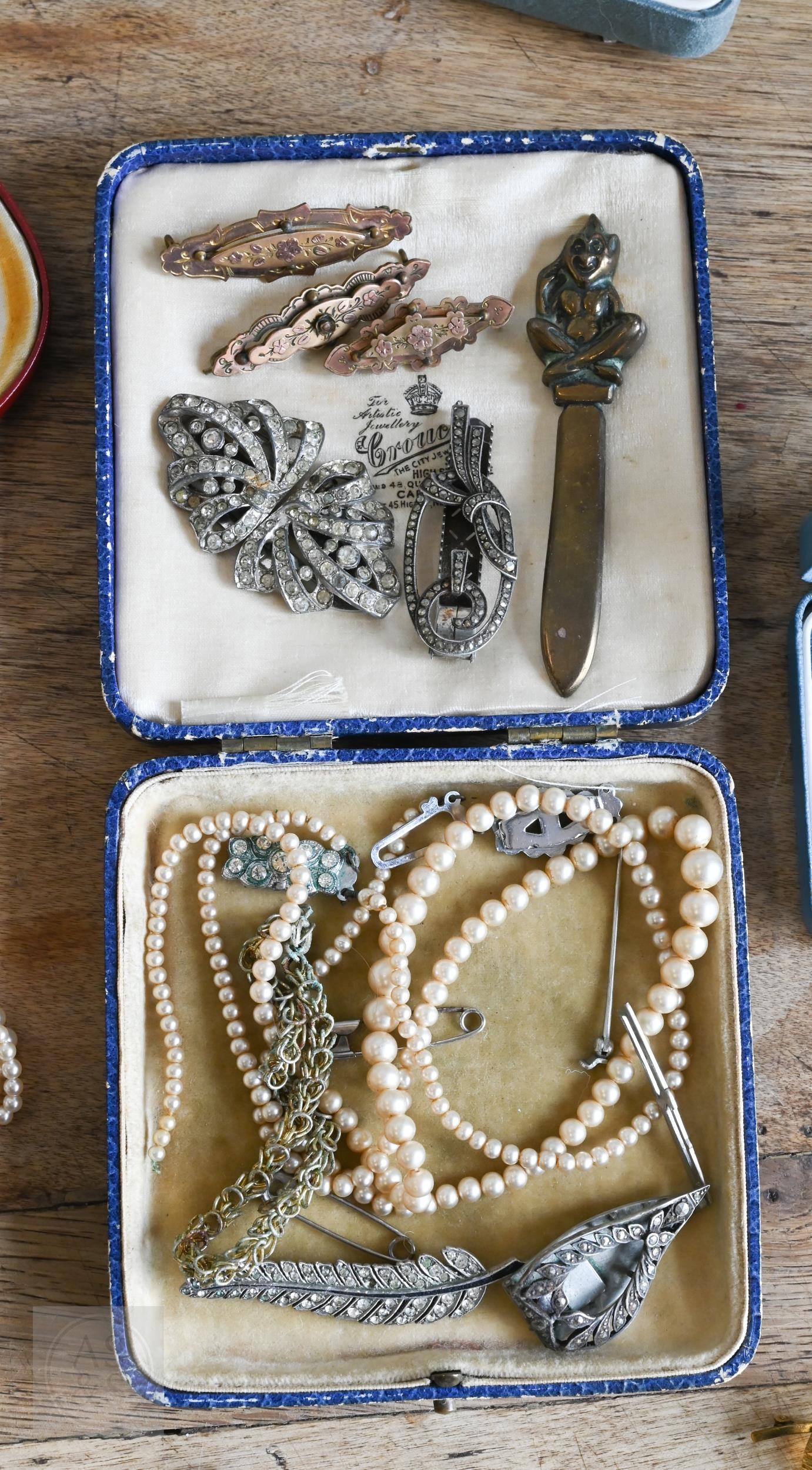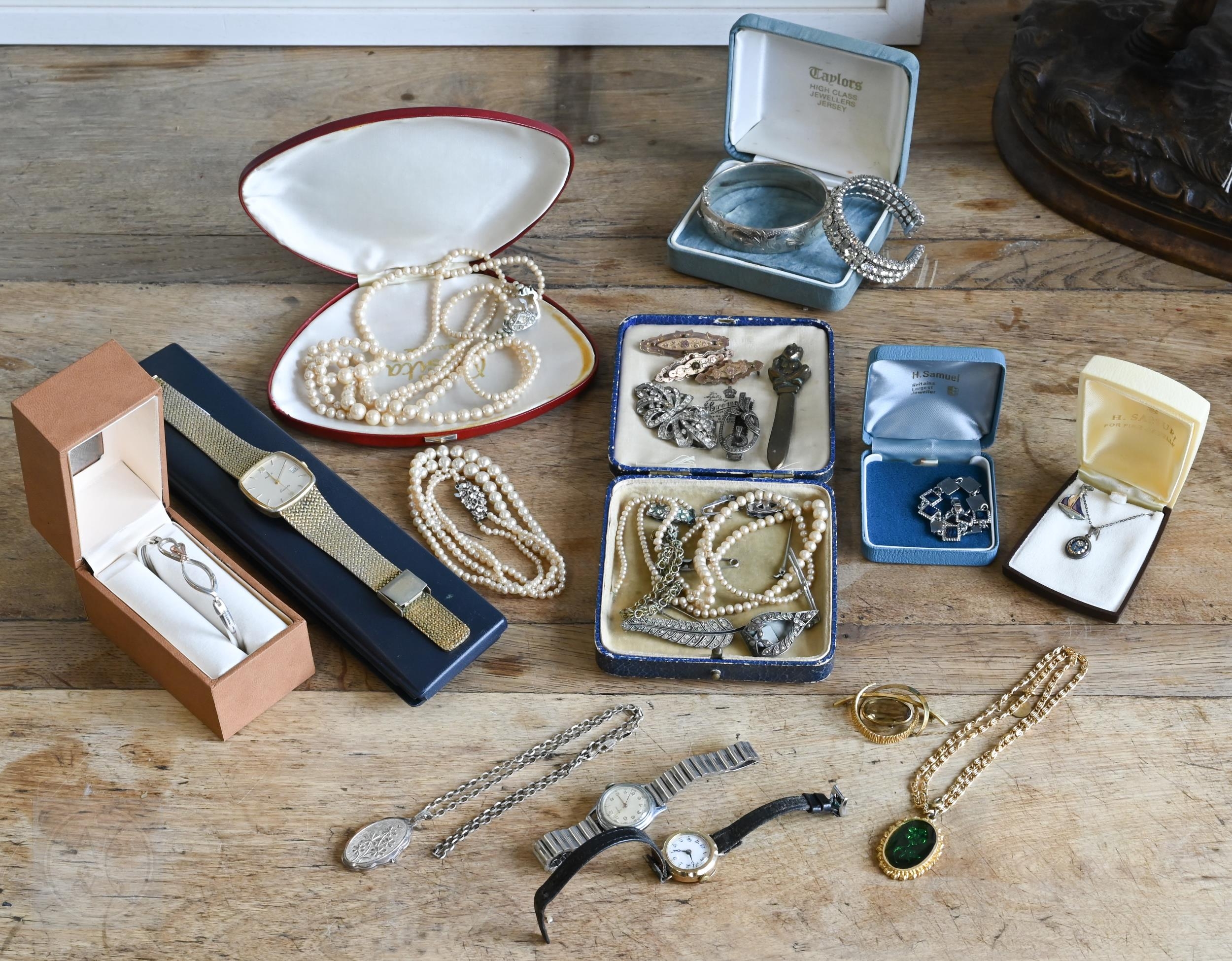 A collection of costume jewellery comprising Rosita simulated pearls, gilt metal brooches, dress clips, wristwatches etc, to/w a Clogau white metal and 'Welsh gold' bangle (boxed)