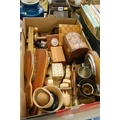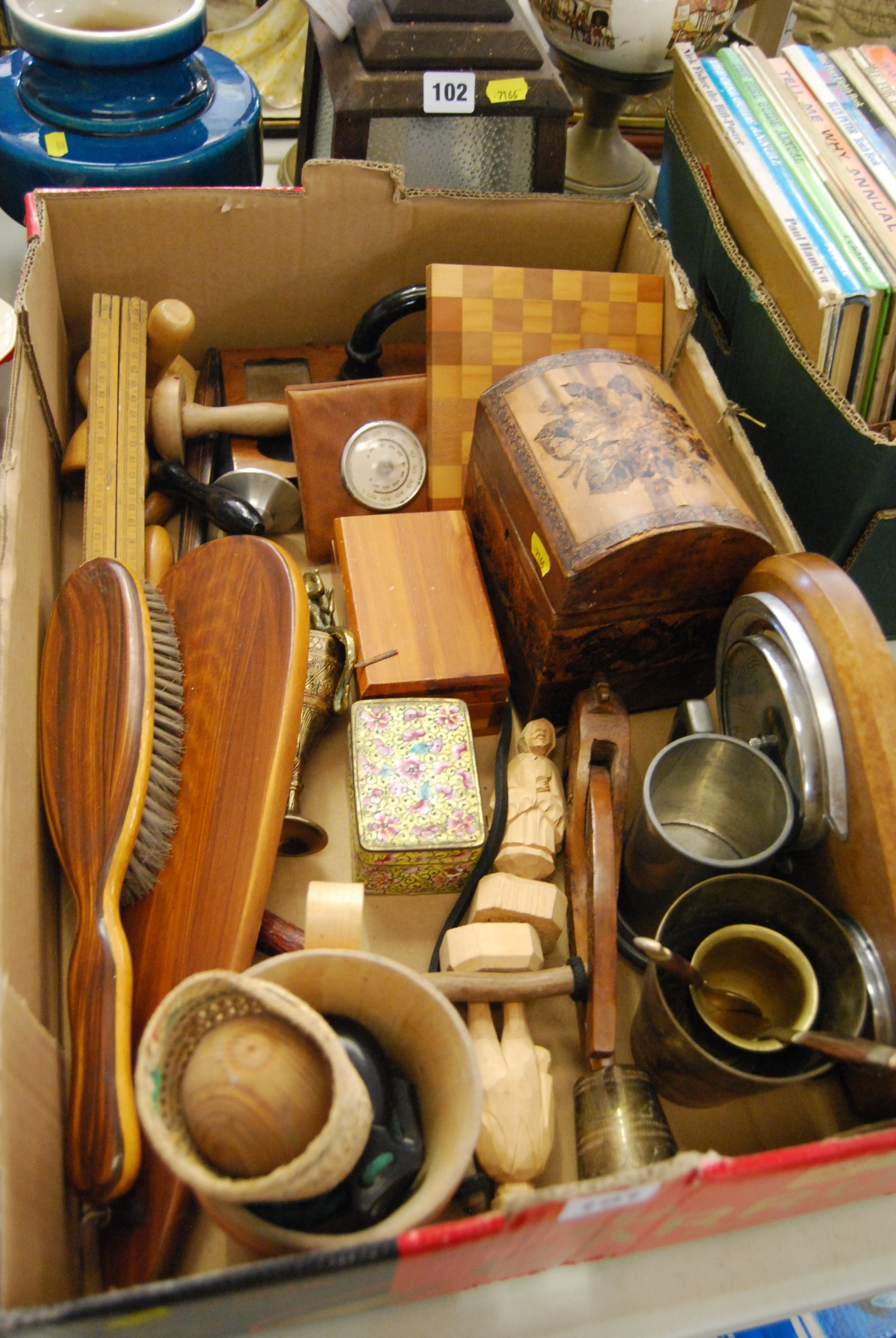 19TH CENTURY TONBRIDGE WARE DOME TOP TEA CADDY (A/F) AND QUANTITY OF WOOD & METAL ITEMS