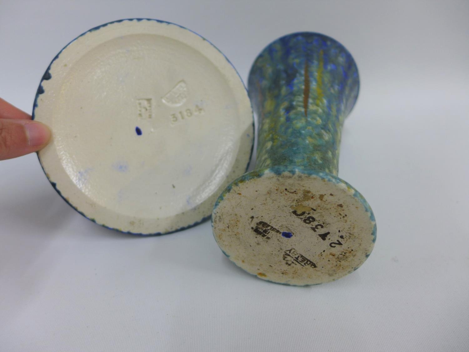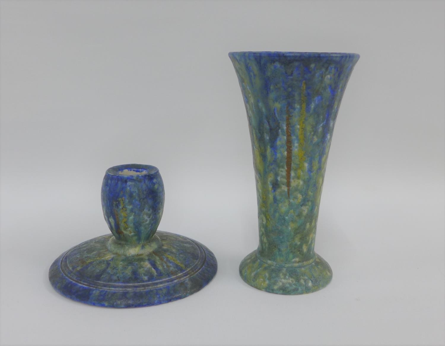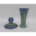 Bretby pottery vase with flared rim and circular footrim together with a matching Bretby candlestick, tallest 16cm (2)