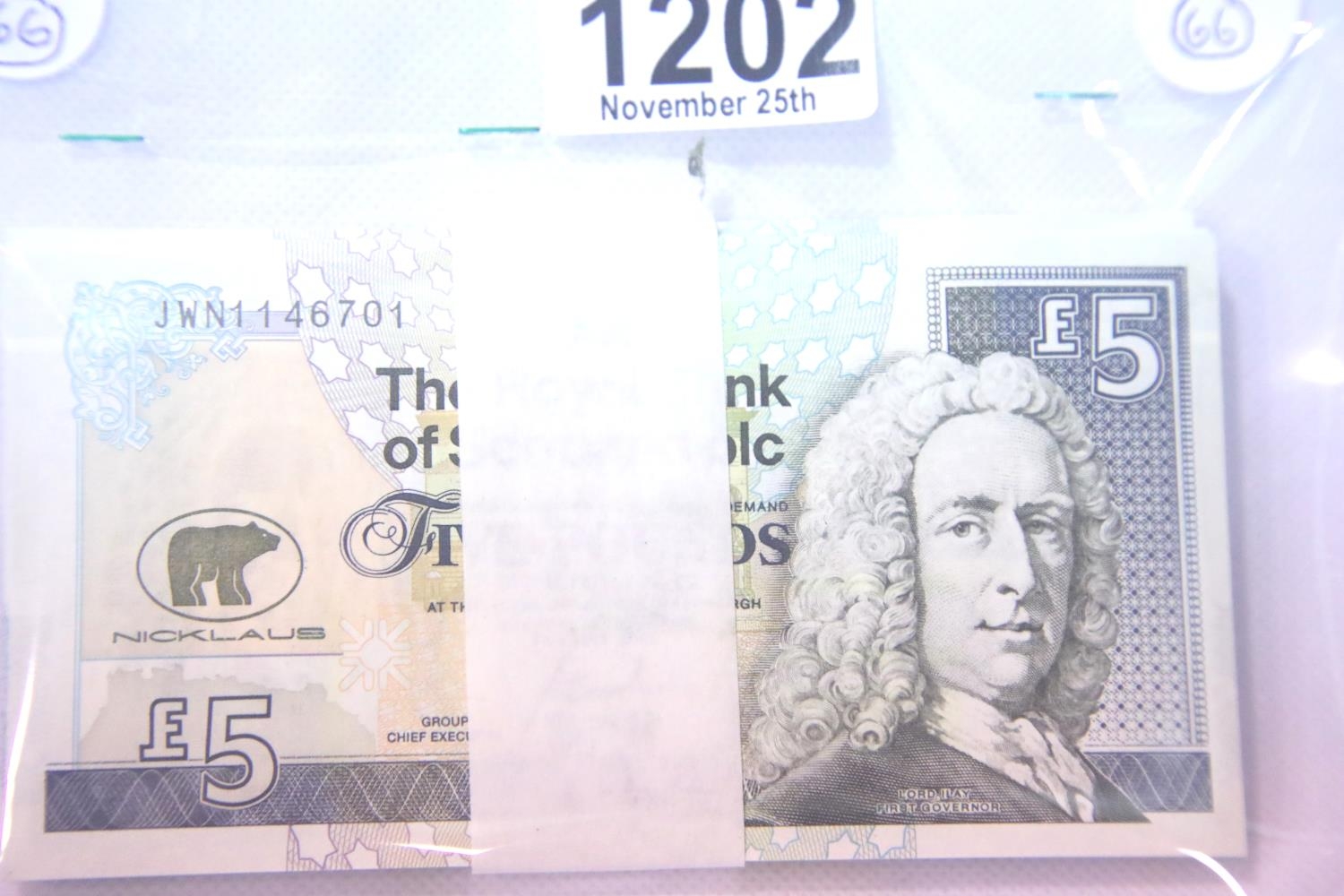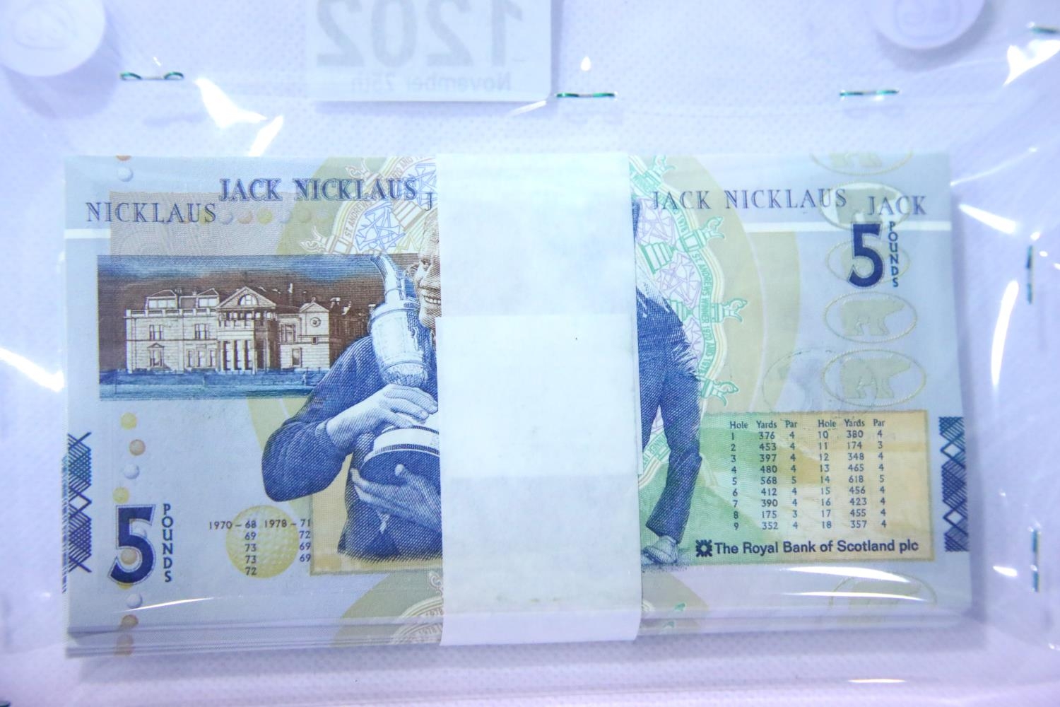 One hundred RBS Jack Nicklaus £5 notes in sequence, 701-800. P&P Group 1 (£14+VAT for the first lot and £1+VAT for subsequent lots)