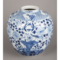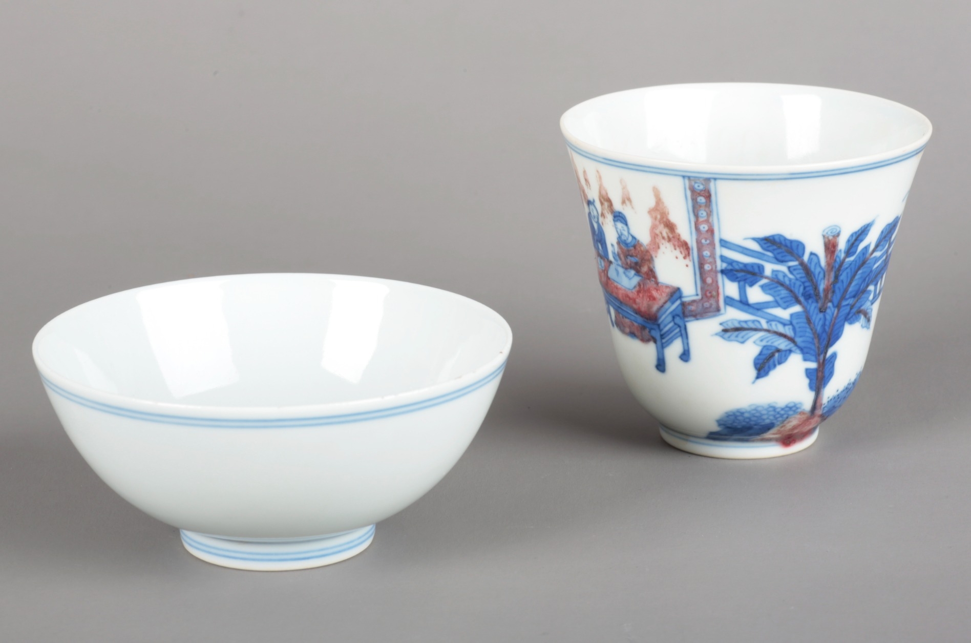 bearing a six character Chenghua mark to the base but later, decorated with court officials and attendants, 7cm high; together with a white-glazed bowl, bearing a similar Chenghua mark but later, with blue banding to the rim, 4cm high x 9.5cm diameter (2)