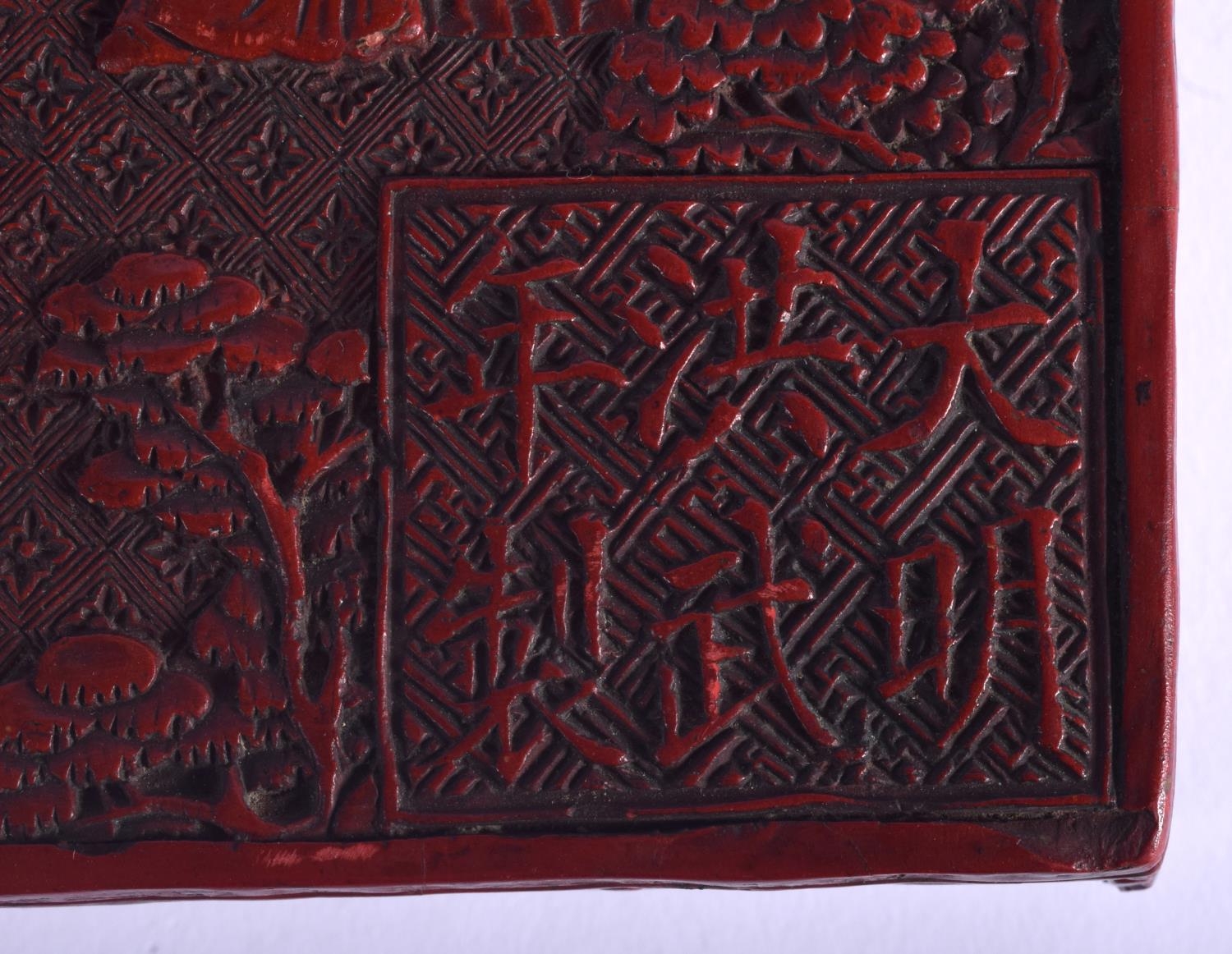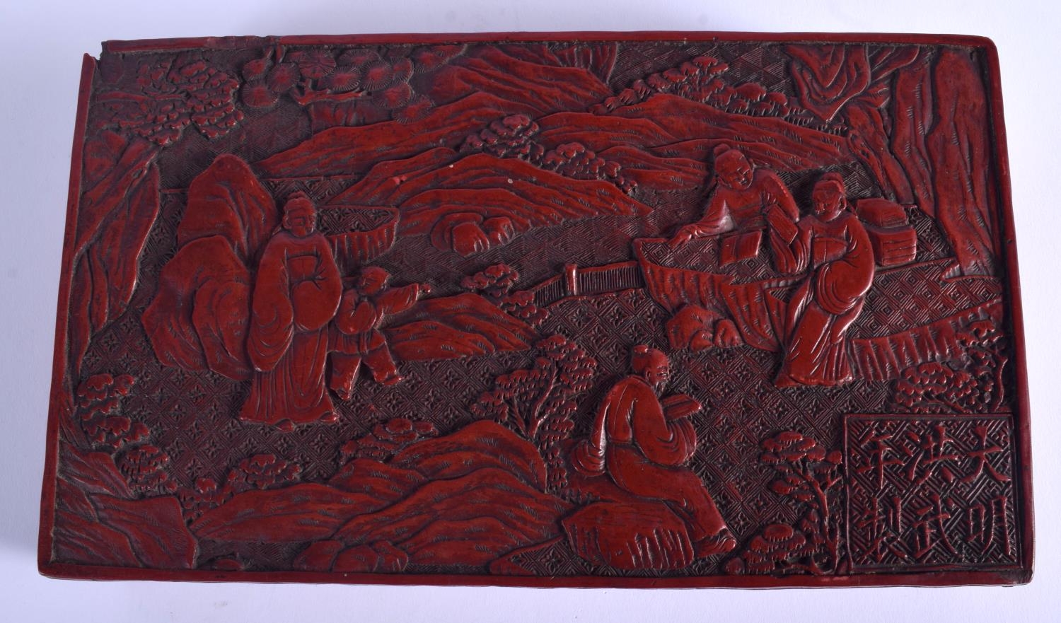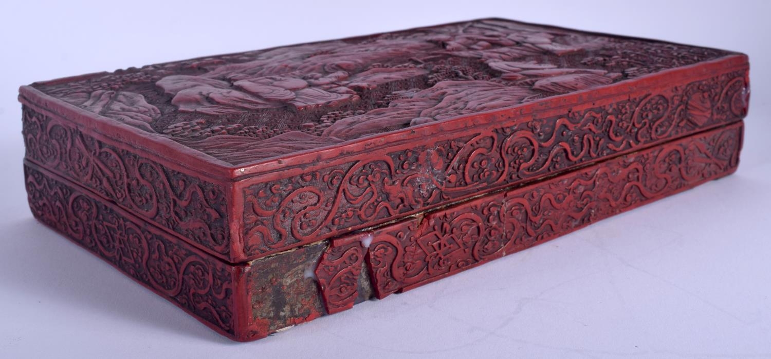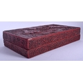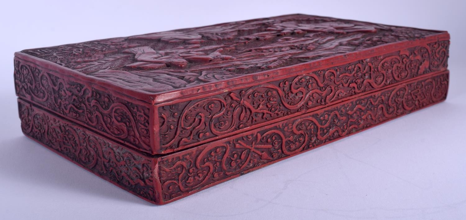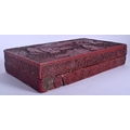 AN 18TH/19TH CENTURY CHINESE CARVED CINNABAR LACQUER BOX AND COVER Qing, bearing Hongwu marks to top, decorated with figures. 26 cm x 14 cm.