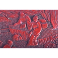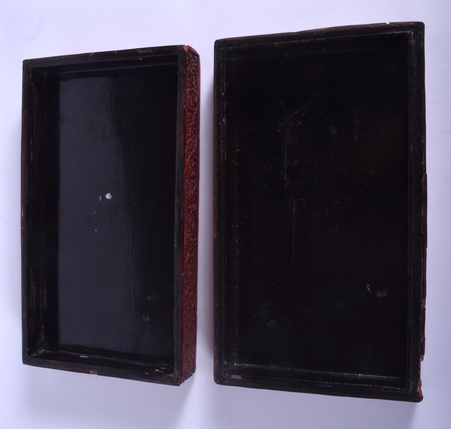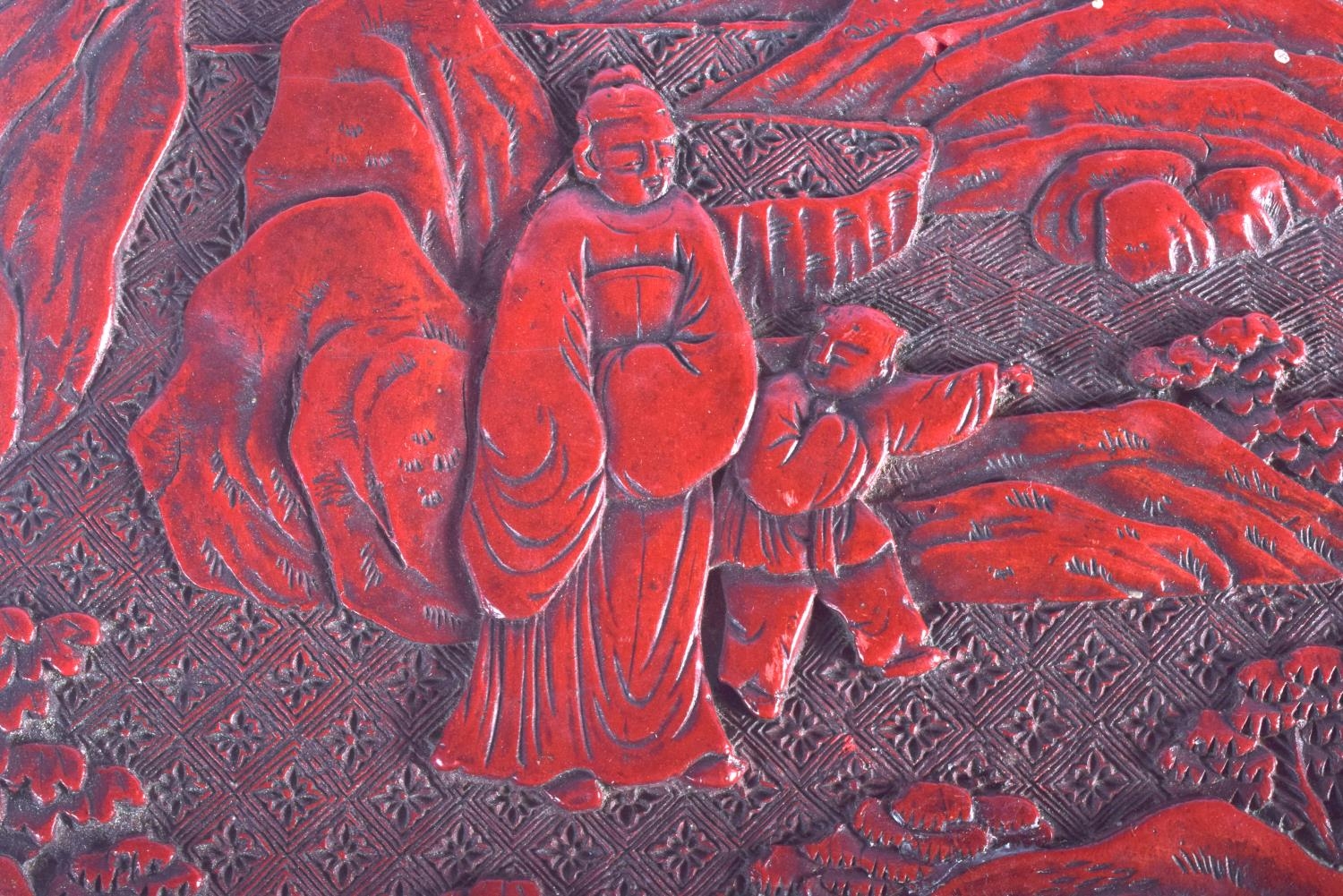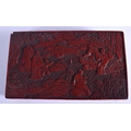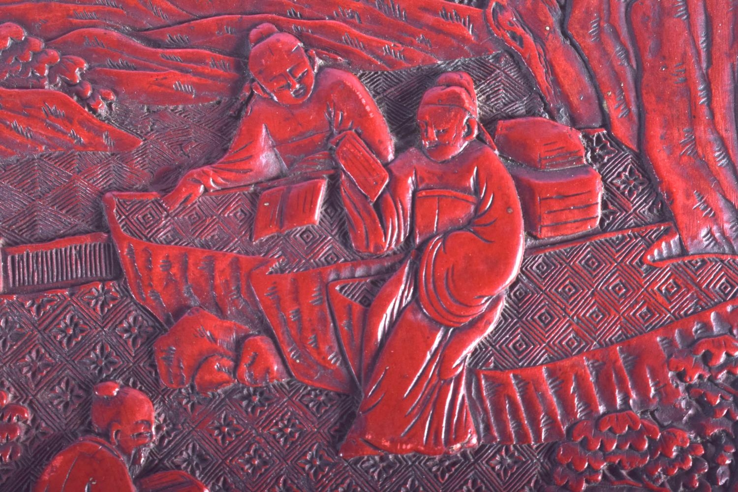 AN 18TH/19TH CENTURY CHINESE CARVED CINNABAR LACQUER BOX AND COVER Qing, bearing Hongwu marks to top, decorated with figures. 26 cm x 14 cm.