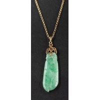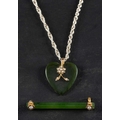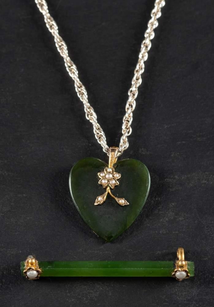 A nephrite pendant and brooch,: a 9ct gold heart-shaped, seed pearl and nephrite pendant, hallmarks for Chester, 1908, length ca. 3cm; a nephrite and seed pearl bar brooch, length ca. 5.8cm, (a/f) together with a silver Prince of Wales chain, with import marks for London, length ca. 72cm.