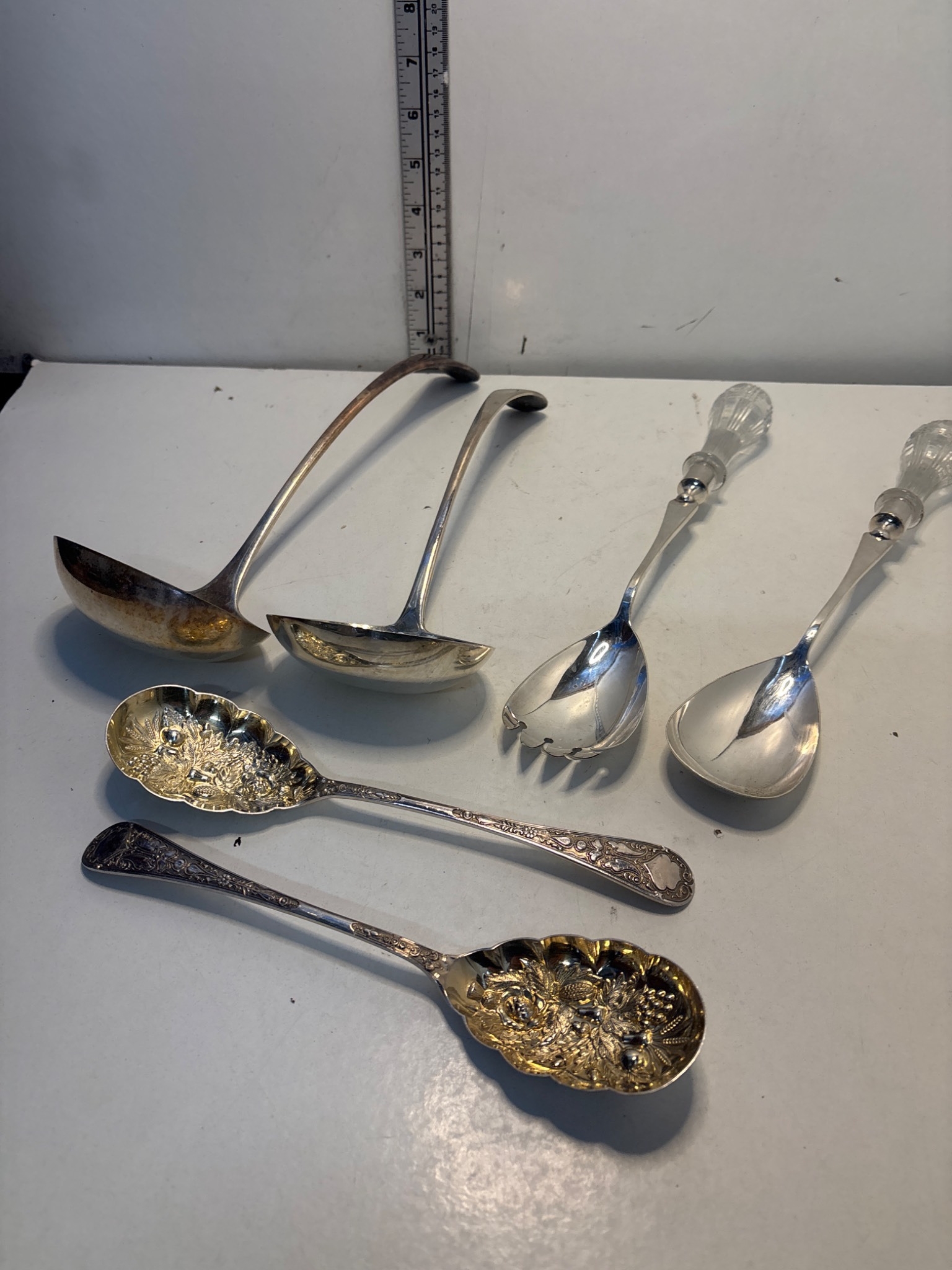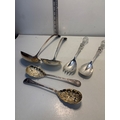Six silver plated serving utensils with ornate designs.