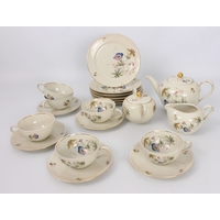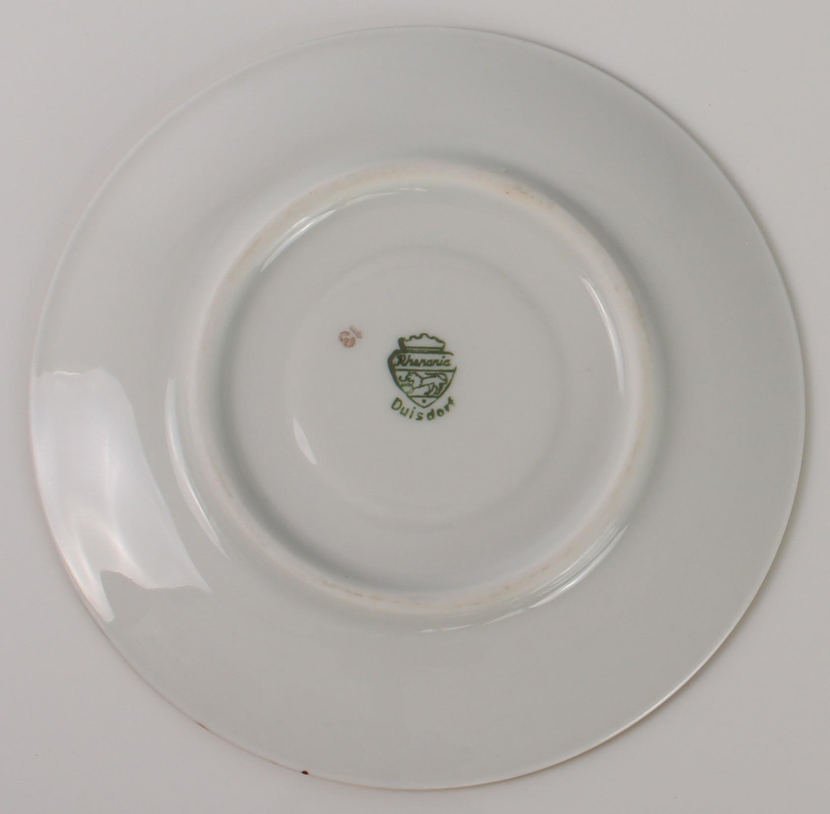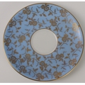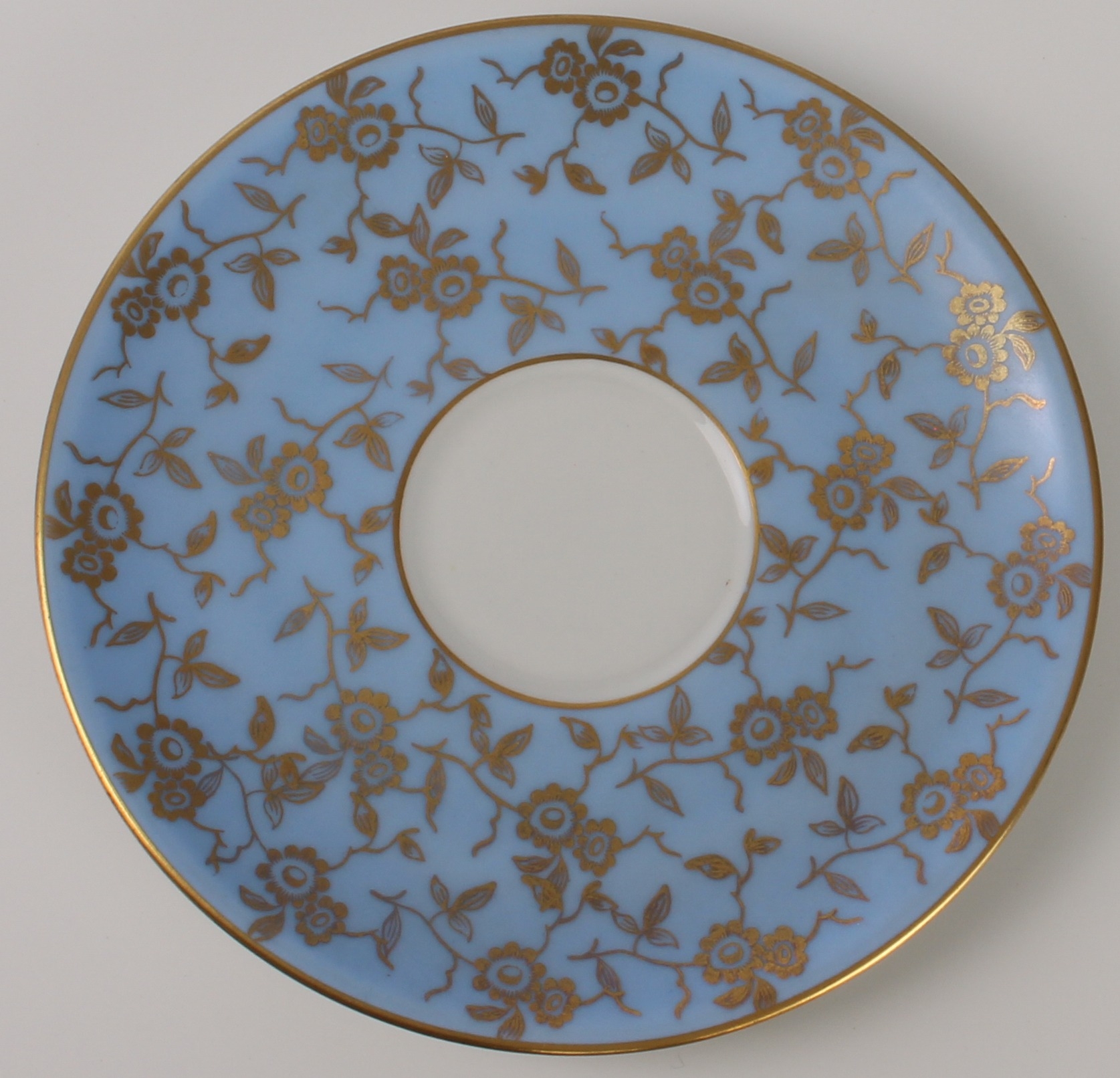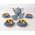 A German porcelain coffee set by Rhenania of Duisdorf - 1920s-30s, decorated with overall gilt floral decoration on a light blue ground, the cups with gilt interiors, comprising an ovoid coffee pot, covered sugar bowl, cream jug and four cups and saucers, the pot 12.25 cm high.