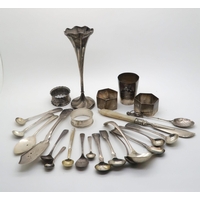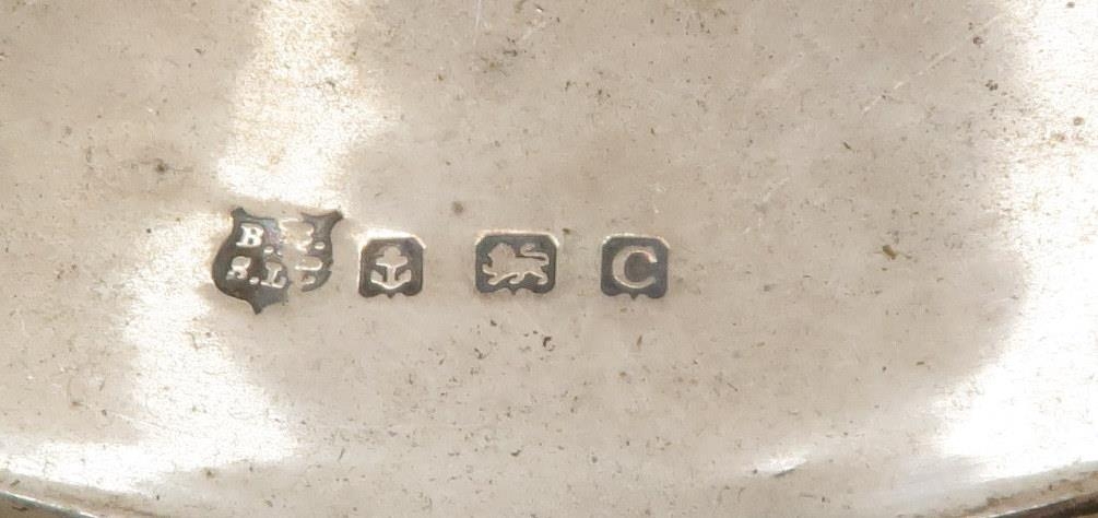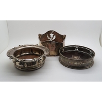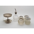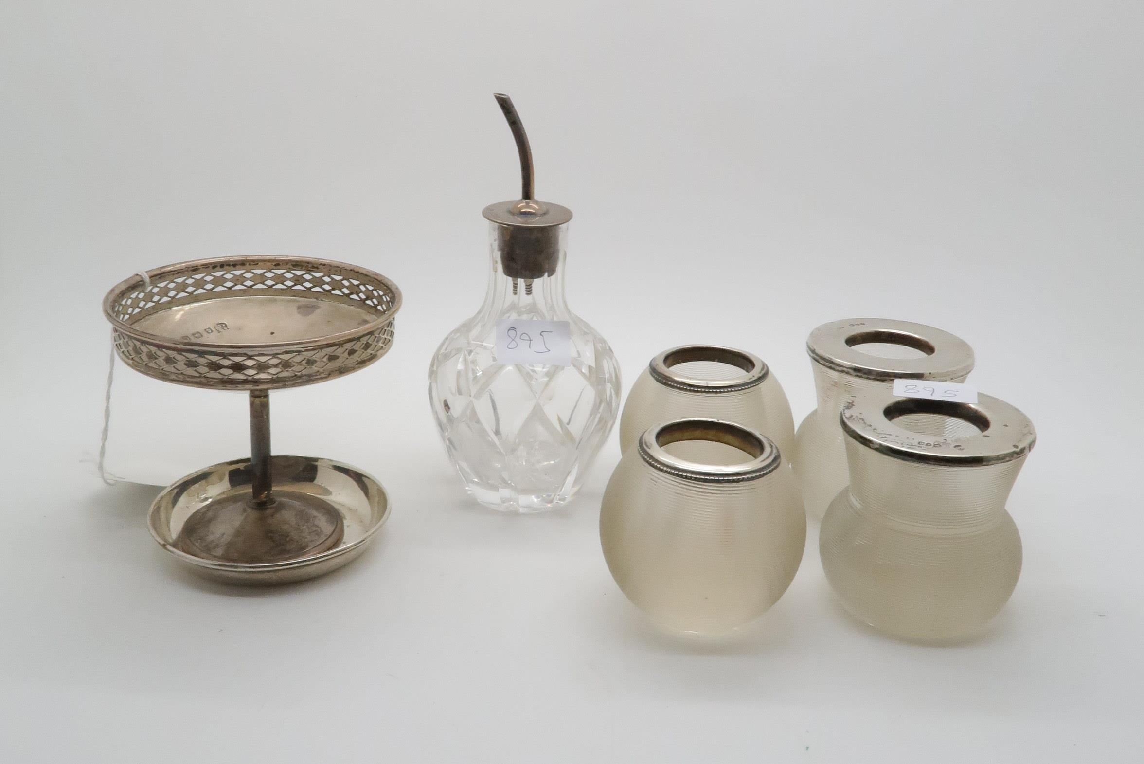 A collection of four glass and silver topped match strikers, London 1900, makers marks mostly rubbed (possibly William Comyns & Sons), a silver footed bowl by Barker Brothers Silver Ltd, Birmingham 1927, a silver dish, London 1936 and a silver topped glass olive oil pourer, Birmingham 1927 (7)