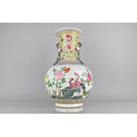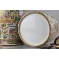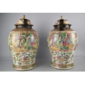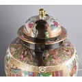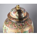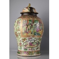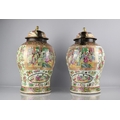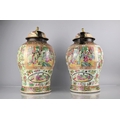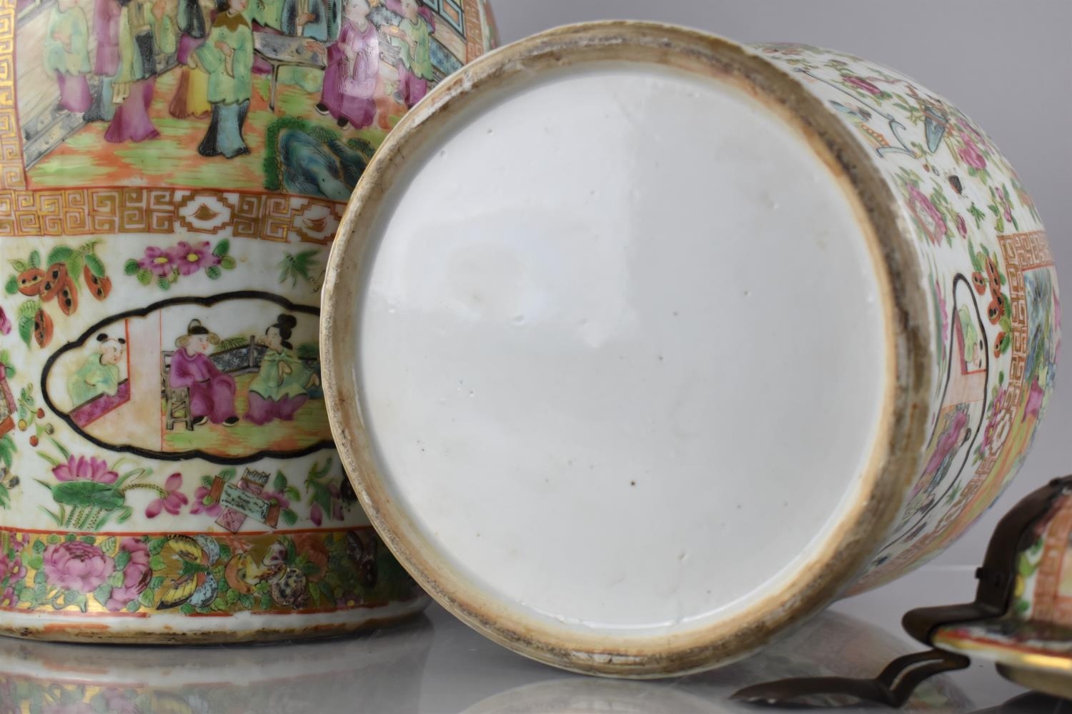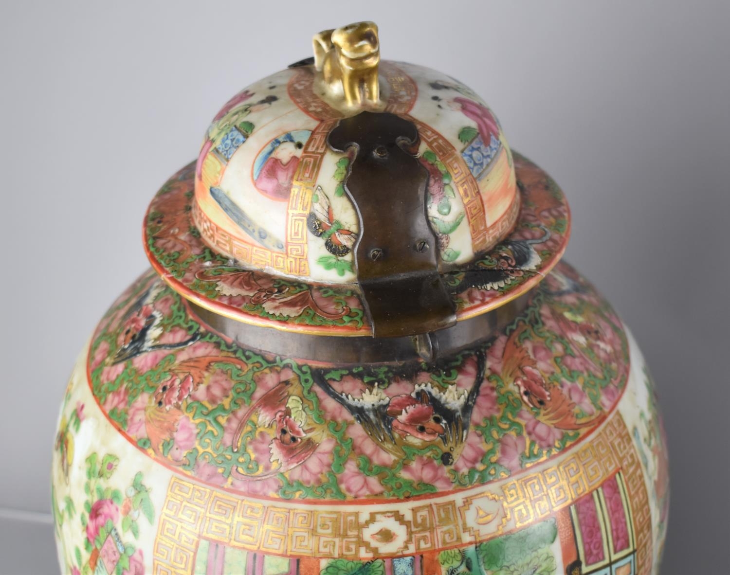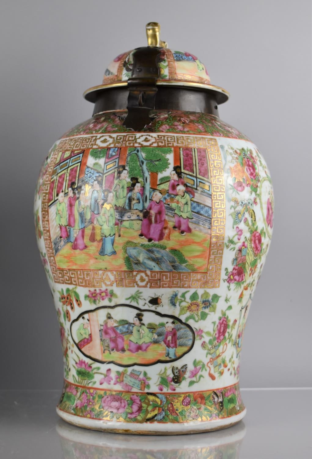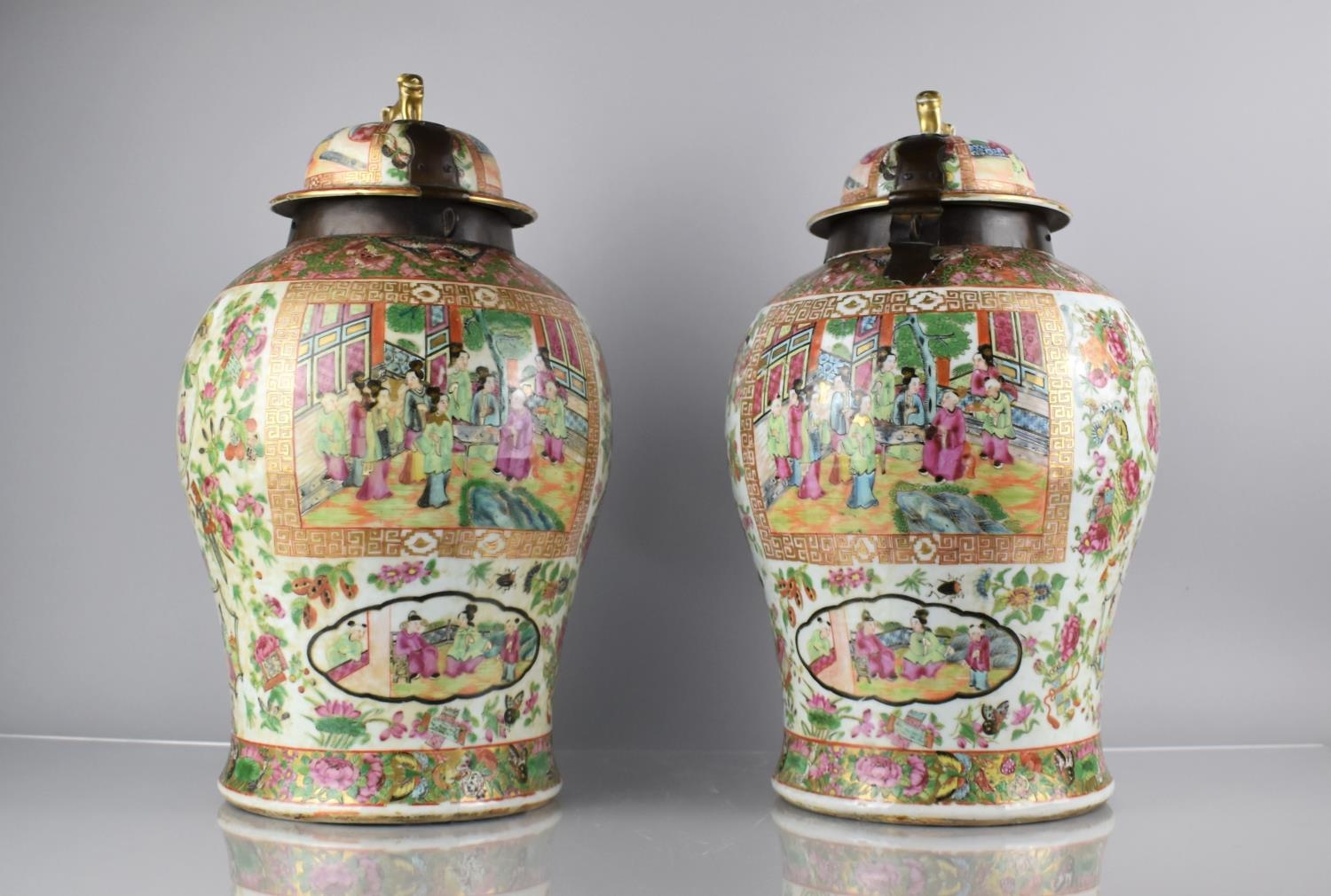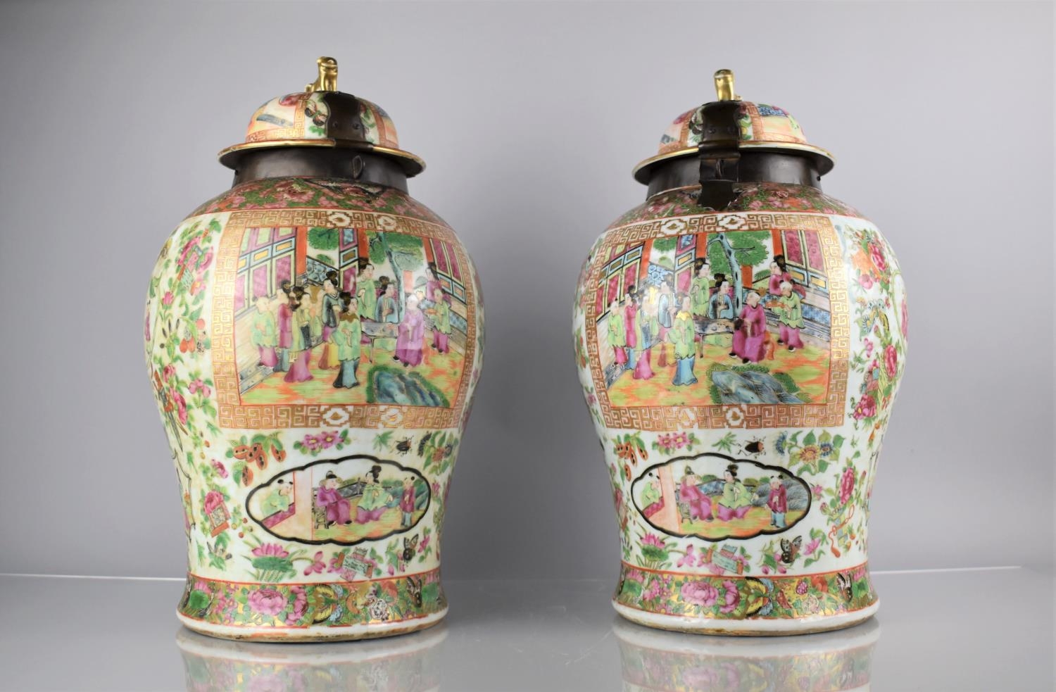 A Large Pair of 18th/19th Century Qing Dynasty Chinese Porcelain Vases Decorated in the Famille Rose Palette in the Usual Export Manner with Figural Court Scene Cartouches, on a Ground of Precious Objects, Insects and Flowers, the Top Band Trim Incorporating Bats, the Lids with Bronze Mounts, and Temple Lion Finials Enriched with Gilt, 43cm high. Condition: Not Perfect Order With Restoration To Both