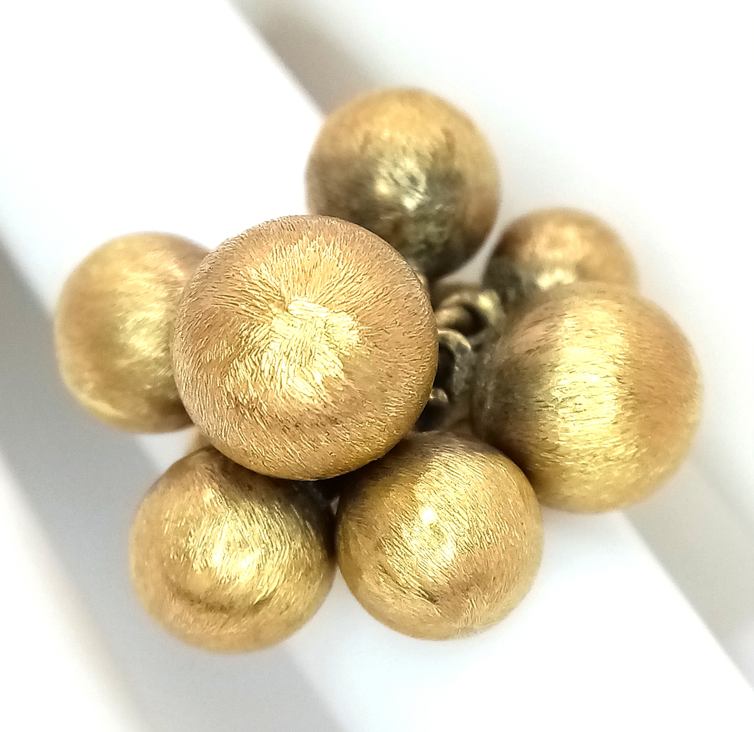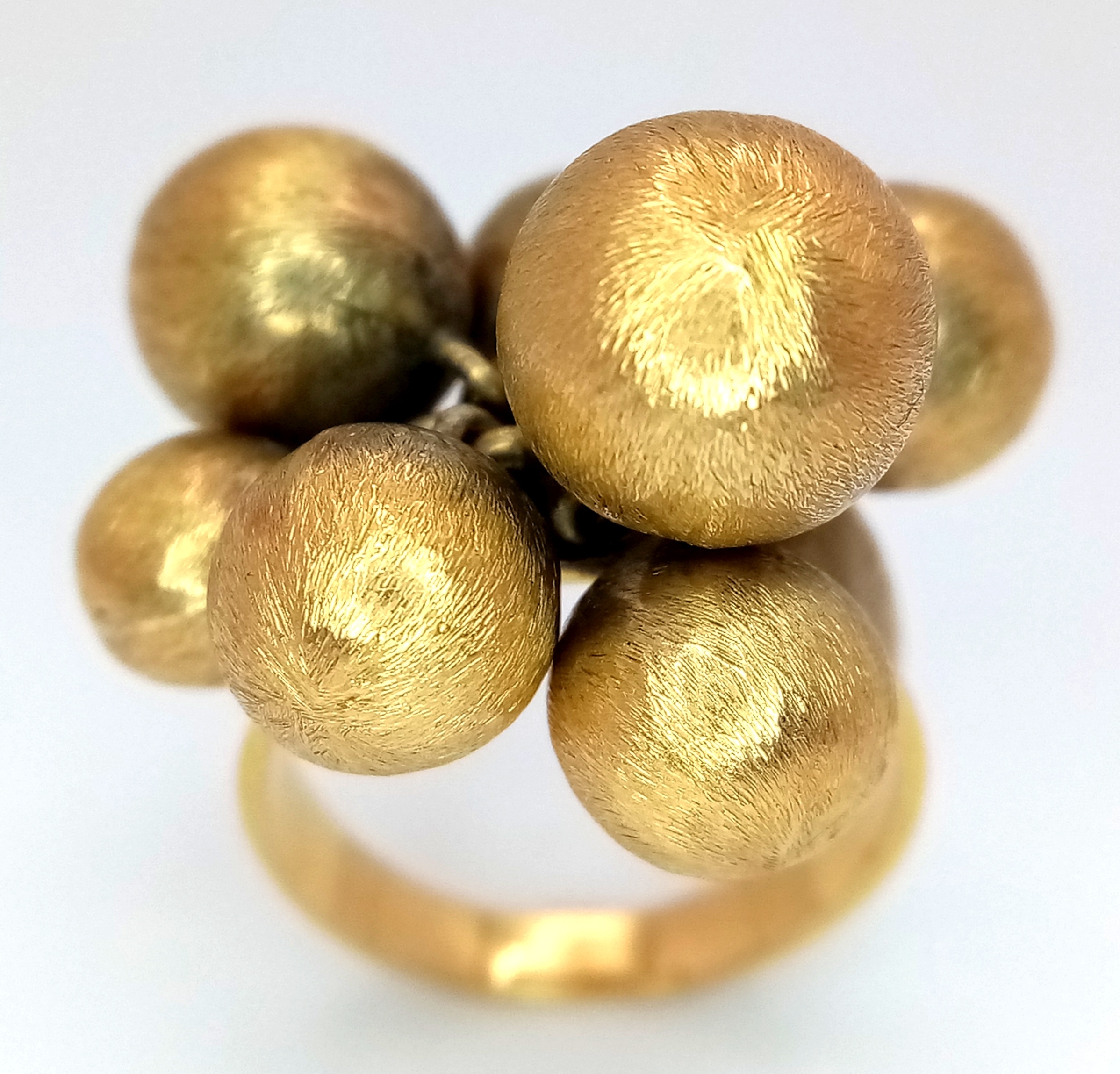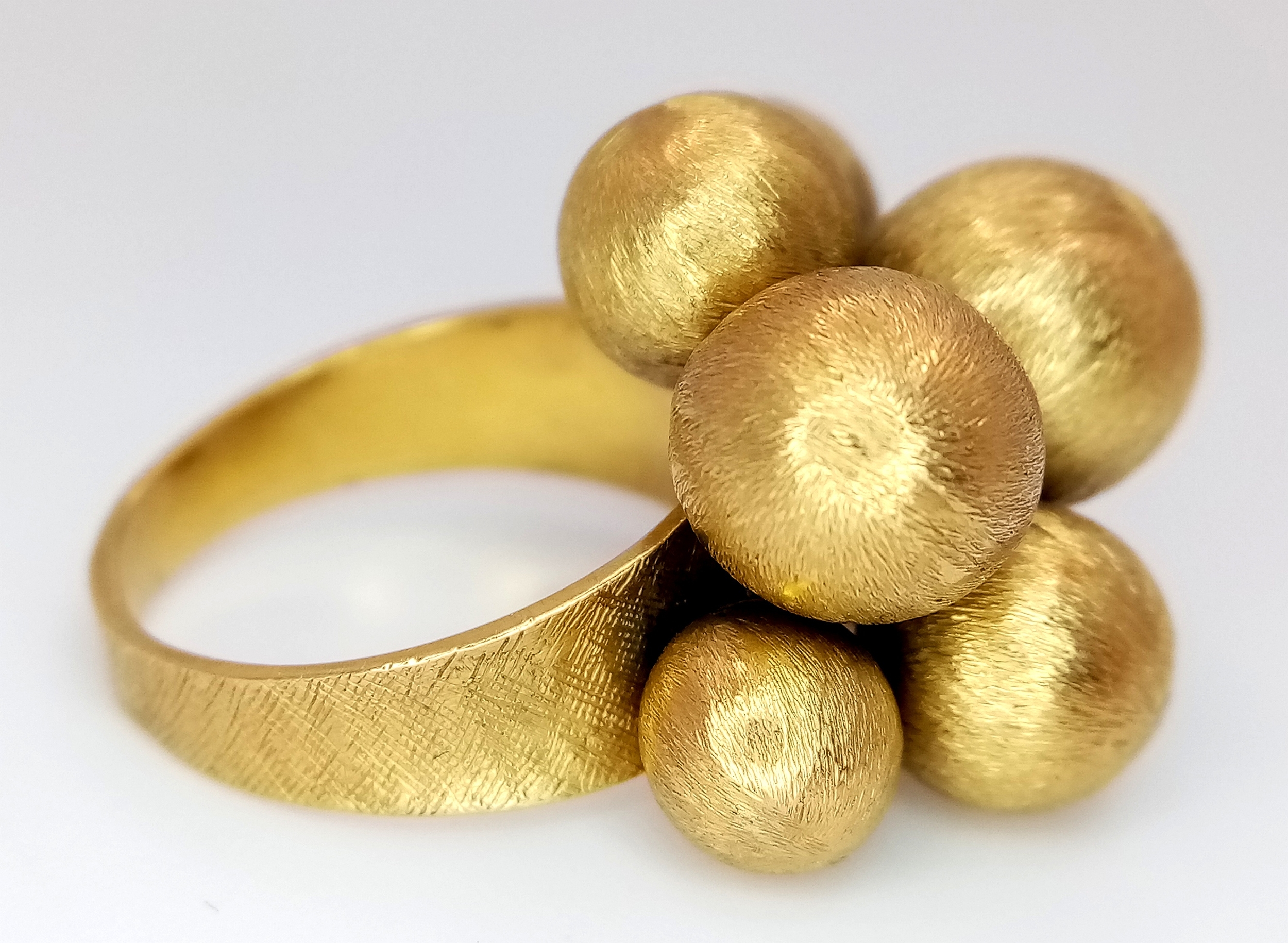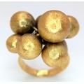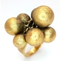 An 18K Yellow Gold Ornate Ball Ring. Different sized brushed gold balls. Size L. 8.45g.