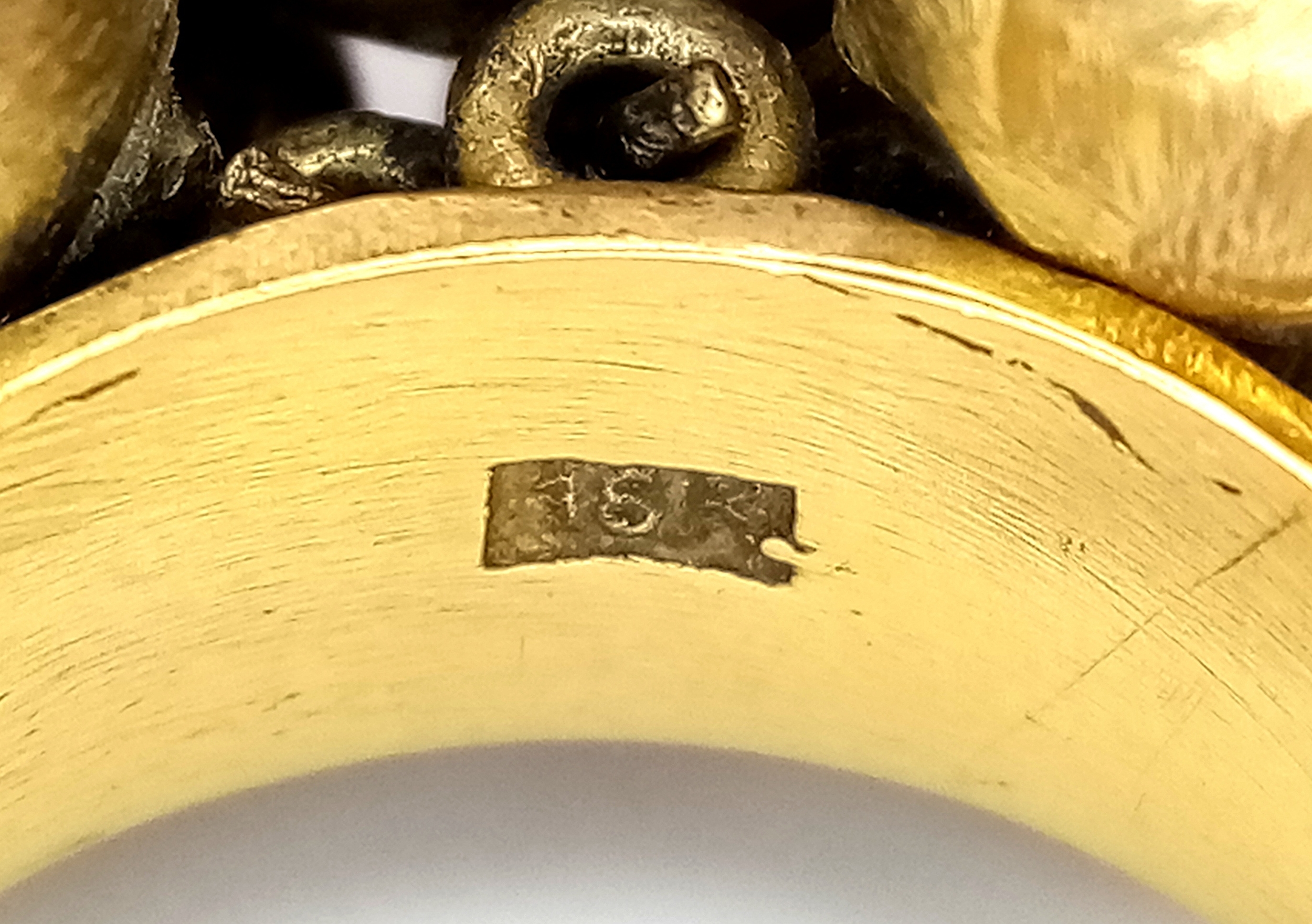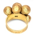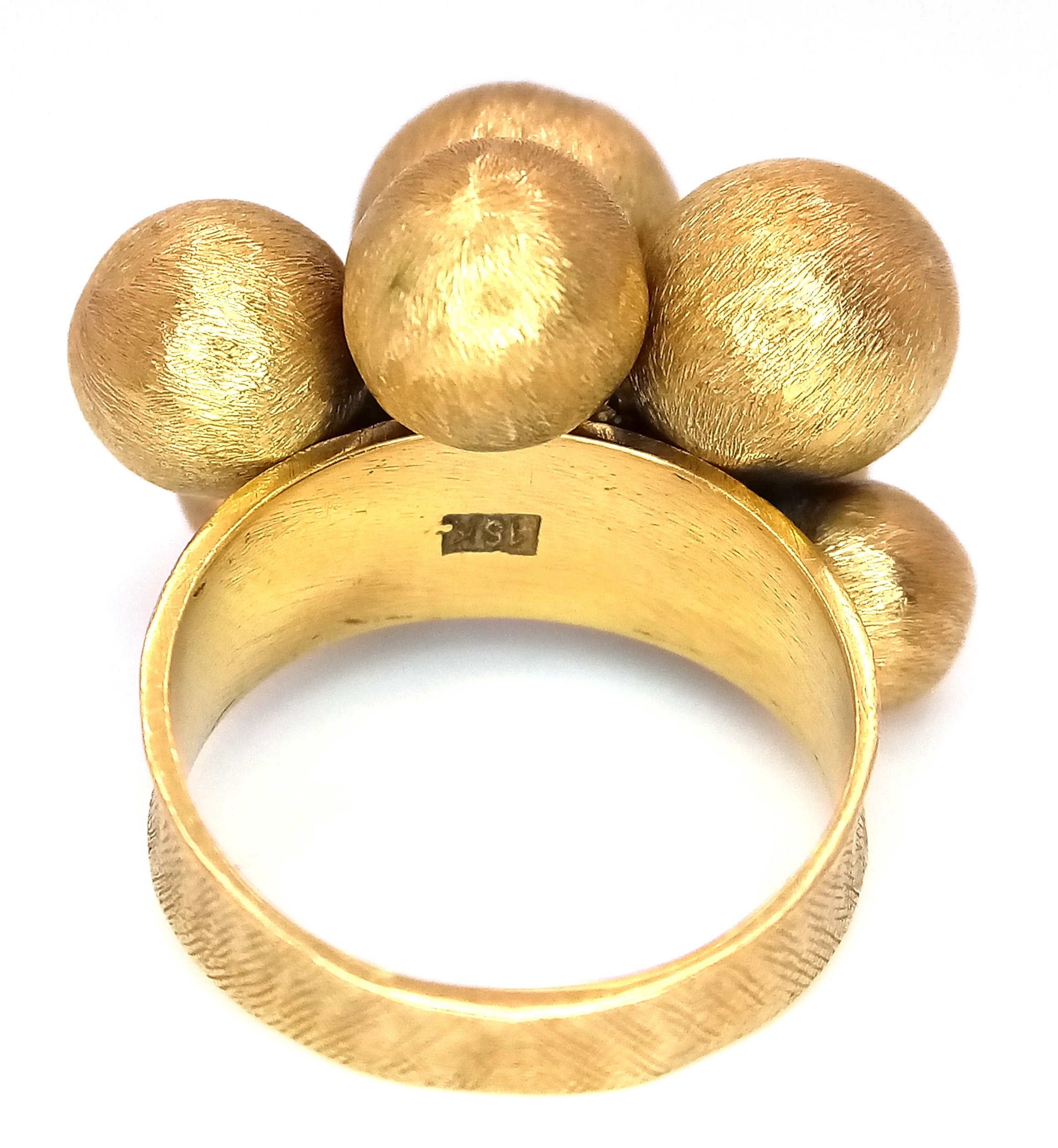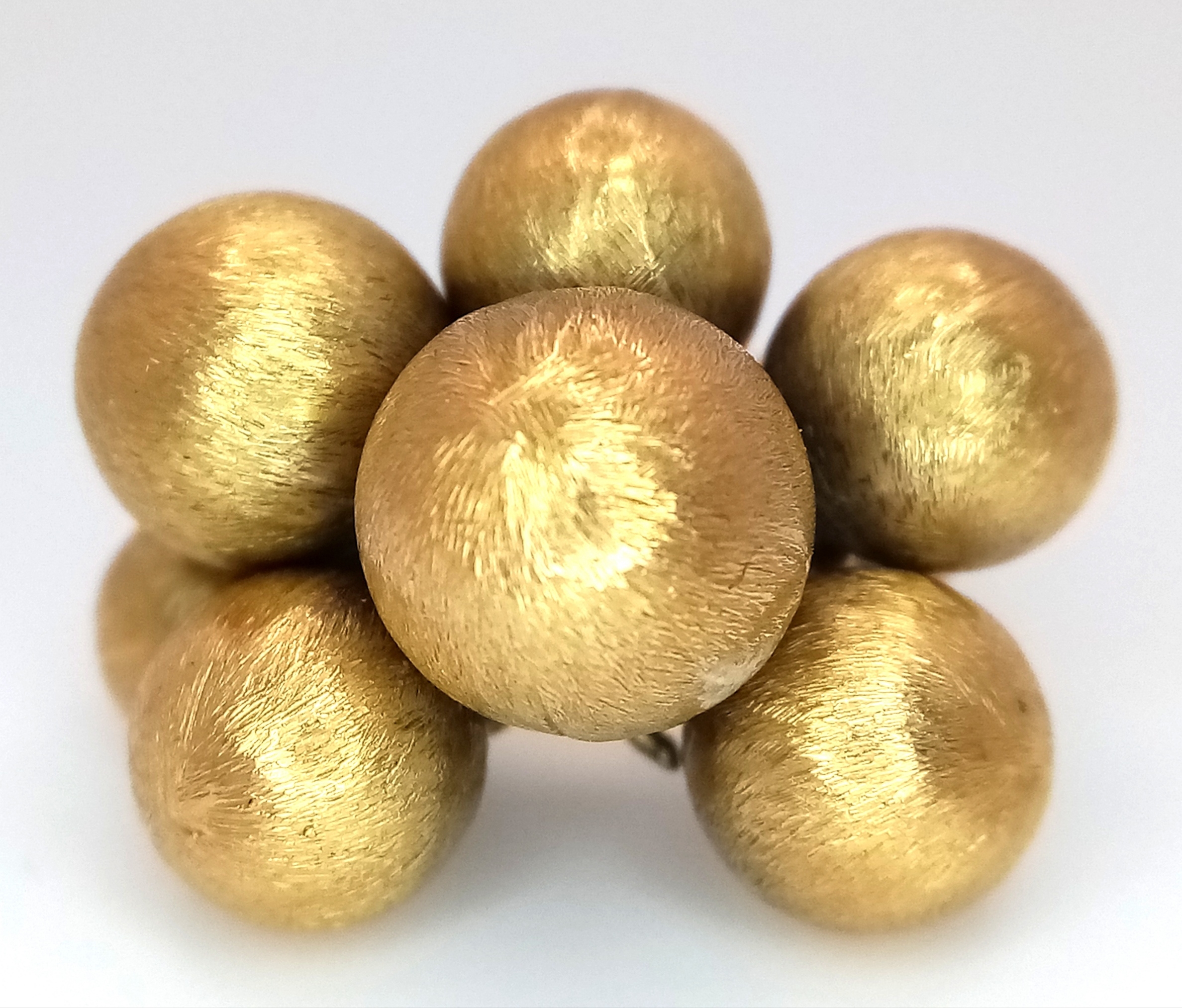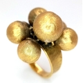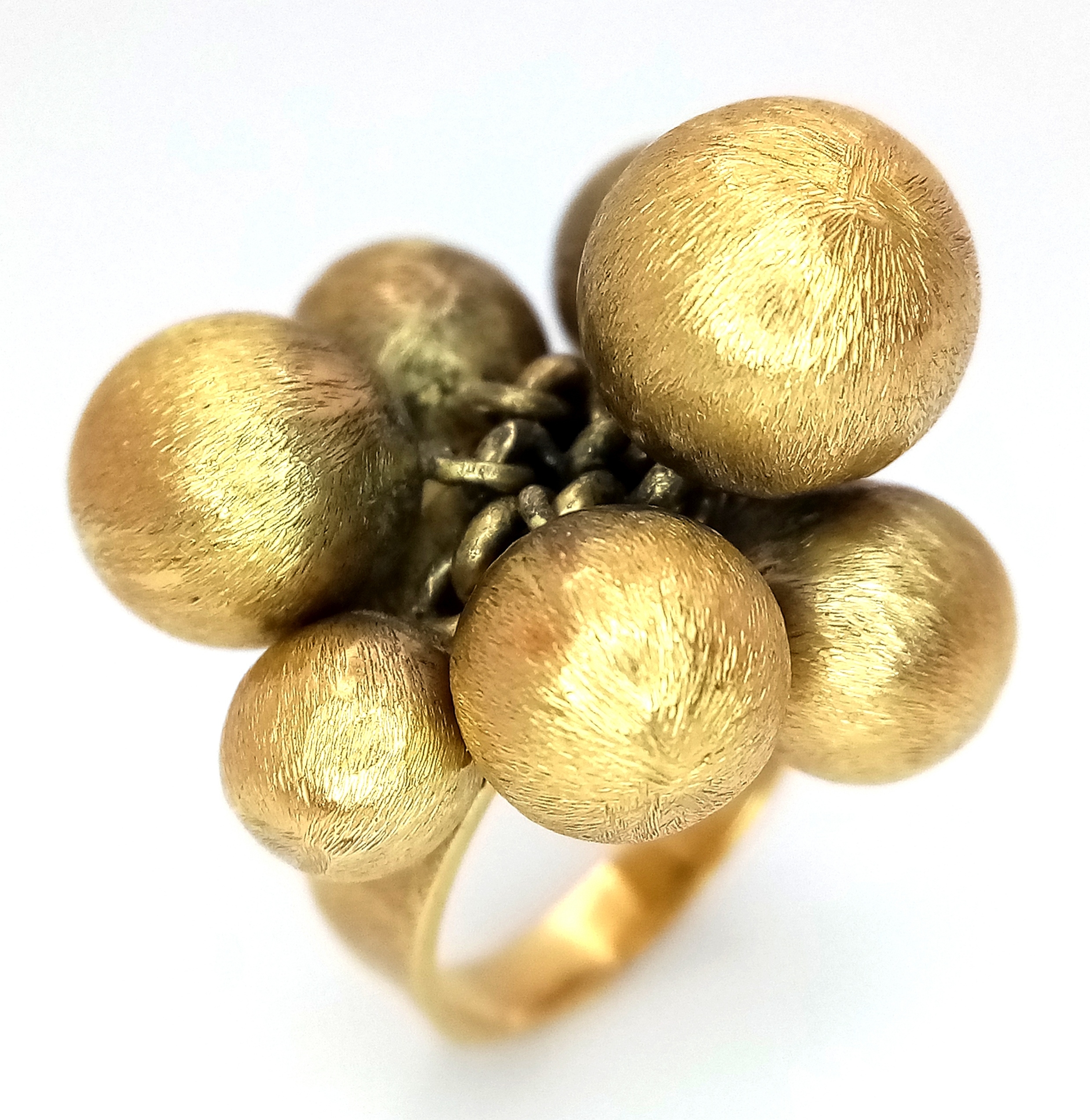An 18K Yellow Gold Ornate Ball Ring. Different sized brushed gold balls. Size L. 8.45g.