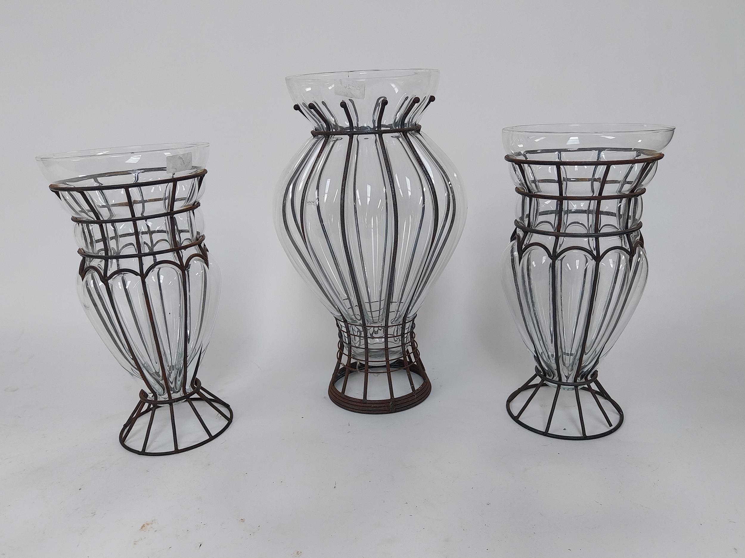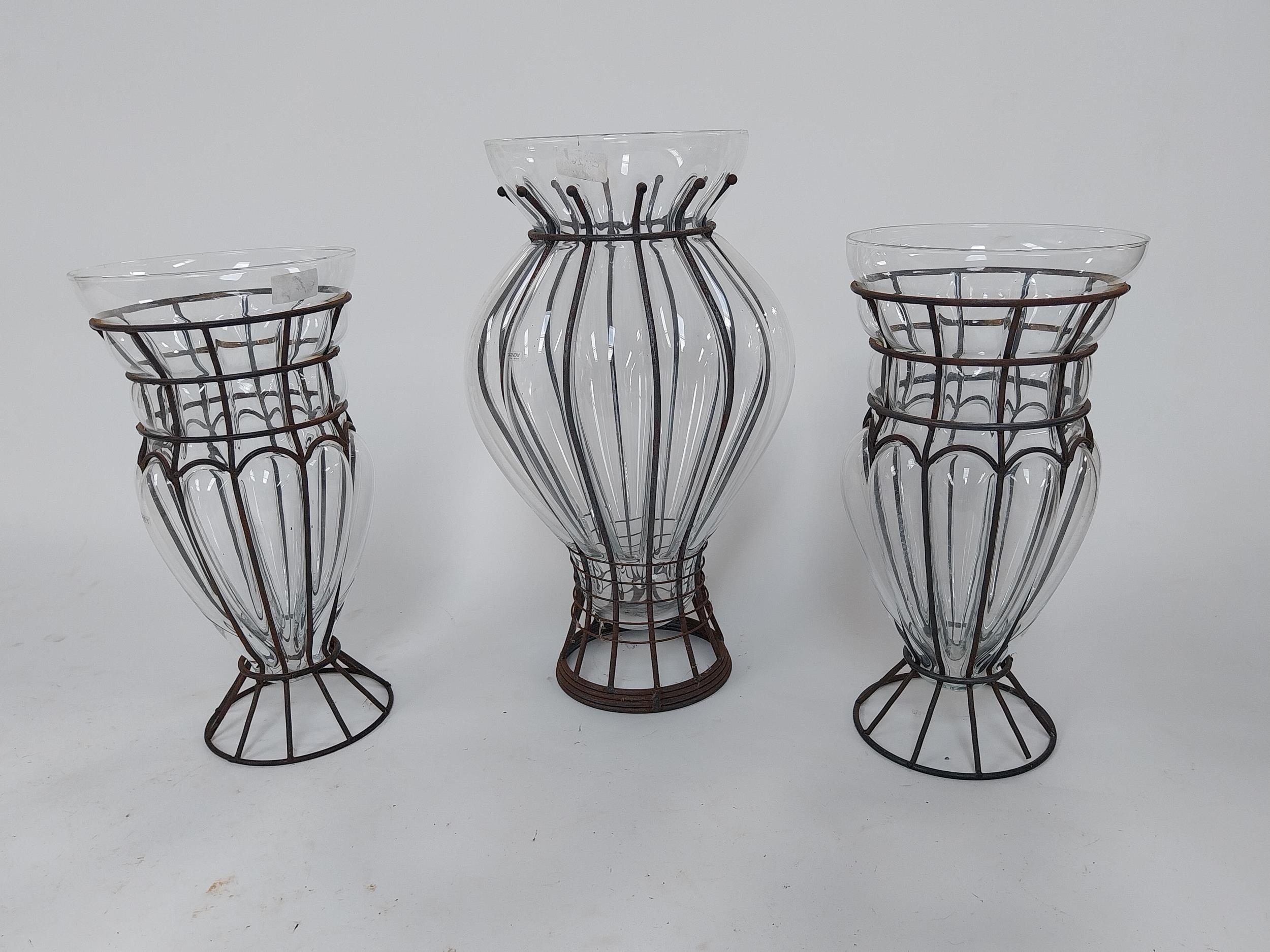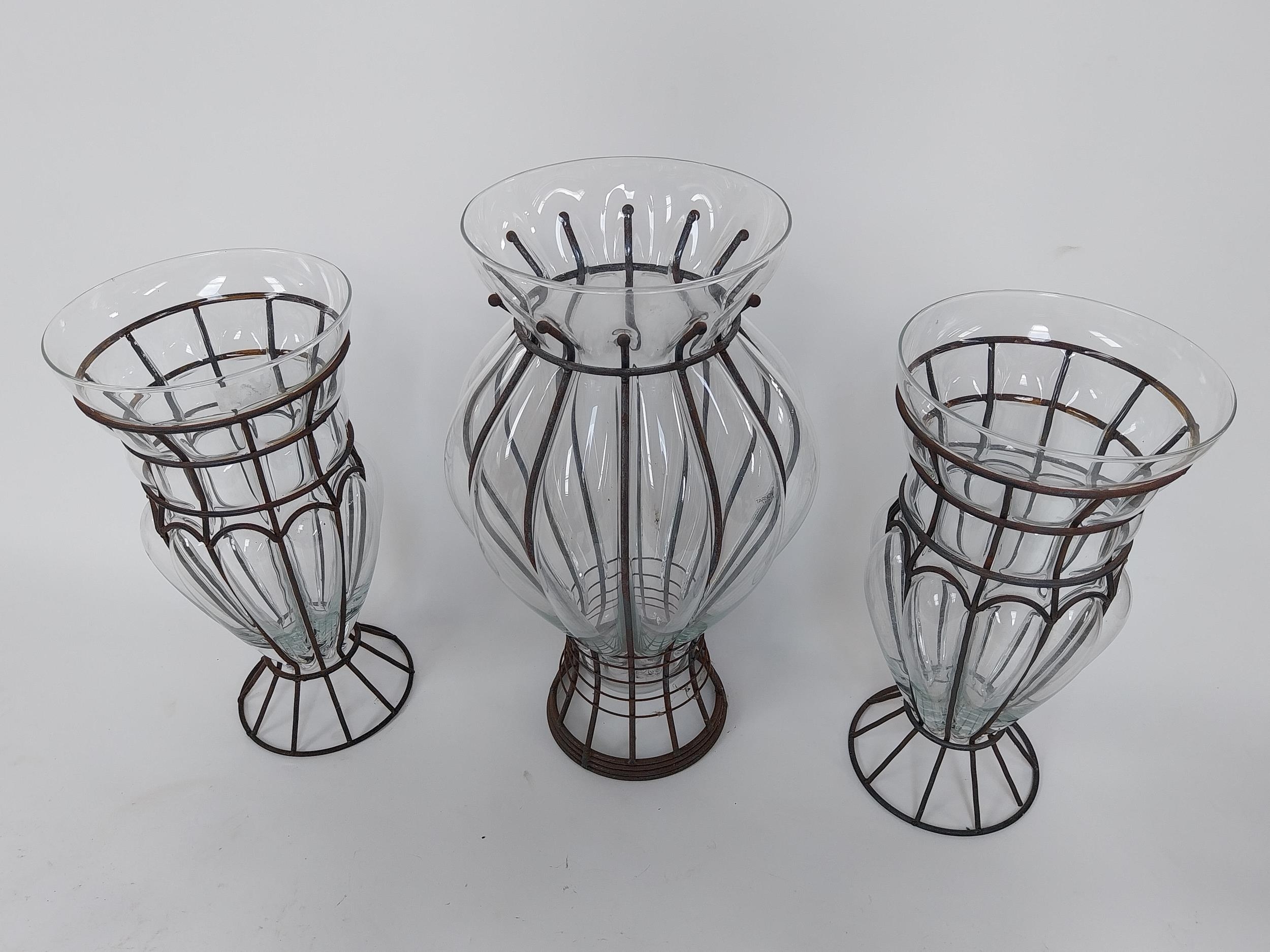 Three vintage glass flower vases in metal surrounds {49 cm H x 26 cm Dia. AND 40 cm H x 20 cm Dia.}.