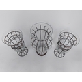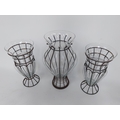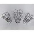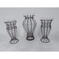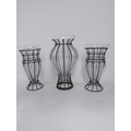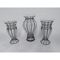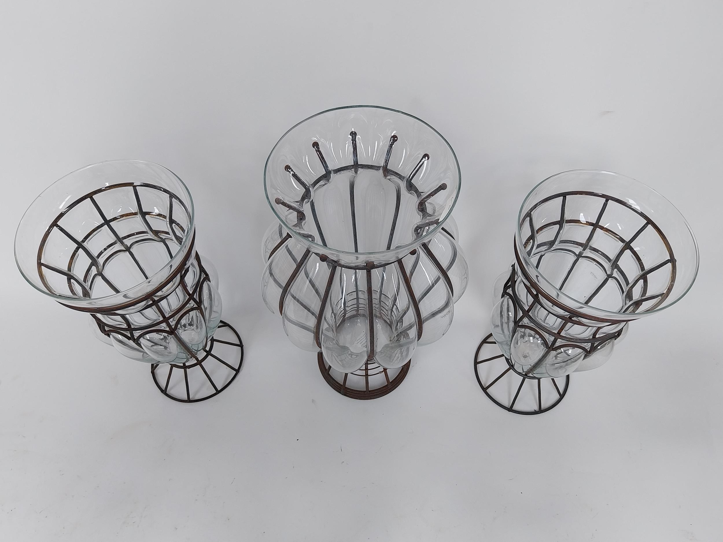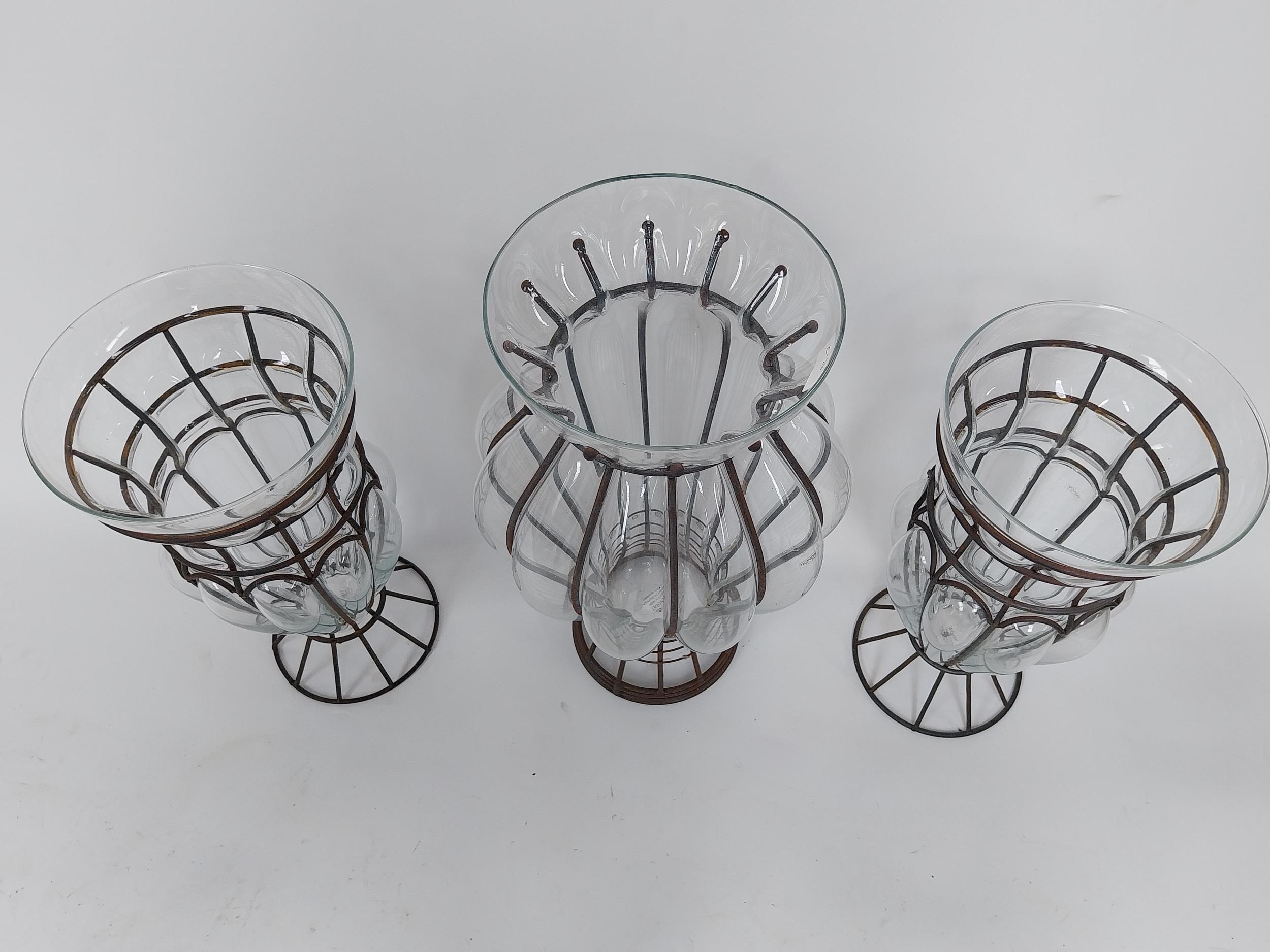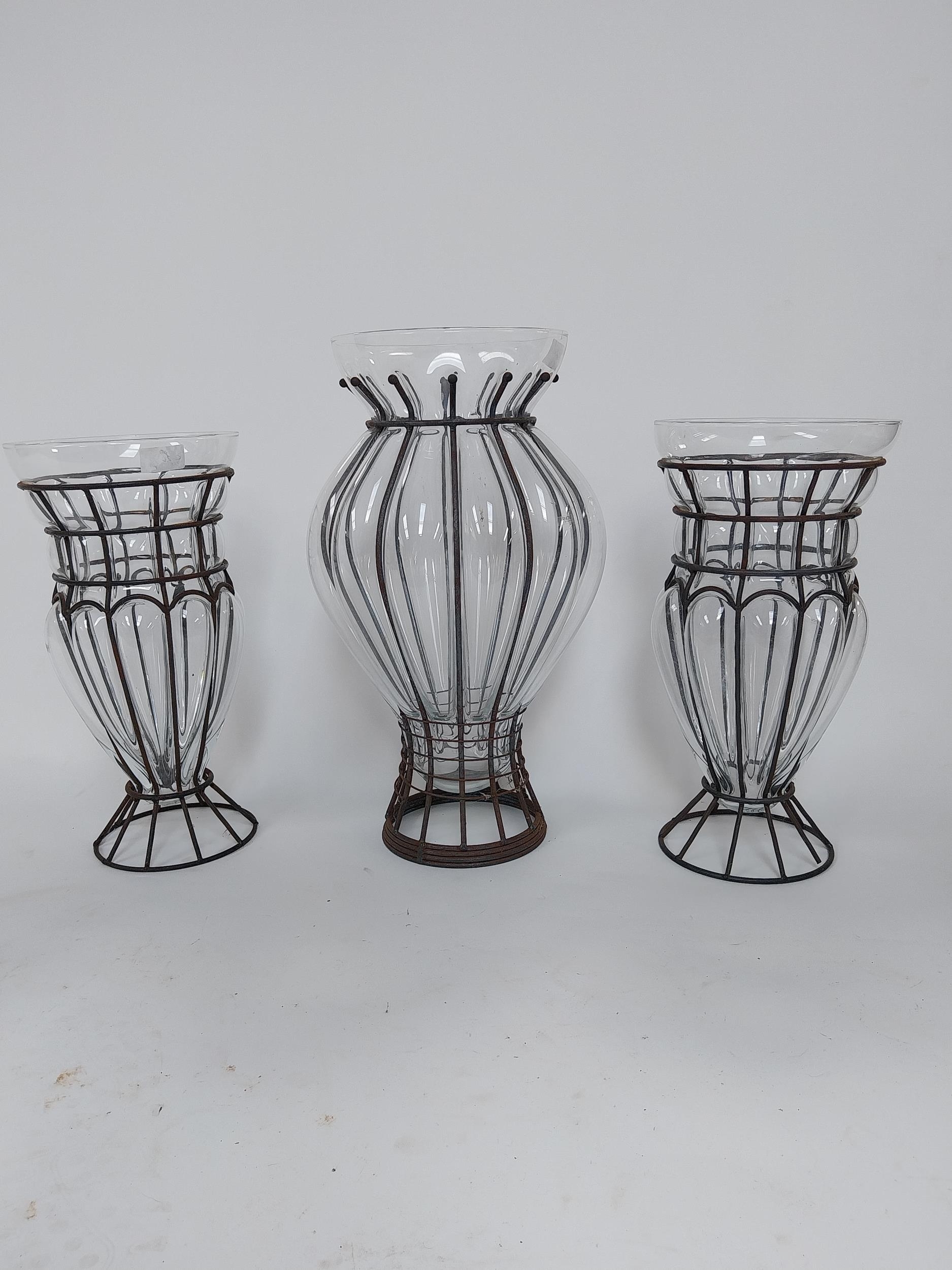 Three vintage glass flower vases in metal surrounds {49 cm H x 26 cm Dia. AND 40 cm H x 20 cm Dia.}.