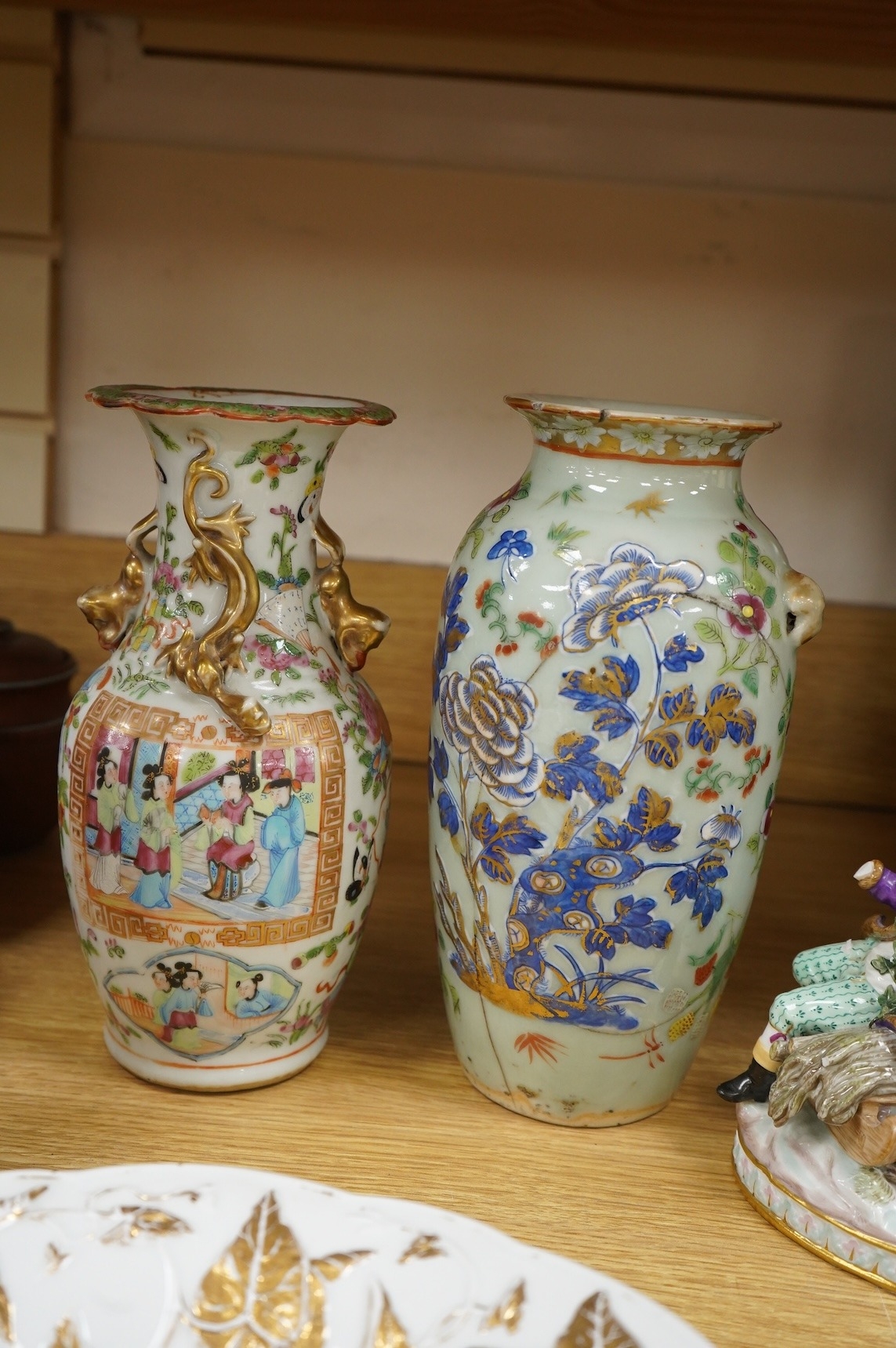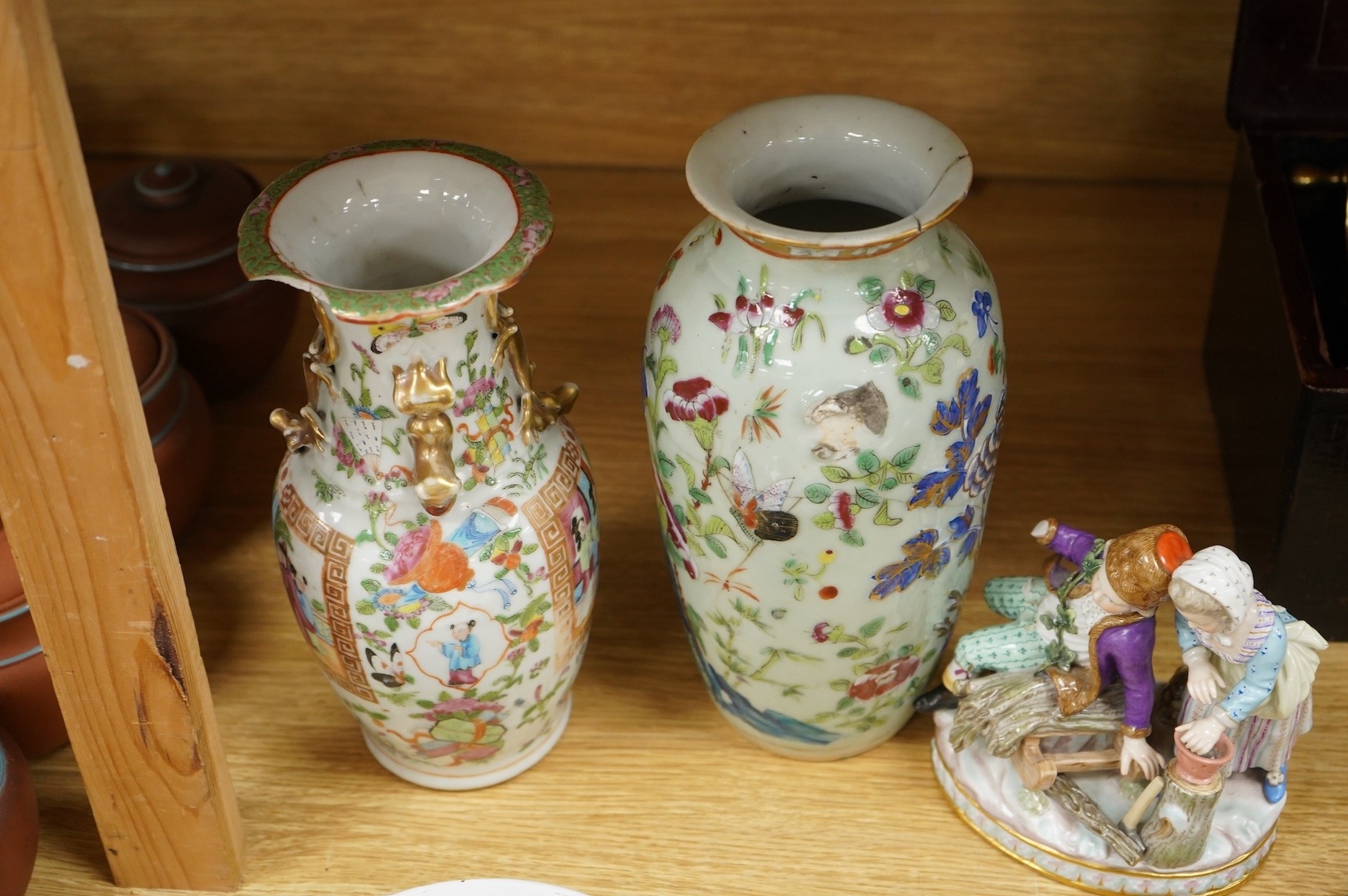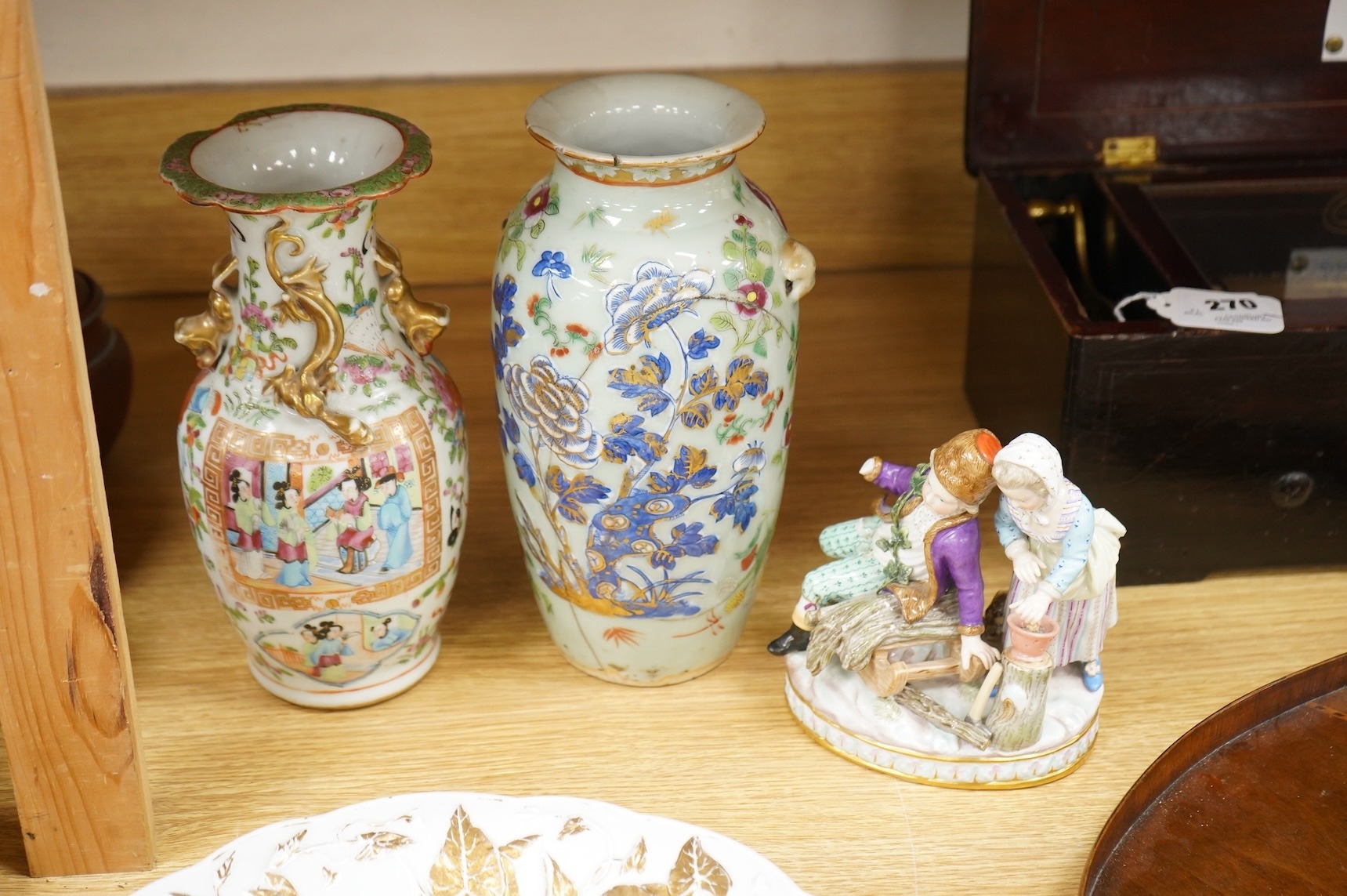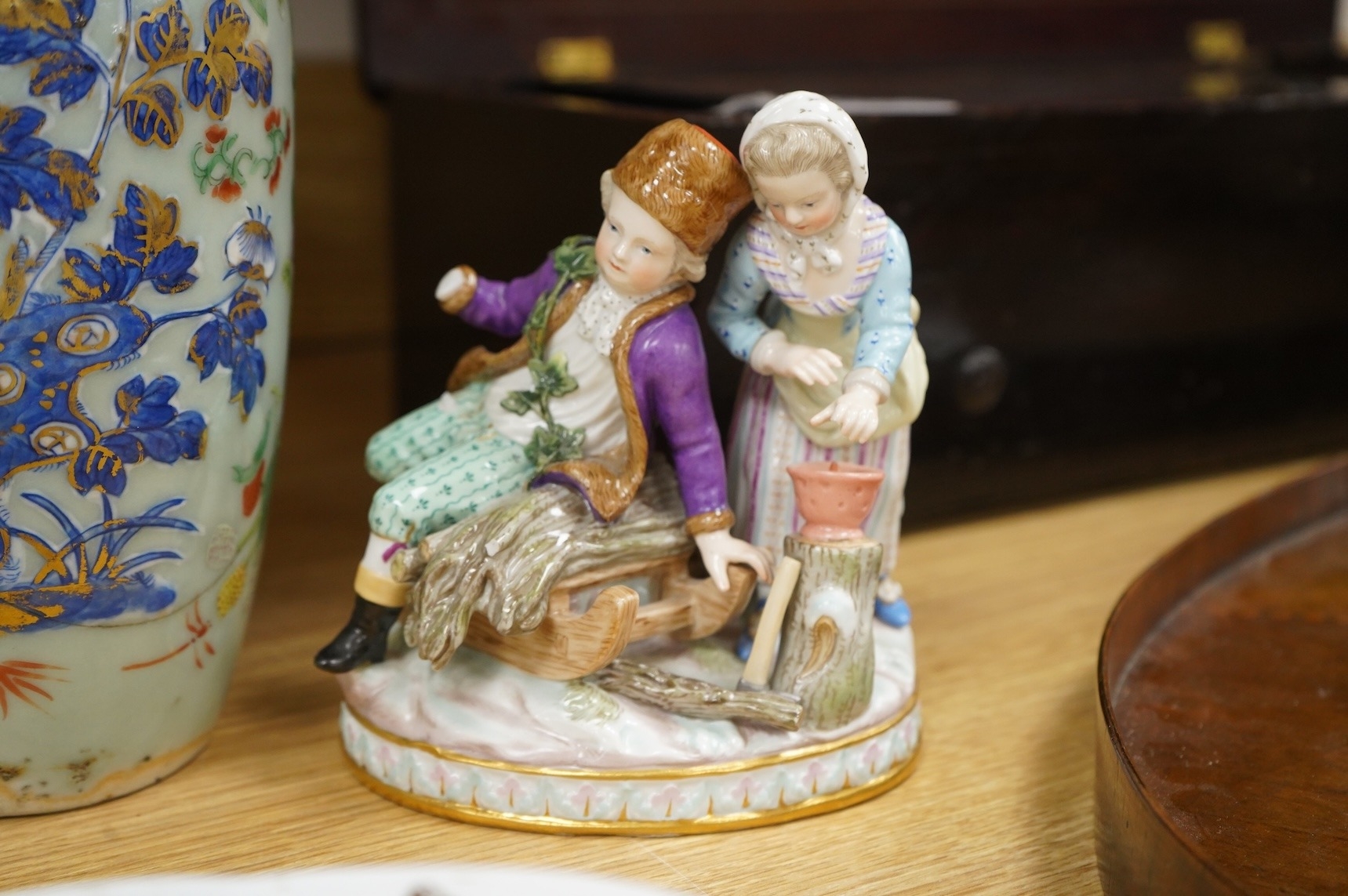 A Meissen relief-moulded and gilded dish, a Meissen figure group emblematic of Winter and two 19th century Chinese porcelain vases, dish 29cm