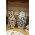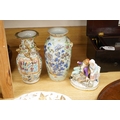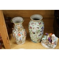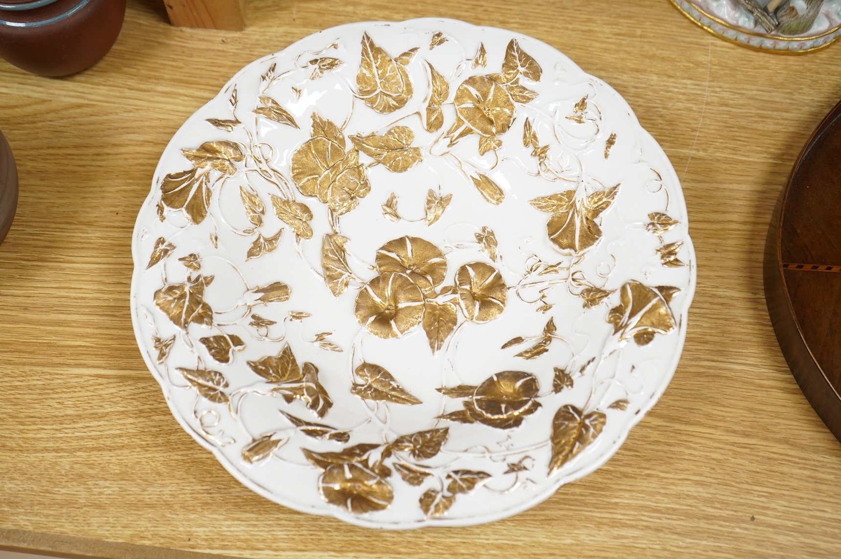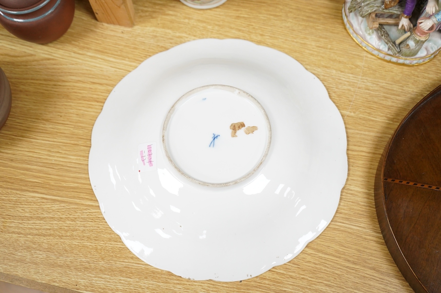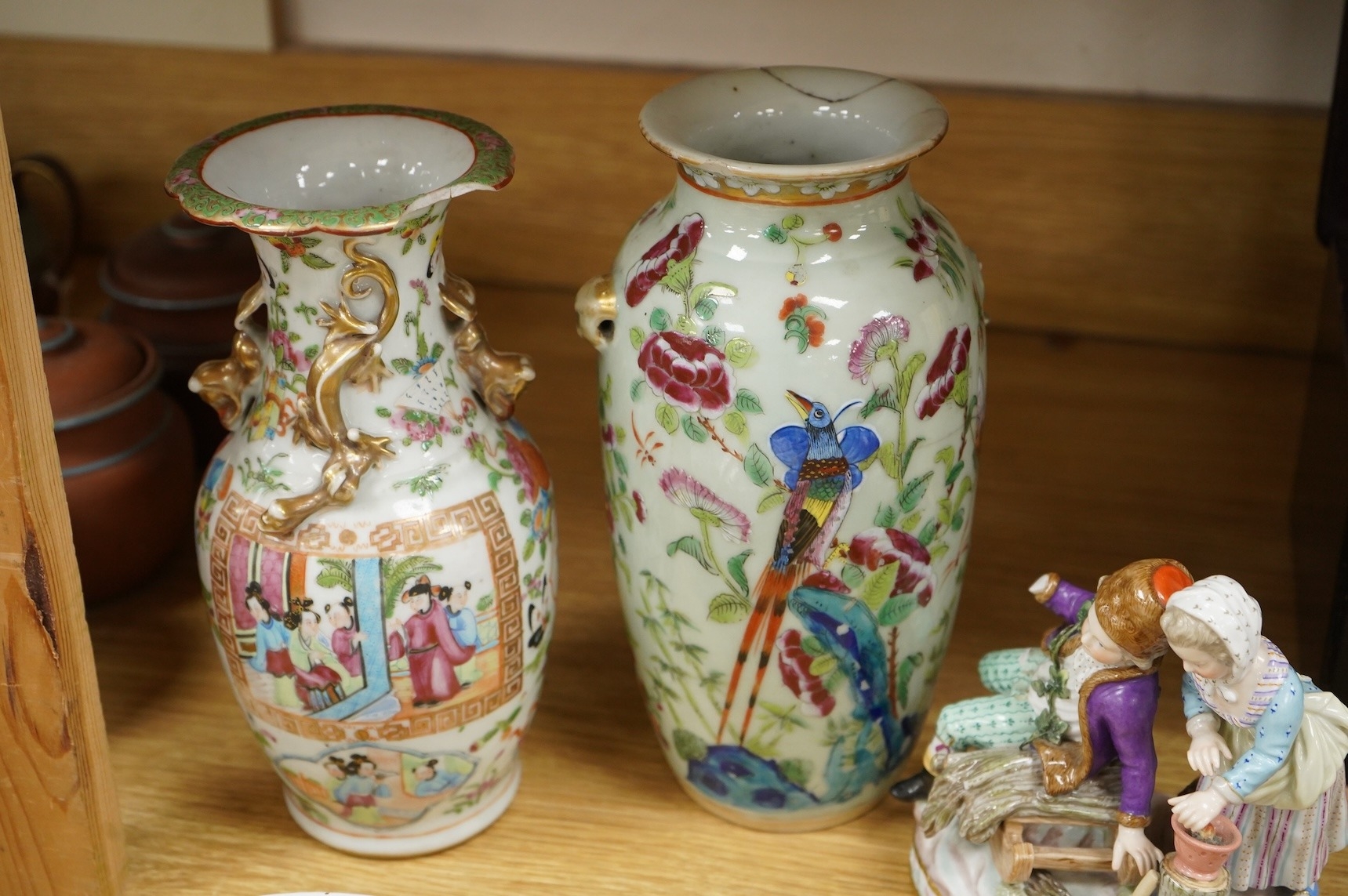 A Meissen relief-moulded and gilded dish, a Meissen figure group emblematic of Winter and two 19th century Chinese porcelain vases, dish 29cm