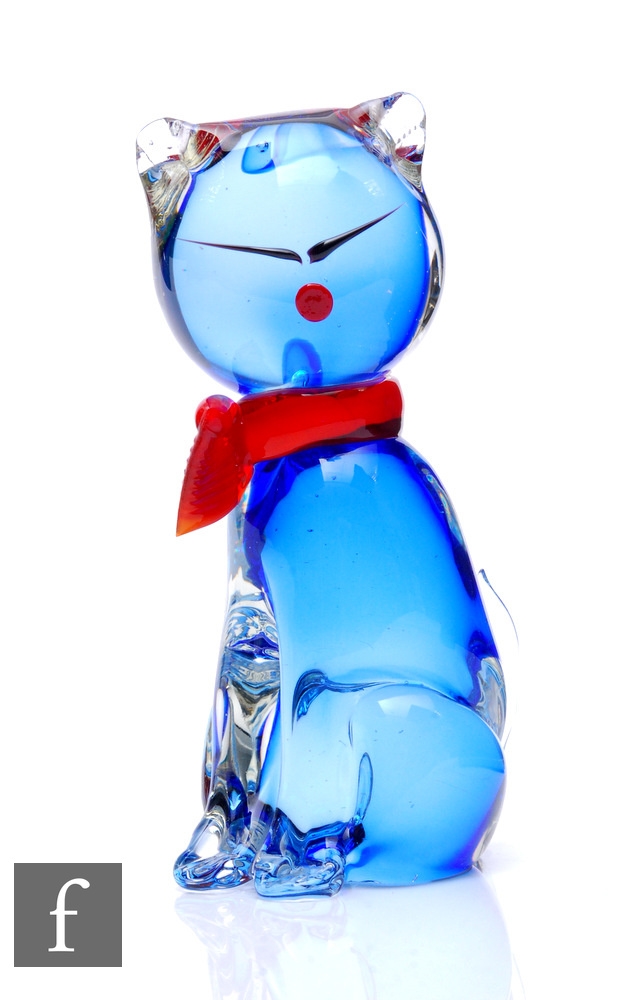 Antonio da Ros - Cenedese - A post war Murano glass sculpture modelled as a stylised cat, the blue core cased in clear with applied details, height 18cm.