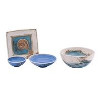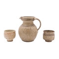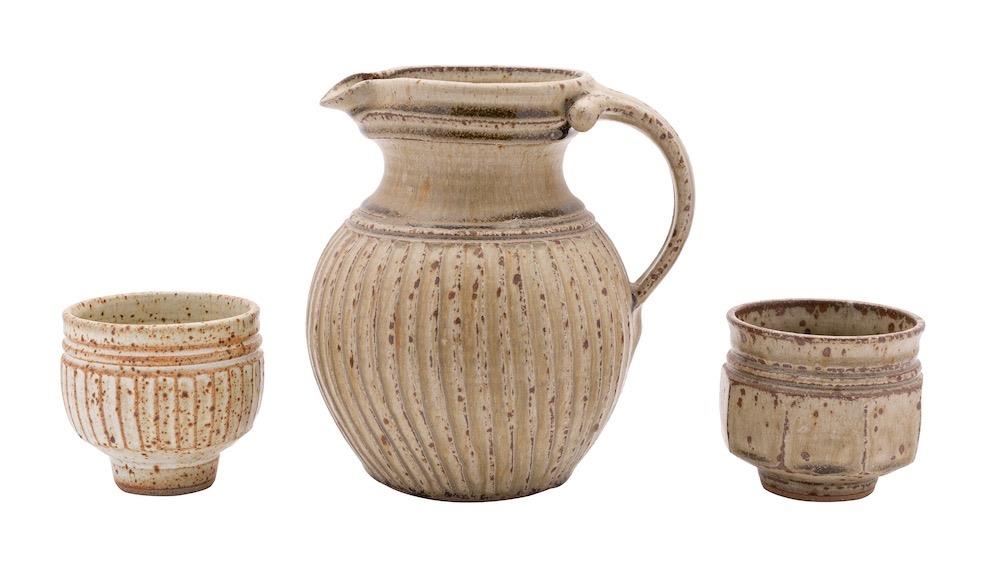 *Andrew Hague [b. 1948] a stoneware jug and matching small bowl both decorated with vertical groves under ash glazes together with a small cut sided bowl by the same hand, impressed Askrigg Pottery seals, jug 19.5cm high.