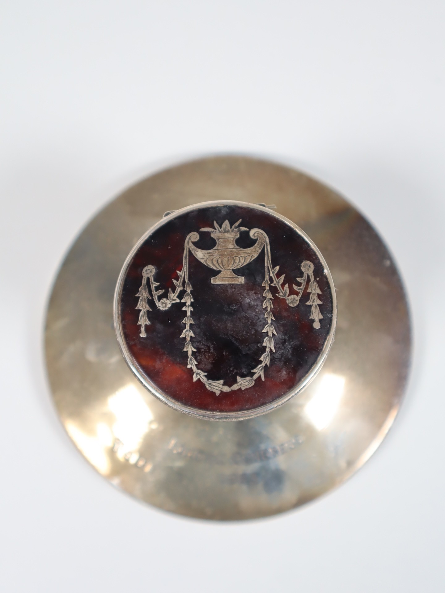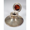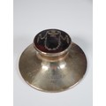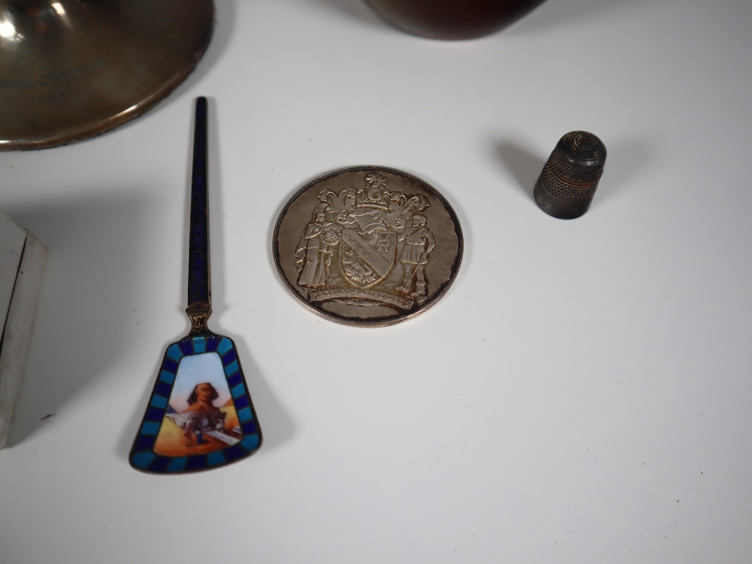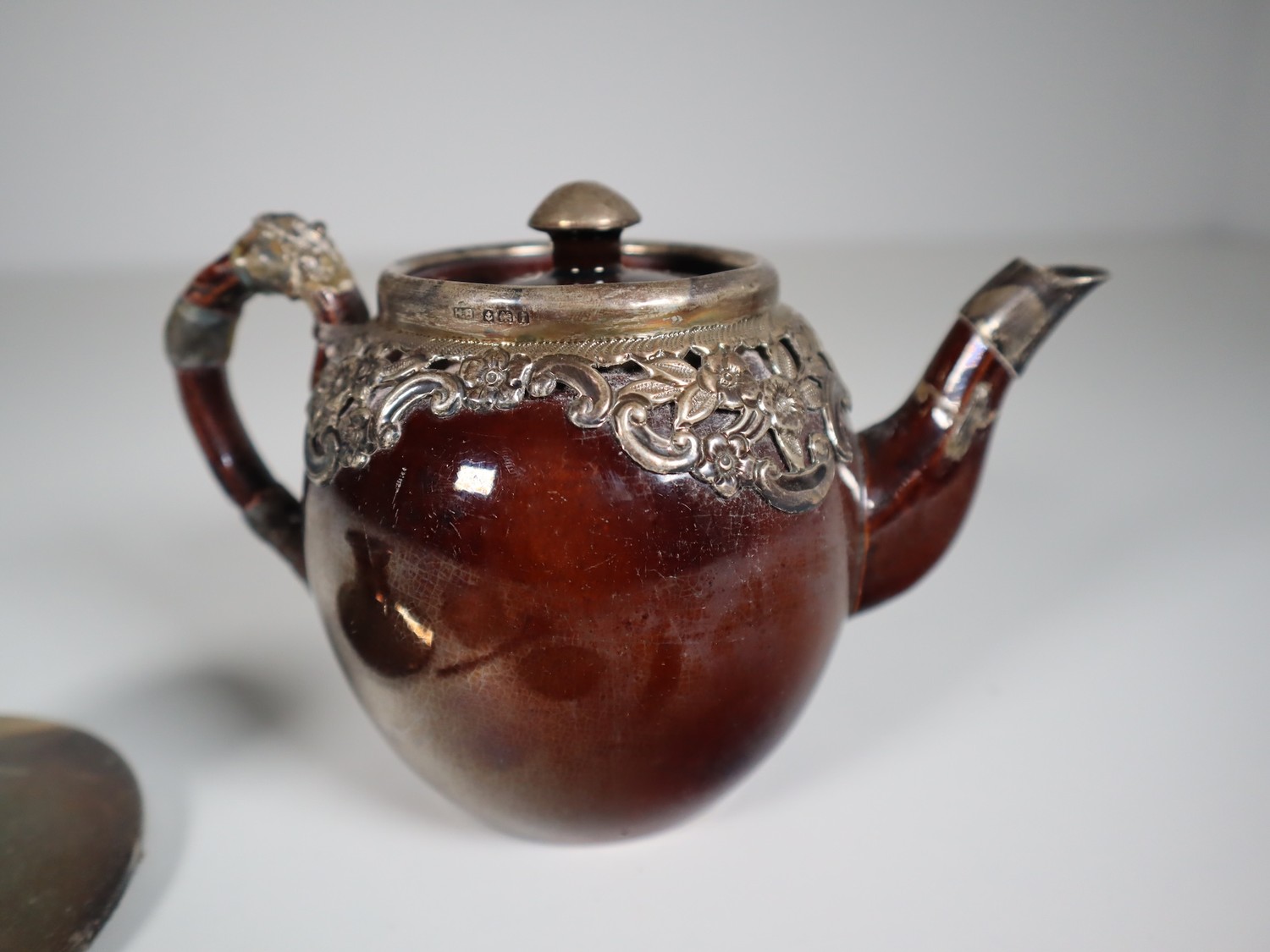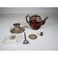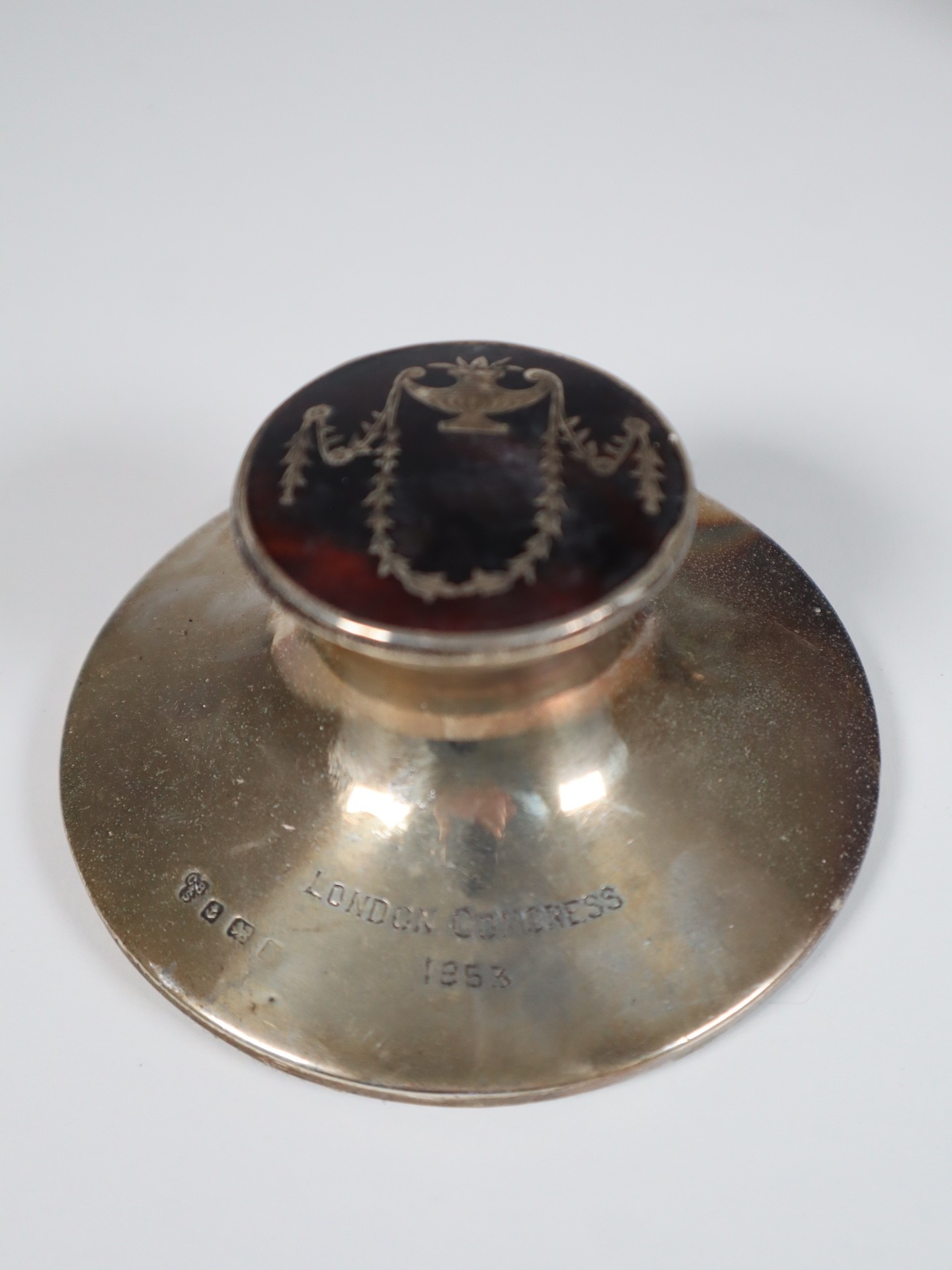 Sterling Silver & Tortoise shell inkwell marked London Congress 1953, antique stoneware tea pot with sterling silver overlay, Sterling silver medal, earrings and 800 enamel Egyptian spoon