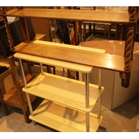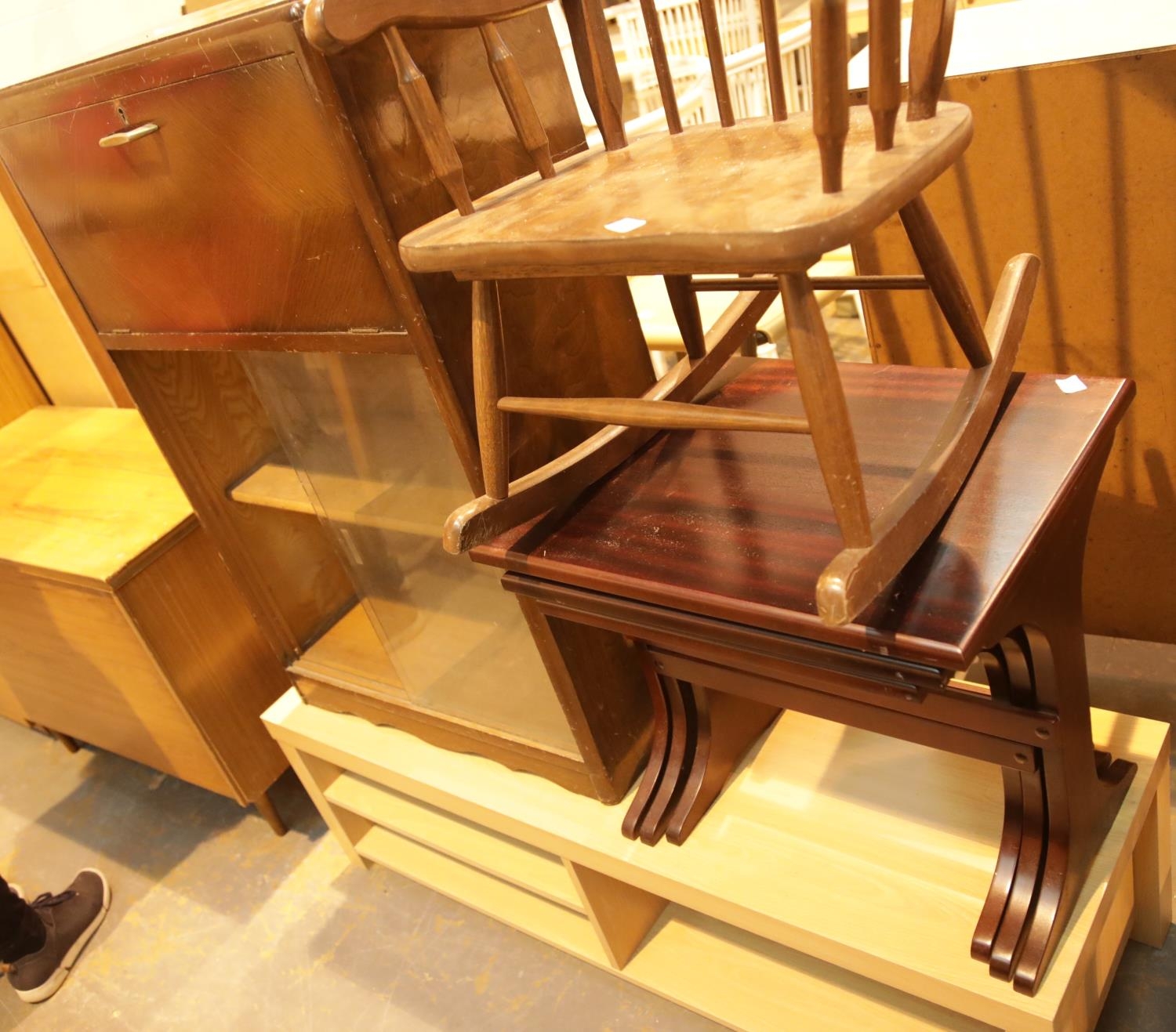 Nest of tables with TV table and a vintage bureau with lower display. This lot is not available for in-house P&P.