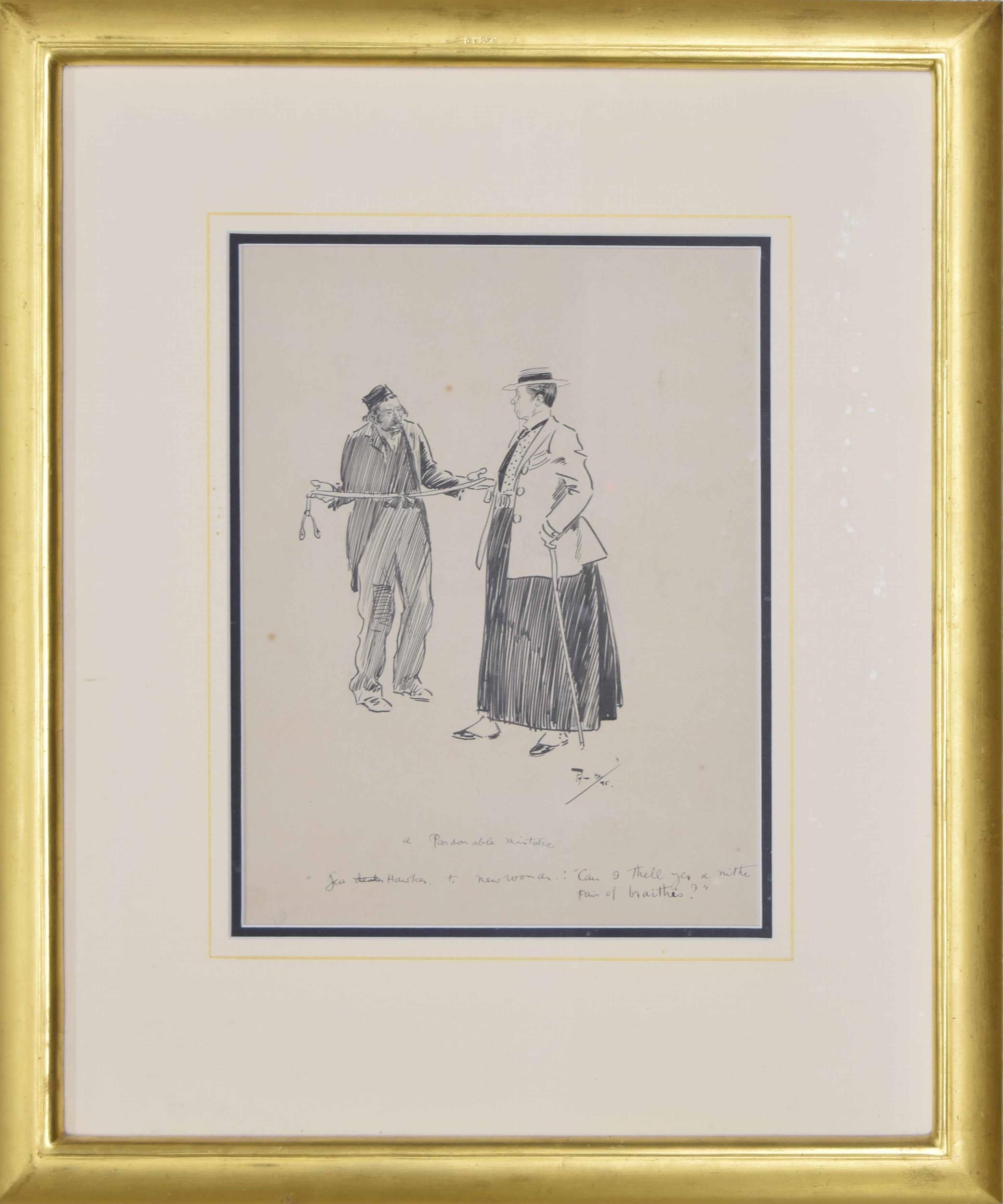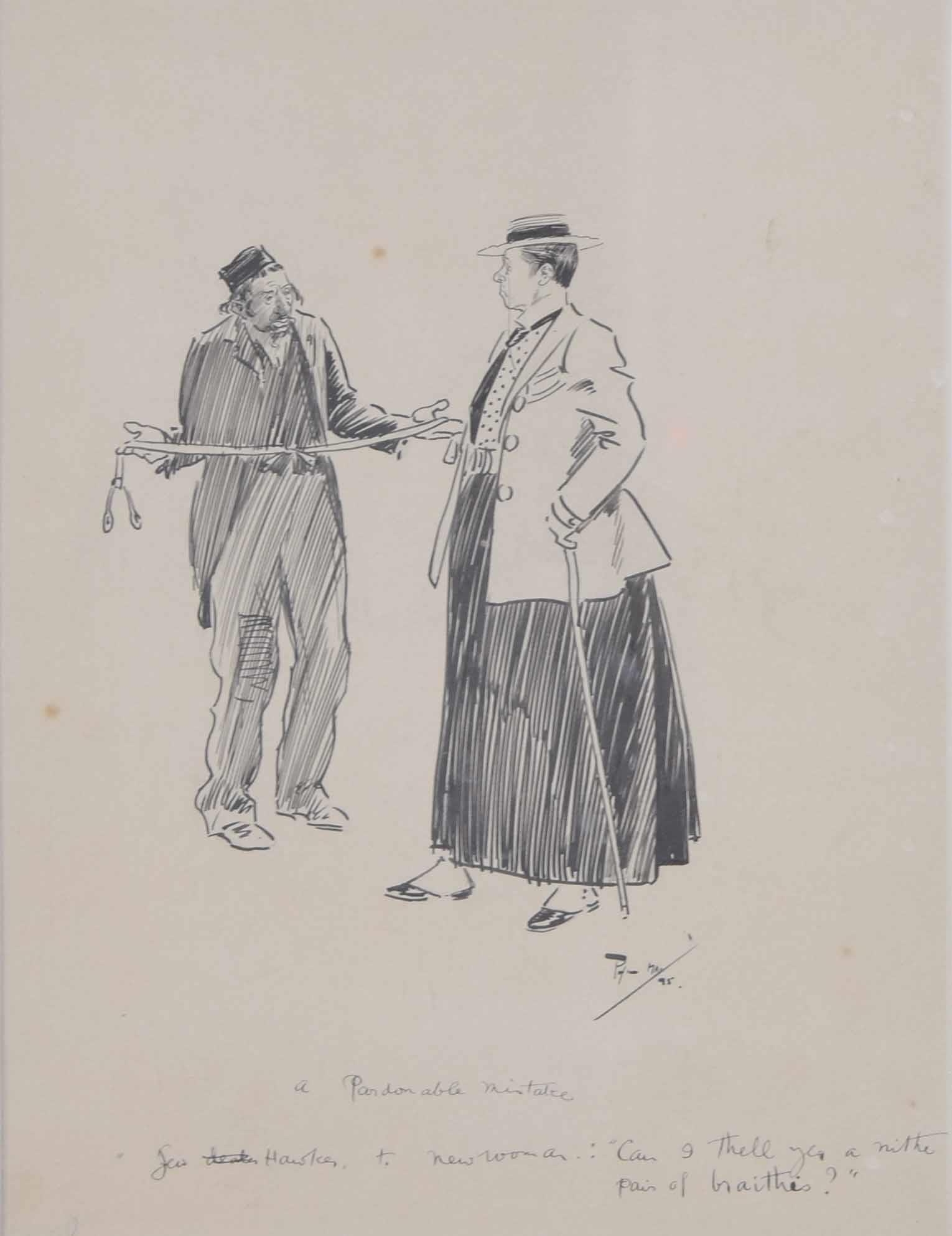 Phil May RI., RP., NEAC., (1864-1903) - "A Pardonable Mistake", signed, inscribed with the title together with a further inscription and dated 95 (1895), black and white pen and ink drawing, 11.5" x 8.75"
