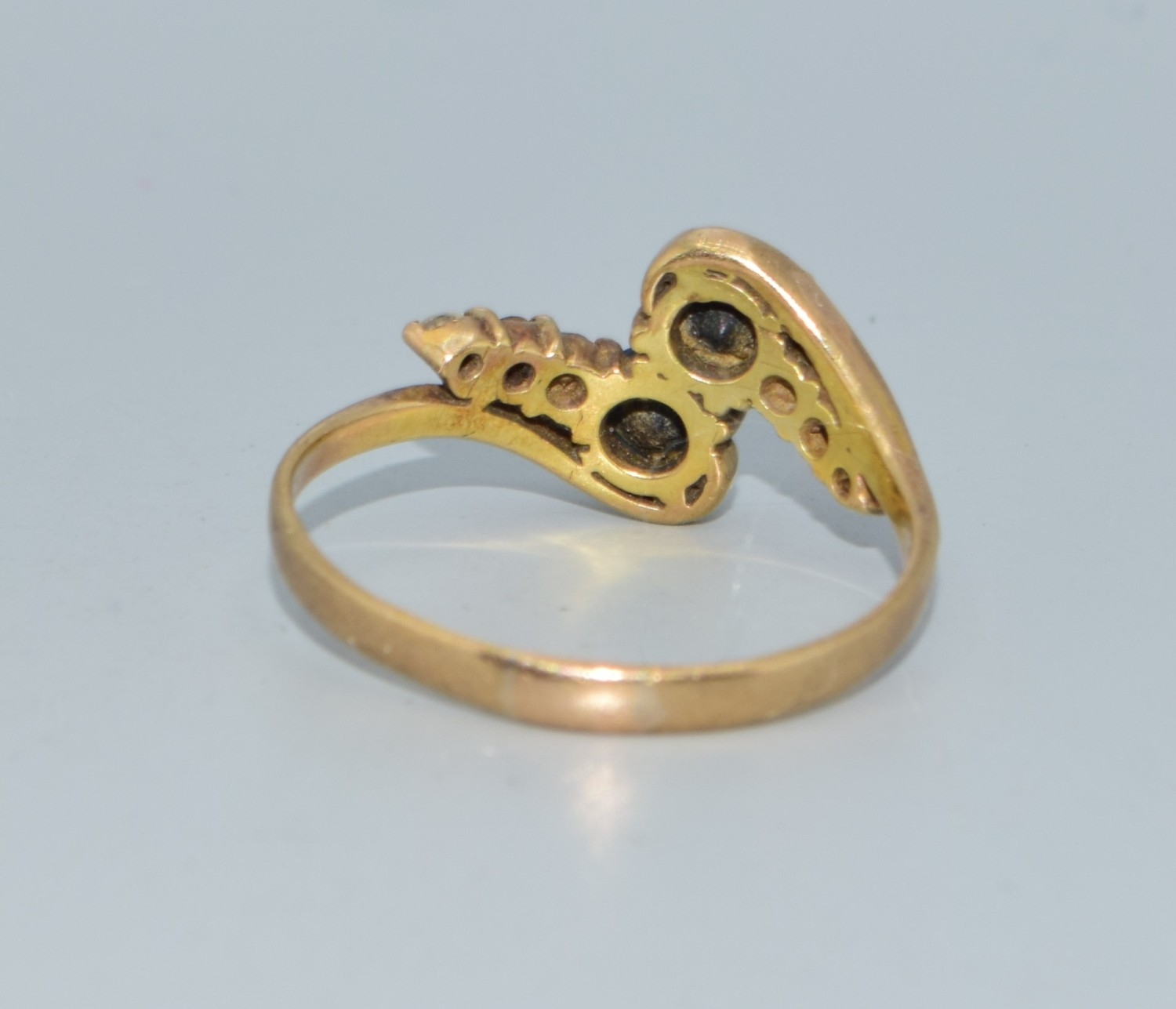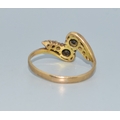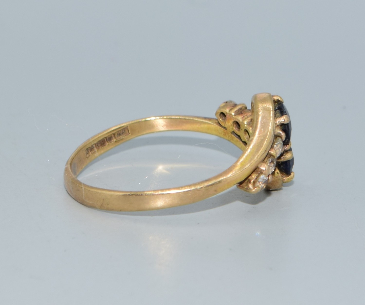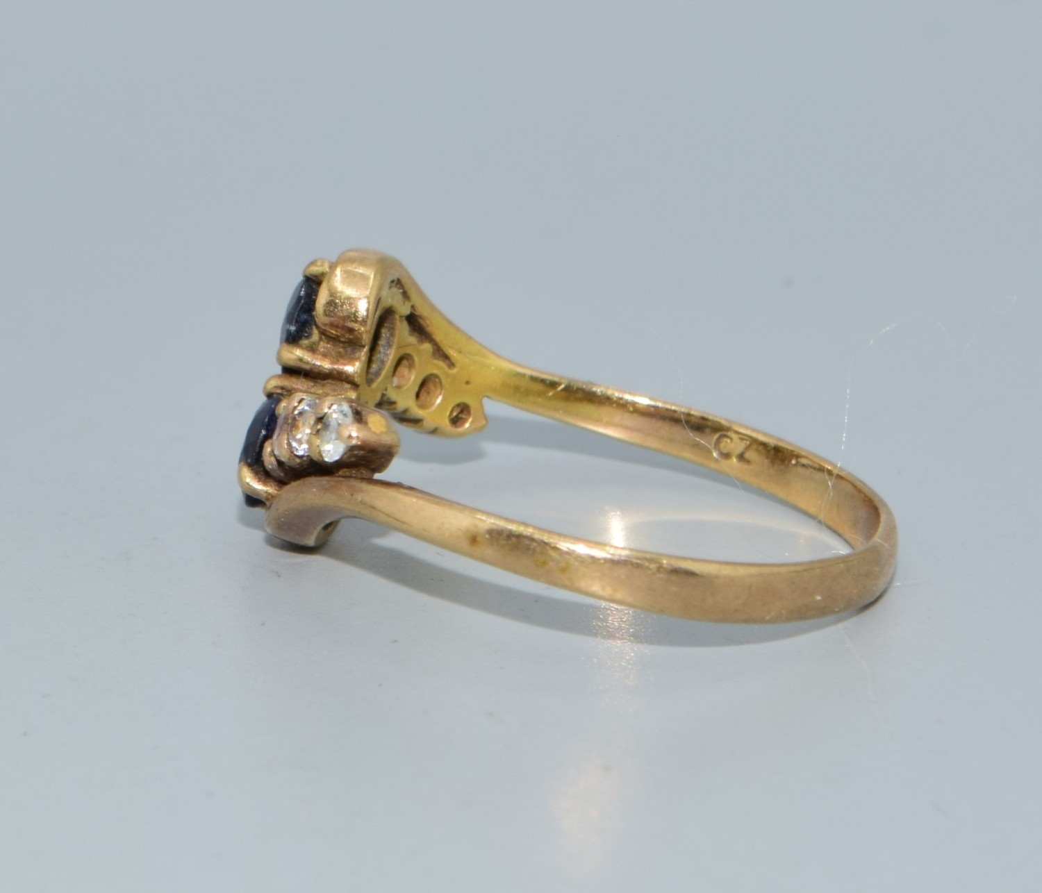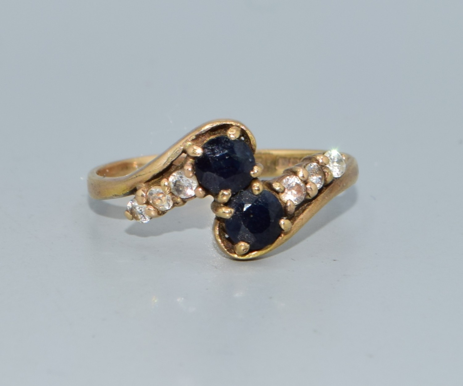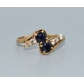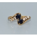 9ct gold ladies twin stone sapphire ring in a twist design with clear stone enhancement size Q 2.4grams