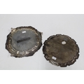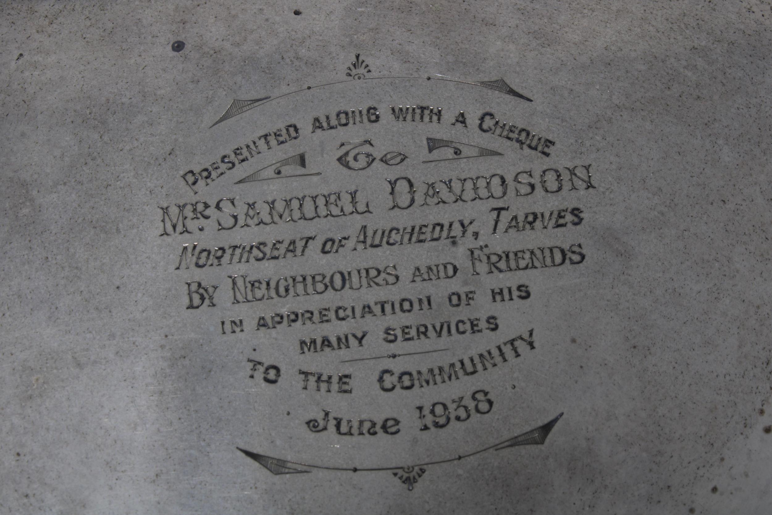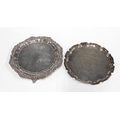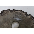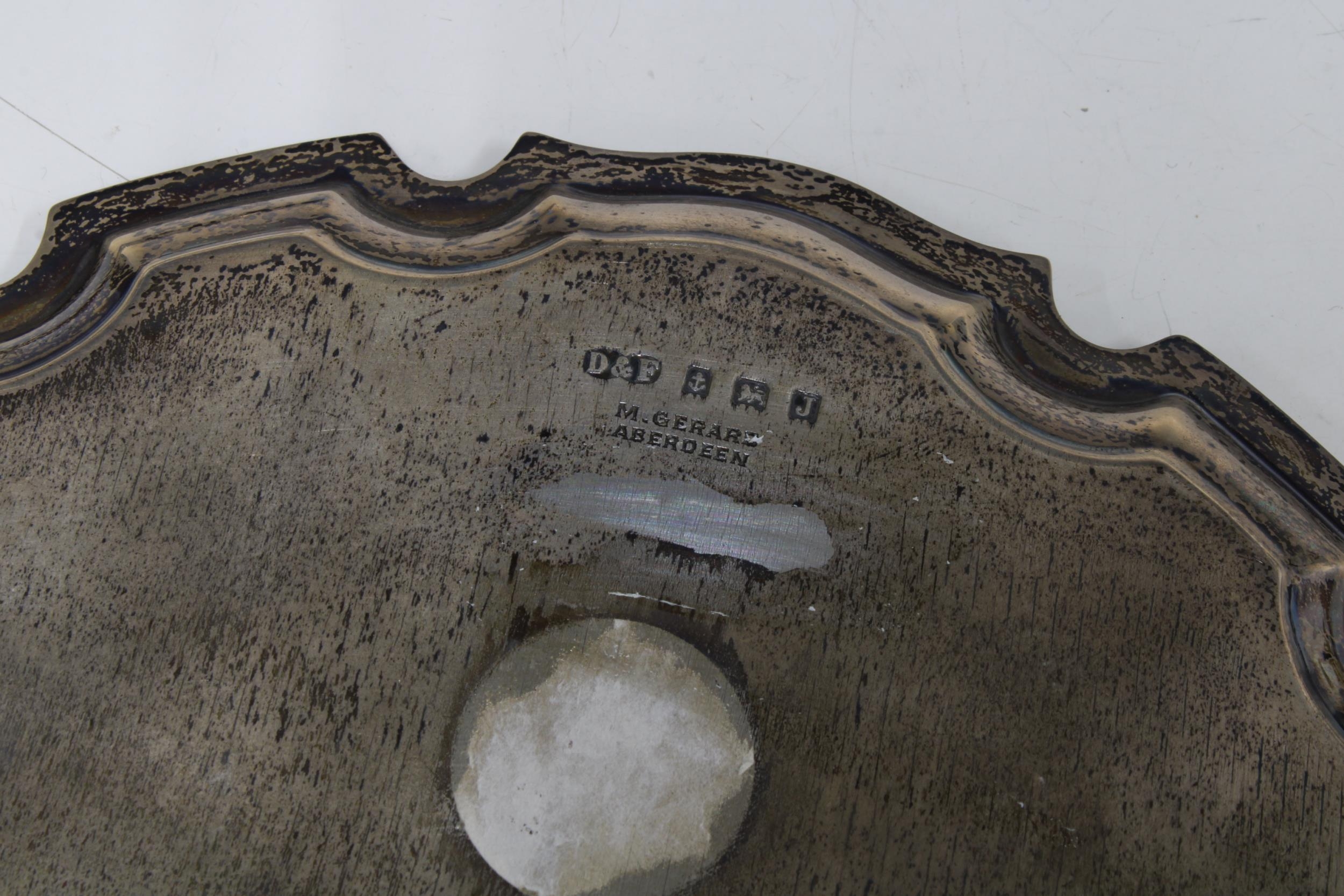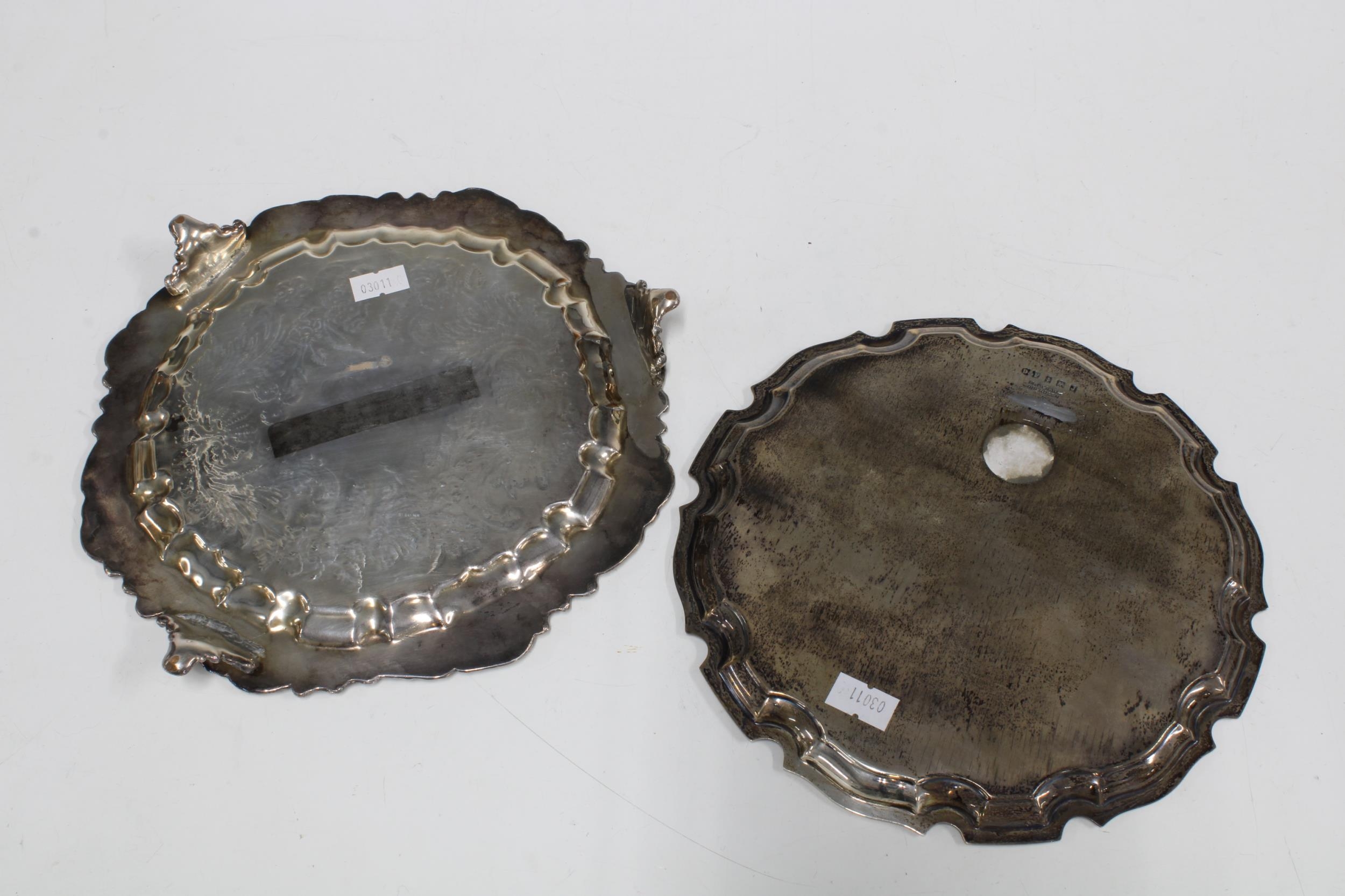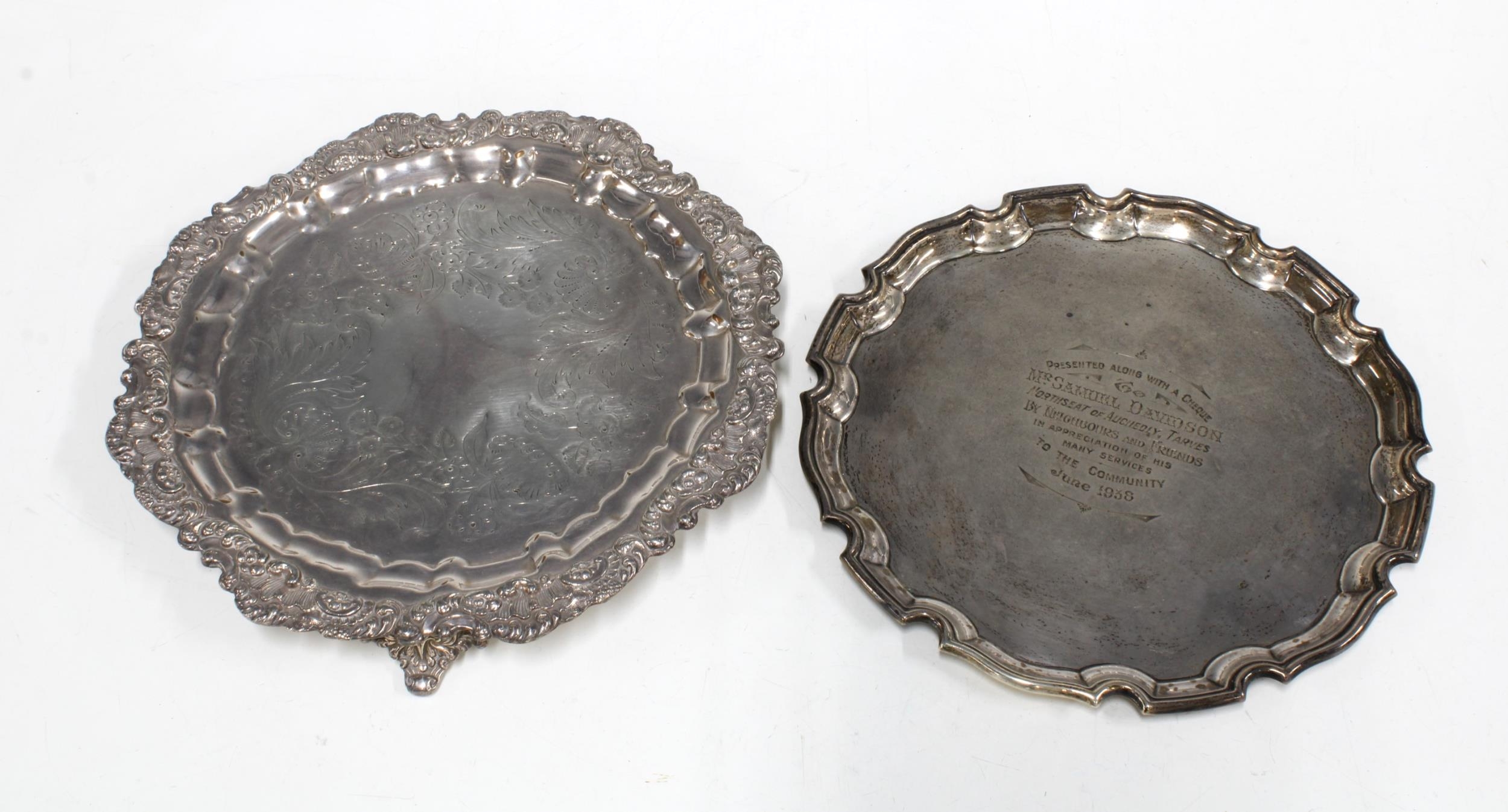 George VI silver card tray, with gadrooned rim and presentation inscription, Birmingham 1938, 20.5cm together with a silver plated salver (2)
