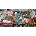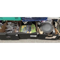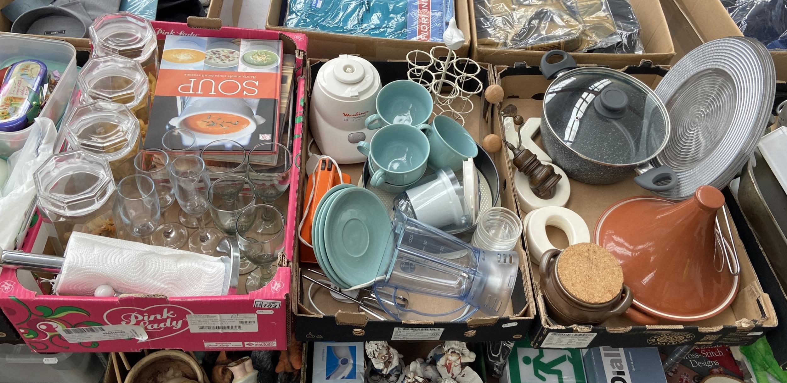3 Boxes containing a pan, blender and cookbooks