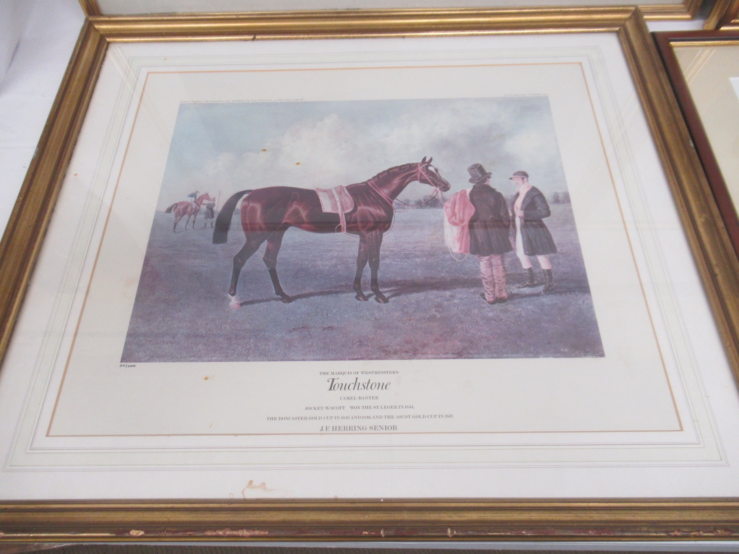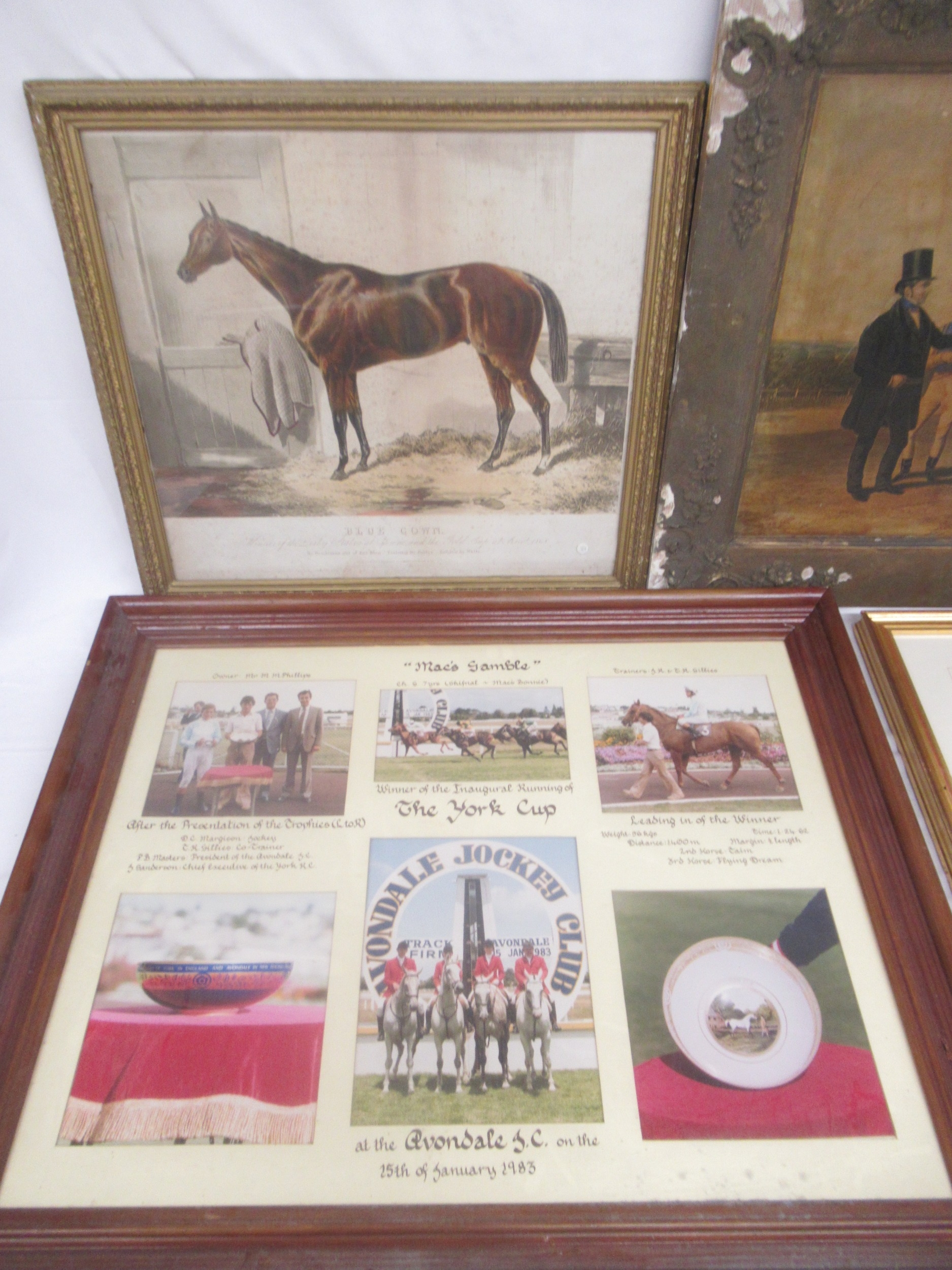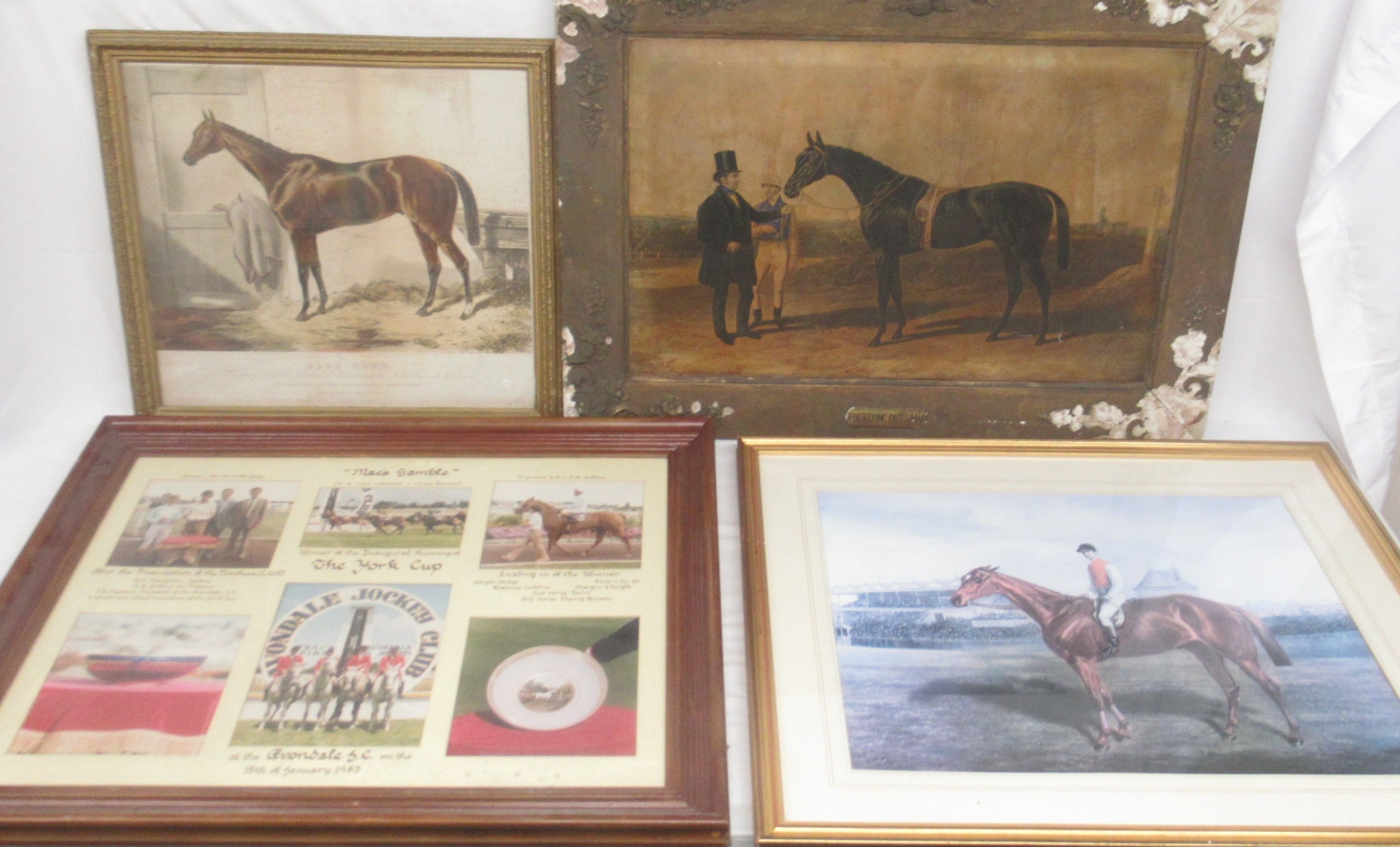 Collection of prints to inc. c19th print of the Flying Dutchman, c19th Print of Blue Gown Winner of the Derby Stakes at Epsom and the Gold Cup at Ascot 1868, 'Macs Gamble' The York Cup, 1983 multi-photograph framed montage, c20th print of a 1883 painting of horse and rider at Newmarket, Print of Gimcrack by Stubbs, c20th print of a panting of horse and jockey by H. Hall, print of Goodwood Cup 1833 Rubini beating Whale and Beiram by J. F. Herring Senior & print of Touchstone by J. F. Herring Senior (8)