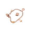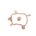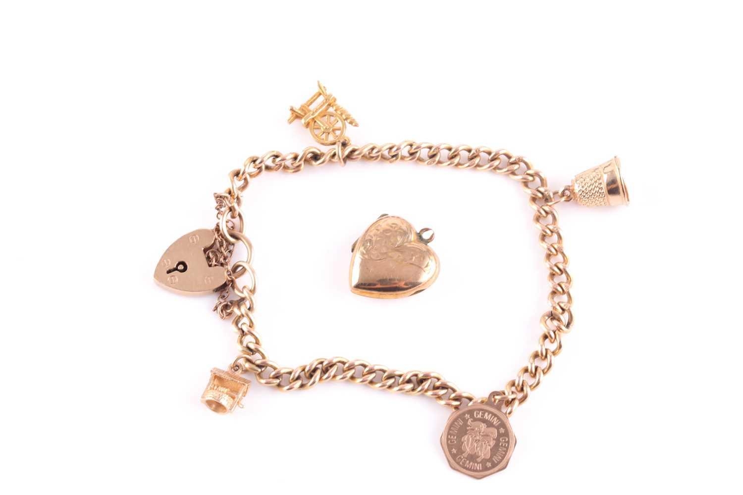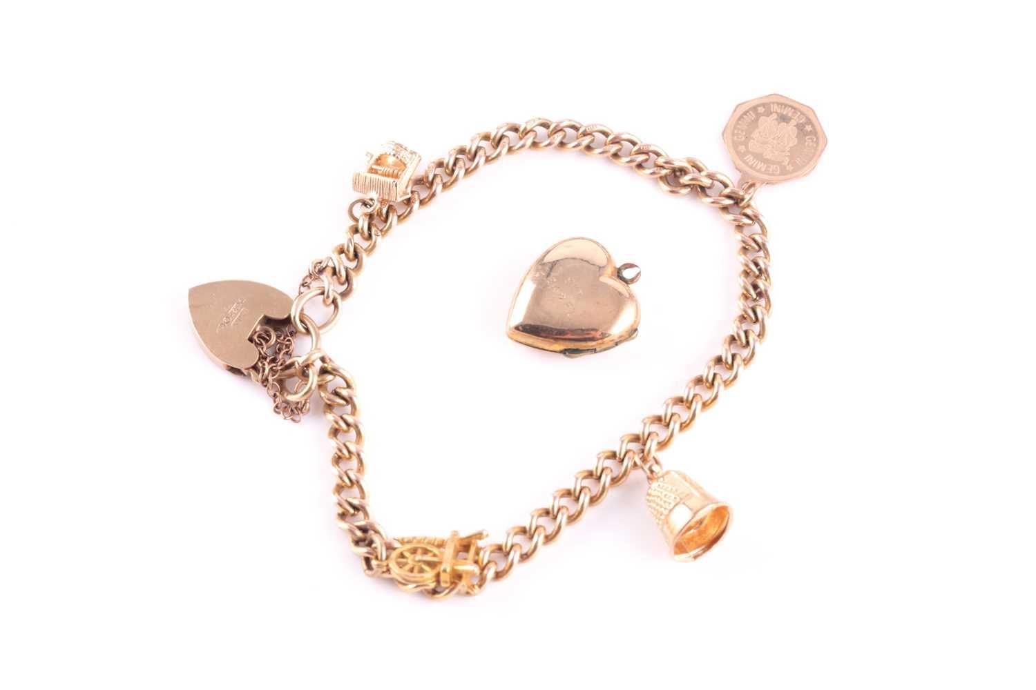 A 9 carat gold curb pattern charm bracelet, with padlock clasp and suspending four charms, together with a gold plated heart-shaped locket.