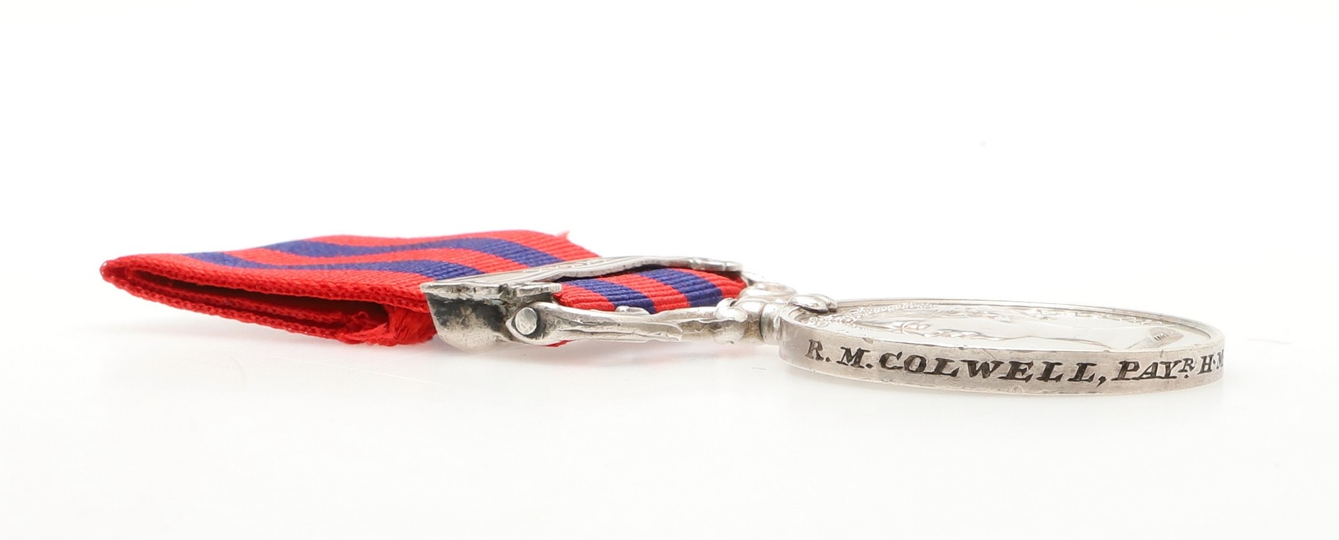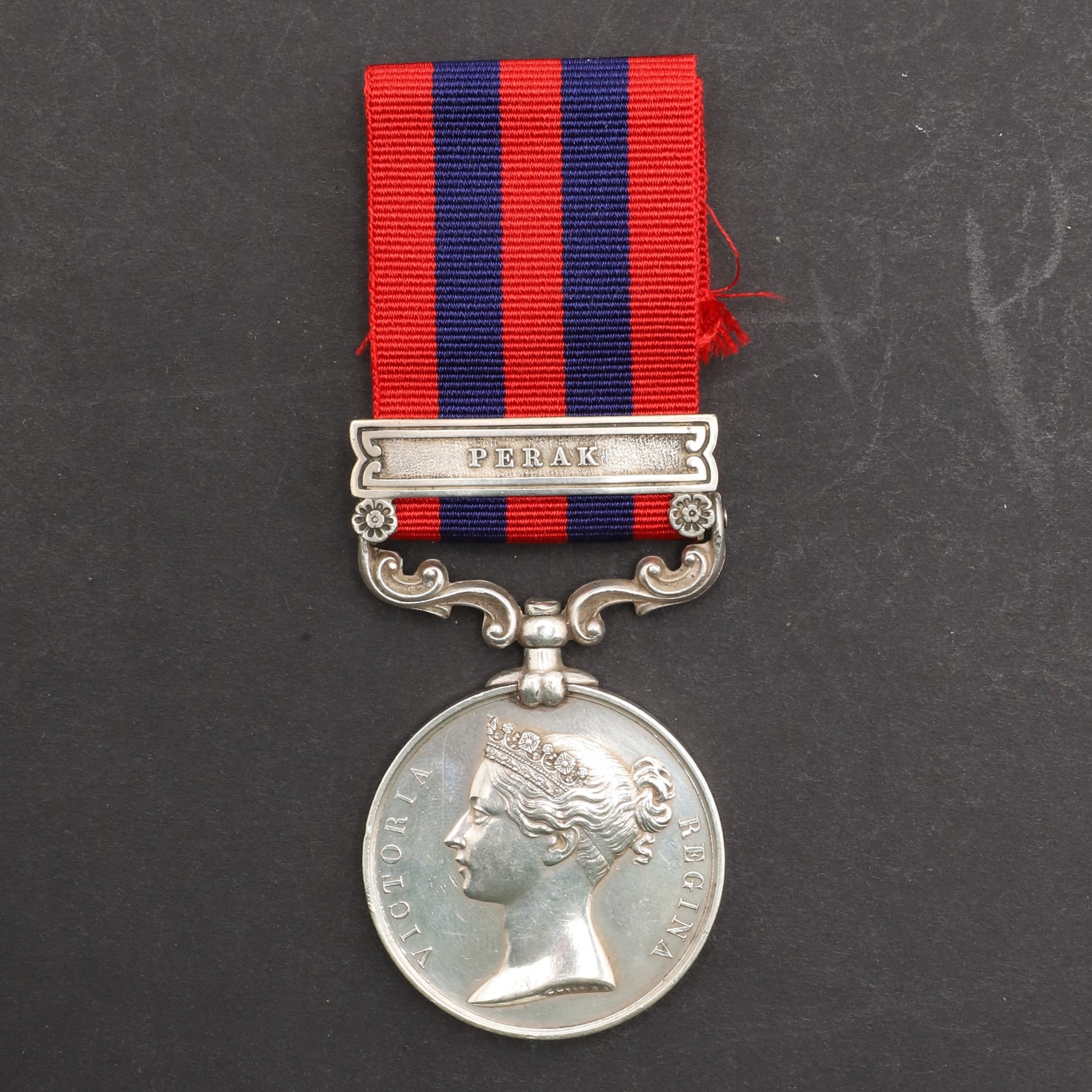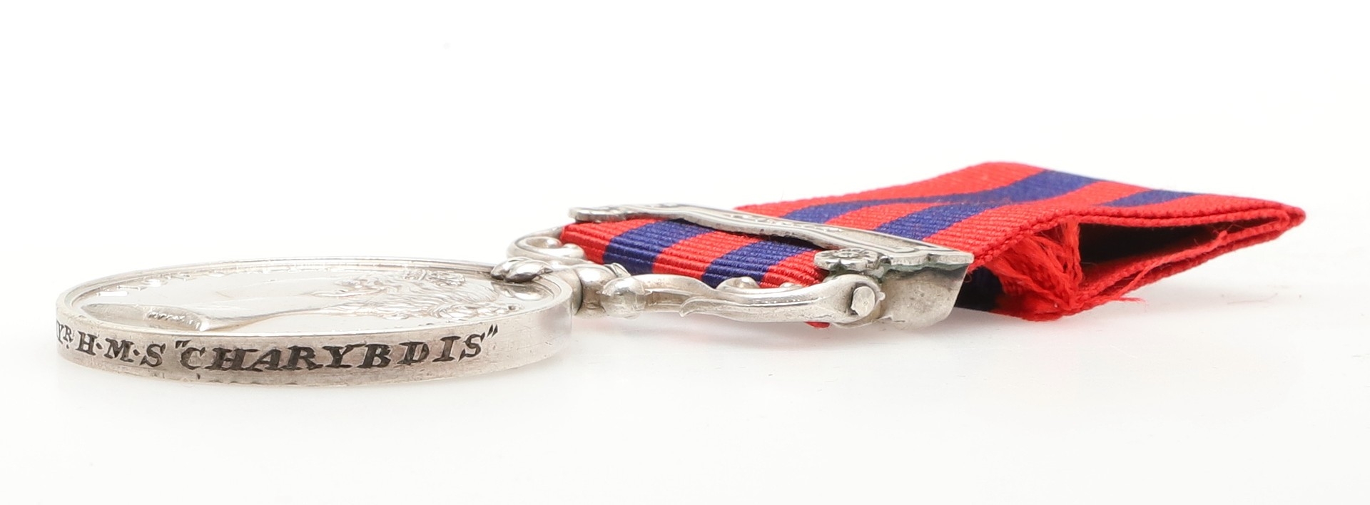 AN INDIAN GENERAL SERVICE MEDAL WITH PERAK CLASP TO H.M.S. CHARYBDIS. An India medal 1849-95 with Perak clasp, named to R.M. Colwell Payr. H.M.S. Charybdis. The crew of the Charybdis, a Pearl class corvette, were eligible for this clasp for their service on the Lingie River between 27th November and 10th December 1874.