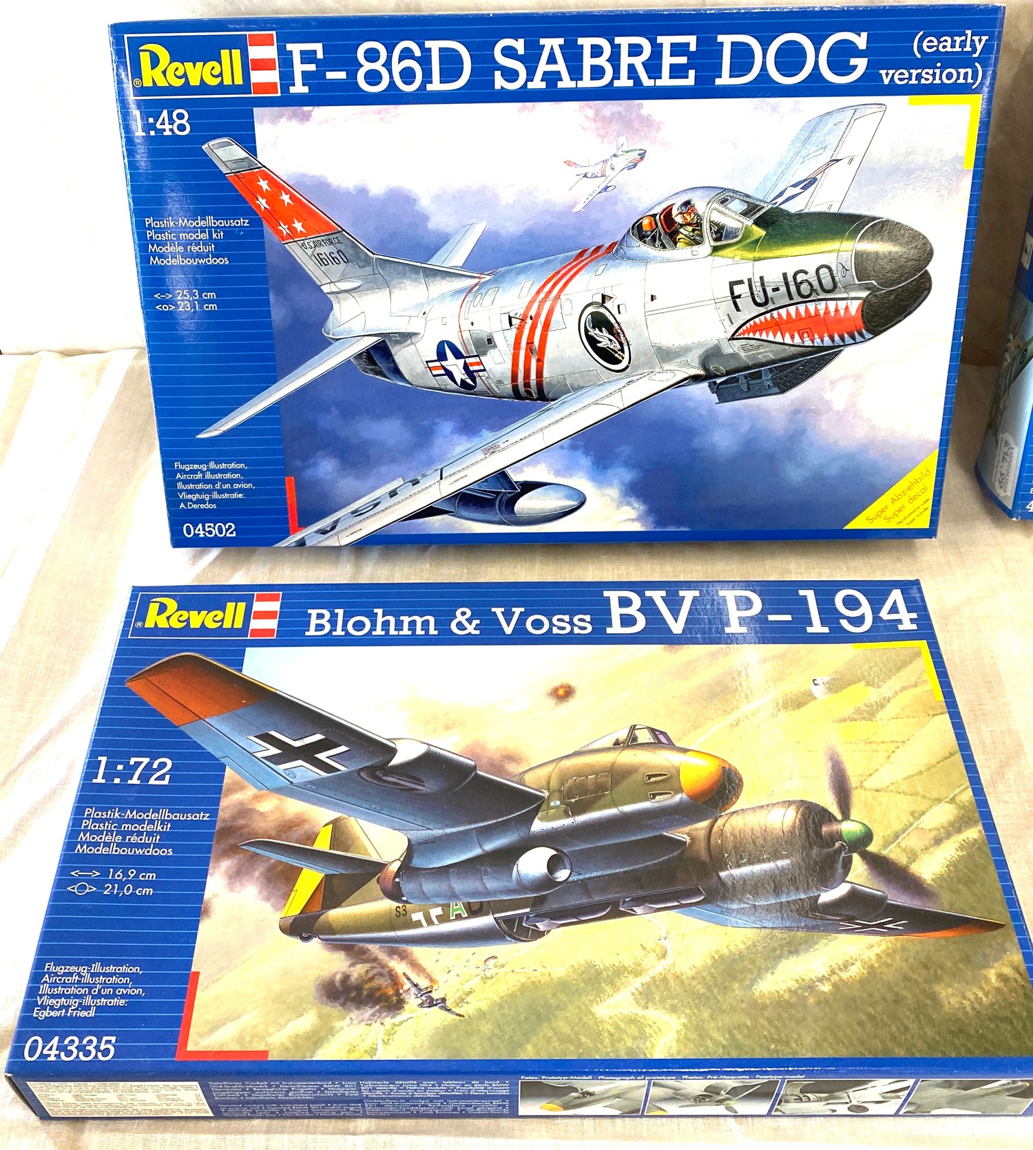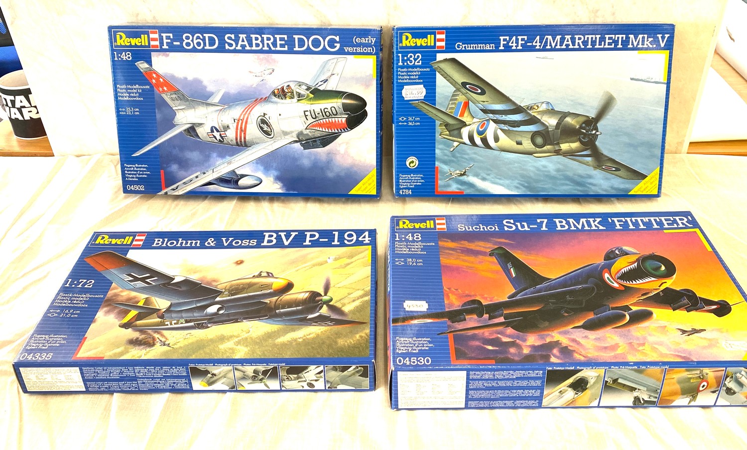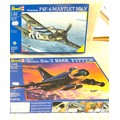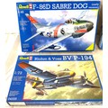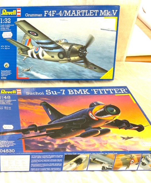 Selection of aircraft models in original boxes, Revell F-86D Sabre Dog, Blohm & Voss BV P-194, Gruman F4F-4 Martlet Mk.V, Suchoi Su-7 BMK fitter