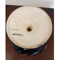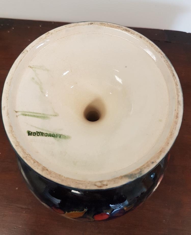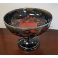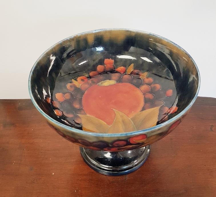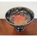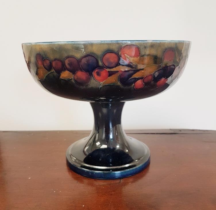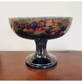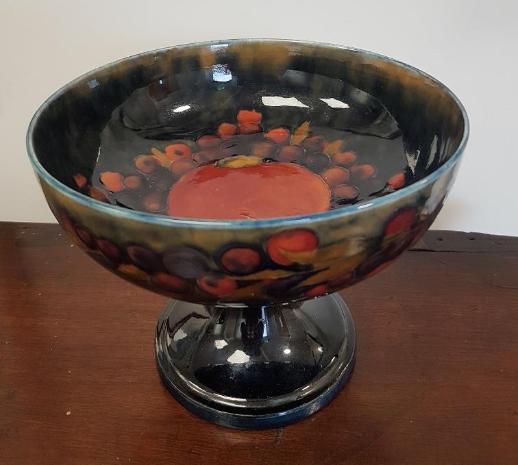 William Moorcroft Pottery Pomegranate Tazza, tubelined and handpainted with stylised fruit and leaves. Green painted signature and impressed Moorcroft Burslem. Size is 15cm high x 19cm diameter.