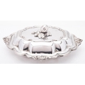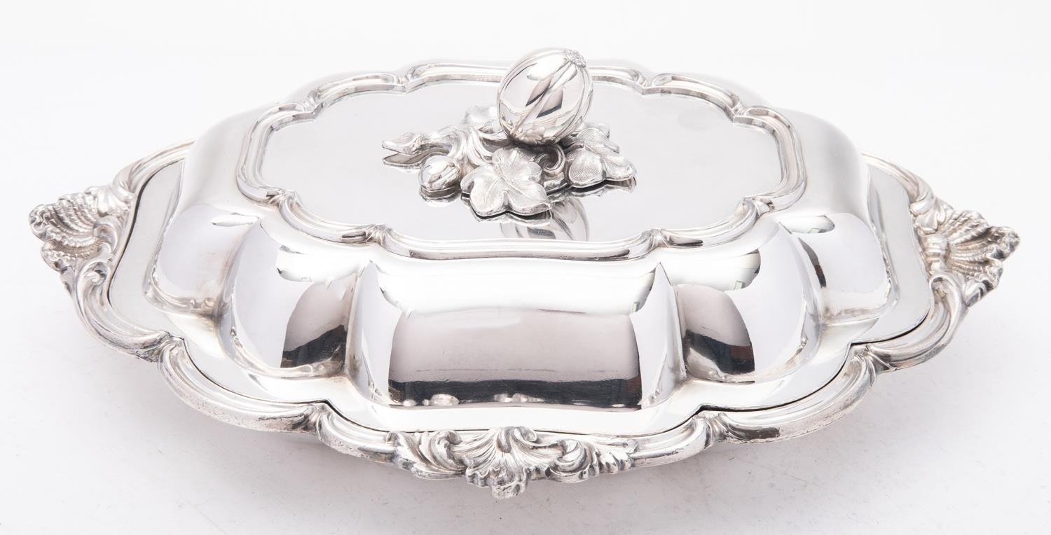 A William IV Sheffield plate entree dish, unmarked, of shaped oval form, detachable pumpkin finial, dome lid, shell handles, 35.5cms. (13.9ins.) long